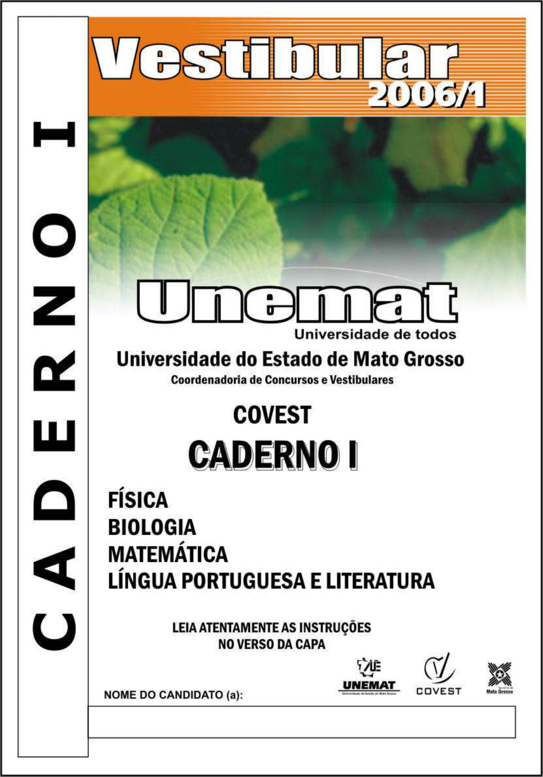 1) Este Caderno contém 50 questões. Caso apresente defeito de impressão ou falta de questão, solicite ao fiscal outro caderno. 2) As questões das Provas possuem 05 (cinco) itens (elencados de a a e), de múltipla escolha que o candidato deverá assinalar apenas uma alternativa como resposta. 3) Verifique se os dados do Cartão de Respostas estão corretos e se este corresponde ao Caderno I. 4) O Cartão de Respostas apresenta uma coluna para cada questão, o candidato deverá pintar completamente o círculo correspondente à alternativa analisada como resposta. 5) O tempo de duração das provas é de 4 (quatro) horas, já incluído o tempo destinado ao preenchimento do Cartão de Respostas. 6) O candidato só poderá deixar a sala 2h após o início das provas. 7) Ao término da prova, entregue o cartão de respostas e este caderno ao fiscal. CRONOGRAMA 23/11/2005 Divulgação, a partir das 8h (horário de Mato Grosso), dos gabaritos oficiais preliminares das provas objetivas do Caderno I, na internet – no site www.unemat.br/vestibular e nos quadros de aviso da UNEMAT. 24 e 25/11/2005 Recebimento de recursos contra os gabaritos oficiais preliminares da prova objetiva do Caderno I nos postos de Inscrições da UNEMAT, e na COVEST. 16/12/2005 Divulgação do resultado do Concurso Vestibular 2006/1, no site www.unemat.br/vestibular e nos quadros de Aviso da UNEMAT. FÍSICA QUESTÃO 01 Uma determinada estação de rádio emite uma onda com uma freqüência de 1200 Khz. Com base neste dado, aponte a alternativa CORRETA. a. O período desta onda é 8,333. 10-6 seg. b. O comprimento dessa onda é de 200 m. c. A freqüência dessa onda, ao passar pelo meio de índice de refração de 1,5 é de 1200 hz. d. A velocidade da onda, ao passar pelo meio de índice de refração de 1,5 é de 2.10 8 m/s. e. O comprimento dessa onda é de 500 m. QUESTÃO 02 Considere a figura abaixo, que representa uma bobina em série com um galvanômetro (G) sensível, e um ímã que pode se aproximar ou afastar da bobina (sem ultrapassá-la), conforme o sentido indicado pelas setas. Nessas condições, pode-se afirmar que: BOBINA ÍMÃ a. ao aproximar a bobina o pólo norte do ímã vai passar pelo circuito uma corrente elétrica i , com sentido contrário ao indicado na figura. b. ao aproximar da bobina o pólo norte do ímã, o galvanômetro (G) não vai indicar a passagem de corrente elétrica. c. se afastar da bobina o pólo norte do ímã, a corrente elétrica i que passa por (G), tem o mesmo sentido indicado na figura. d. o ponteiro de (G) fica oscilando em torno de sua posição central quando afastar o pólo norte do ímã. e. se afastar da bobina o pólo norte do ímã, a sua extremidade, que se encontra mais próxima do ímã, funcionará como pólo sul. QUESTÃO 03 O desenho abaixo representa um sistema dinâmico onde as forças de atrito e a massa do fio que interliga os blocos A e B são desprezíveis. Considerando que a força F vale 500N, e as massas dos blocos A e B valem respectivamente MA=20 kg e MB=15 kg, e que a aceleração da gravidade seja 10 m/s2 e os fios inextensíveis, aponte a alternativa CORRETA. a. A aceleração do sistema é nula. b. A tração no fio é igual ao peso do bloco B. c. A aceleração do sistema é 15 m/s2, e a tração no fio 350N. d. A aceleração do sistema é 10 m/s2, e a tração no fio 350N. e. A aceleração do sistema é 10 m/s2, e a tração no fio 300N. QUESTÃO 04 Nos esquemas abaixo, estão representados os 6(seis) vetores resultantes dos campos elétricos nos pontos X,Y e Z, devido as duas cargas elétricas iguais e de sinais opostos +Q e -Q. E2 E1 E5 Z E 7 X E4 E6 E3 Y Os vetores que melhor representam os campos elétricos resultantes nos ponto X,Y e Z são: a. E1 , E4 , E5 b. E2 , E4 , E7 c. E1 , E3 , E7 d. E2 , E3 , E6 e. E1 , E3 , E5 QUESTÃO 05 Um motociclista percorreu metade de um percurso com velocidade escalar média de 30 Km/h e a outra metade com velocidade escalar média de 50 Km/h. Diante dos dados, pode-se afirmar que a velocidade escalar média do motociclista durante todo o percurso foi de: a. 37,5 Km/h b. 40,5 Km/h c. 30,8 Km/h d. 40 Km/h e. 35 Km/h QUESTÃO 06 Durante uma competição de saltos ornamentais, um nadador pula verticalmente de um trampolim de 15 metros de altura. Adotando g= 10 m/s2 e desprezando a resistência do ar, pode-se afirmar que a velocidade do nadador, ao atingir a água, foi aproximadamente: a. 16,6 m/s b. 17,3 m/s c. 18,6 m/s d. 5 m/s e. n.d.a QUESTÃO 07 I – O calor trocado numa transformação isocórica é totalmente utilizado para variar a energia interna. II – Transformação adiabática é a que se realiza com conservação da quantidade de calor do sistema. III – Em uma transformação adiabática quando ocorre compressão do gás, a temperatura aumenta. IV – A compressão de um gás, feita adiabaticamente, exige que se ceda calor ao gás. Diante das afirmativas acima, assinale a alternativa CORRETA. a. Somente as afirmativas I, II e III são corretas. b. Somente as afirmativas I e II são corretas. c. Somente as afirmativas II e III são corretas. d. As afirmativas I, II, III e IV são corretas. e. Somente as afirmativas I, III e IV são corretas. QUESTÃO 08 A partir do ponto A da figura abaixo, um corpo realiza MHS de amplitude 14 cm e período 8 seg, no intervalo de tempo t =0. Diante destes dados pode- se dizer que a função horária da elongação desse movimento é: a. 7.cos 0,5 pi t b. 14.cos 0,25 pi t c. 1/2.cos 0,5 pi t d. 14.cos 0,80 pi t e. 14.cos 1,25 pi t QUESTÃO 09 Ao medir a temperatura ambiente em uma das regiões mais frias do mundo, num determinado dia um cientista com seu termômetro registrou -78ºF. Se o seu termômetro fosse graduado na escala Celsius, esse registro seria aproximadamente de: a. 35º C b. -75,2º C c. - 61,11º C d. -71,11 ºC e. 69,9º C QUESTÃO 10 I- O fenômeno da difusão da luz é caracterizado pela passagem da luz por uma superfície lisa. II- Quand