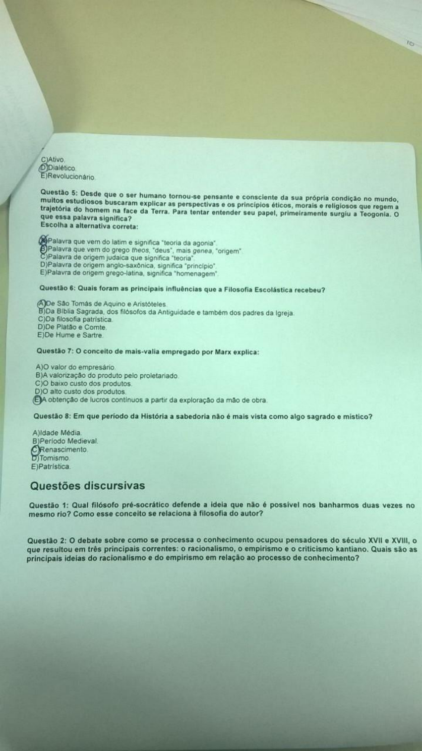 História do Pensamento Filosófico 1º – A pas agem do pensamento mítico para o filosófico foi : Resposta Selecionada : d. Um processo lento e gradual. Respostas a. Um sa lto repe nt ino e rad ica l. b. U m dec reto da c lasse po lít ica. c. Pro mo vida po r re ligio sos reb e ldes. d. U m proc esso le nto e gr ad ua l. e. Fruto de uma re ve lação mít ica. Feedback da resposta : Resposta : d) Um processo lento e gradua l. Comentário : É preciso destacar que a passagem do pensame nto mítico para o filosófico não foi abrupta ; antes, fo i um proce sso lento e gra ua l. Cabe destacar a inda, que as diversas formas de ver o mundo que a filosofia reconhece (o mito, o senso comum, a ciência, a arte e a filosofia), não existem necessariame nte isoladas umas das outras, elas conitinuam coexistindo e m noss a sociedade. Não apenas continuam existindo, todas, mas também há caso s e m que concepções míticas e artísticas, por exemplo, e ncontram- se misturadas. 2º – A re s pe ito da re lação Sóc rate s , Platão e s ofis tas , ide ntifi que a alte rnat iva corre ta: Respos ta Se lec io nada : e. Sócra tes fo i ac usado d e co rro mper a j uve nt ude e de não acred itar nos de uses da c idade. Respos tas : a. Os sofis tas b usca va m a verd ade ac ima de tudo. b. Pla tão e Sócrate s elo gia va m a a t ividade dos so fis tas. c. Sócra te s escreve u d ive rsos livro s e a nota ções a nt es de s ua de sped ida. d. Pla tão e Xe nofonte fo ra m os p r inc ipa is opos itores da s ide ias de Sócr ates. e. Sócra te s fo i ac usado de co rro mper a j uve nt ude e de não acred ita r nos de uses d a c idade. Feedback da respos ta : Respo sta : e) Sócra tes fo i ac usado de corr o mper a j uve nt ude e de não ac red itar nos de uses da c idade. Come ntár io : Sócrate s foi condenado à morte e obrigado a ingerir cicuta, substância mortífer a, sob acusação de corromper a juventude e de não acreditar nos deuses da c idade. 3º – A alegoria da caverna, de Platão, pode ser interpre tada da s eguinte forma: Respos ta Se lec io nada : d. O f ilós ofo é aq ue le que s e libe rta dos gril hõe s e conte mp la o verd ade iro co nhec ime nto. Respos tas : a. As cor re nte s da ignor â nc ia não pode m se r q uebradas. b. O s sofistas, q ue e nga nas se m o s o utro s, de ver ia m se r acor re ntado s no fundo da cave r na, co mo p unição. c. O acorre ntado no fundo da ca ver na é o sáb io q ue q uer fugir dos p ra zere s do mundo. d. O filóso fo é aq ue le q ue se libert a dos gr ilhões e co nte mp la o ve rdade iro conhec ime nto. e. Aq ue le q ue sa i da c a ver na não de ve vo lta r para te nta r liber tar se us e x- co mpa nhe iros. Feedback da respos ta : Respo sta : d) O fi lós ofo é aque le que se libe rta dos g ri lhõe s e conte mpla o ve rda de i ro co nhe ci me nto. Comentário : Para Platão a filos ofia seria o s aber capaz de conduzi r à libertação das amarras das aparências . Por meio da filosofia, pode- se contemplar o conhecimento tal qual ele é, porq ue a filosofia permite fugir do mundo sensíve l – o mundo das aparê ncias 4º – Co mple te a fras e , ind ica ndo a alte rna tiva co rre ta: A f ilos ofia s urg i u qua ndo alguns g re gos , es panta dos co m a re ali da de e ins atis fe itos com as _________ que a tra dição l he s de ra, co me çara m a que s tiona r e bus car re s pos tas , de mo ns tra ndo que o mundo f ís ico e nat ural, os s e res humanos e os aconte cime ntos po de m s e r conhe cidos pe la ___________ . Respos ta Se le io nada : c. Explicações – razão. Respos tas : a. E xp licações – cre nça. b. Q uestõe s – inq uietação. c. E xp licações – ra zão. d. Suspe itas – d e núnc ia. e. Respos tas – fé . 5º – O mito pode ser de finido como: Respos ta Se lec io nada : d. U ma for ma de a tr ib uir s e nt ido ao mundo. Respos tas : a. C onj unto de es tór ia s desco ne xa s. b. Fant as ia s cr iadas por uma me nte per t urbada e se m q ua lq uer re lação co m a r ea lidade. c. C onhec ime nto ob jet ivo e c ie nt ífico. d. U ma fo r ma de atr ib uir se nt ido ao mundo. e. Fi los ofia prod uzida pe lo s pré -s ocráticos para ed uca r a pop ula ção. Feedback da respos ta : Respo sta : d) Uma forma de atrib uir sen ido ao mundo. Come ntár io : E mbo ra seja um t ipo de co nhec ime nto não r igoroso e não s ub me t ido à contesta ção, o mito não de ve ser visto pe jora t iva me nte, mas co mo uma forma tipicamente humana de tentar dar sentido à vida, tendo sido, aliás, a primeira delas. 6º – Ao t rabalhar, podemos dize r que o Homem : Respos ta Se lec io nada : c. Está fa ze ndo a lgo q ue é e xc lus iva me nte huma no. Respos tas : a. Es tá fa ze ndo co mo todo s os de ma is s eres vivos da na t ure za. b. Est á de ixa ndo de lado se us ins t intos b io ló gicos p ara viver de aco rdo co m as no r ma s soc ia is. c. Es tá fa ze ndo a lgo q ue é e xc lus iva me nte huma no. d. Est á desperd iça ndo se u te mpo e se u pote nc ia l cr ia t ivo. e. Es tá tr a ns for ma ndo a r ea lidade para se adeq uar a e la. Feedback da respos ta : Respo sta : c) Est á fa ze ndo a lgo q ue é e xc lus iva me nte huma no. Come ntár io : O trabalho é a ação de transformar a natureza de modo intencional. Sendo assim, apenas o homem trabalha, pois é a única e spécie que transforma a natureza de modo intencional. 7º -Sobre a alegoria da caverna, assinale a alternativa corre ta: Resposta Selecionada : c. Descreve uma espécie de morada subterrânea com homens acorrentados em seu interior que con emplam sombras projetadas. Respos tas : a. Fo i esc r ita por Sóc ra te s enqua nto esta va na pr isão. b. Tra ta- se de um “mito ” cr iado por Platão , po r isso não te m va lo r f ilos ófico. c. Descr e ve uma e spéc ie de morada s ubte rrâ nea co m ho me ns acorre ntados e m se u inter ior q ue co nte mp la m so mbra s pro jetadas . d. As so mb ras não são rea is, s