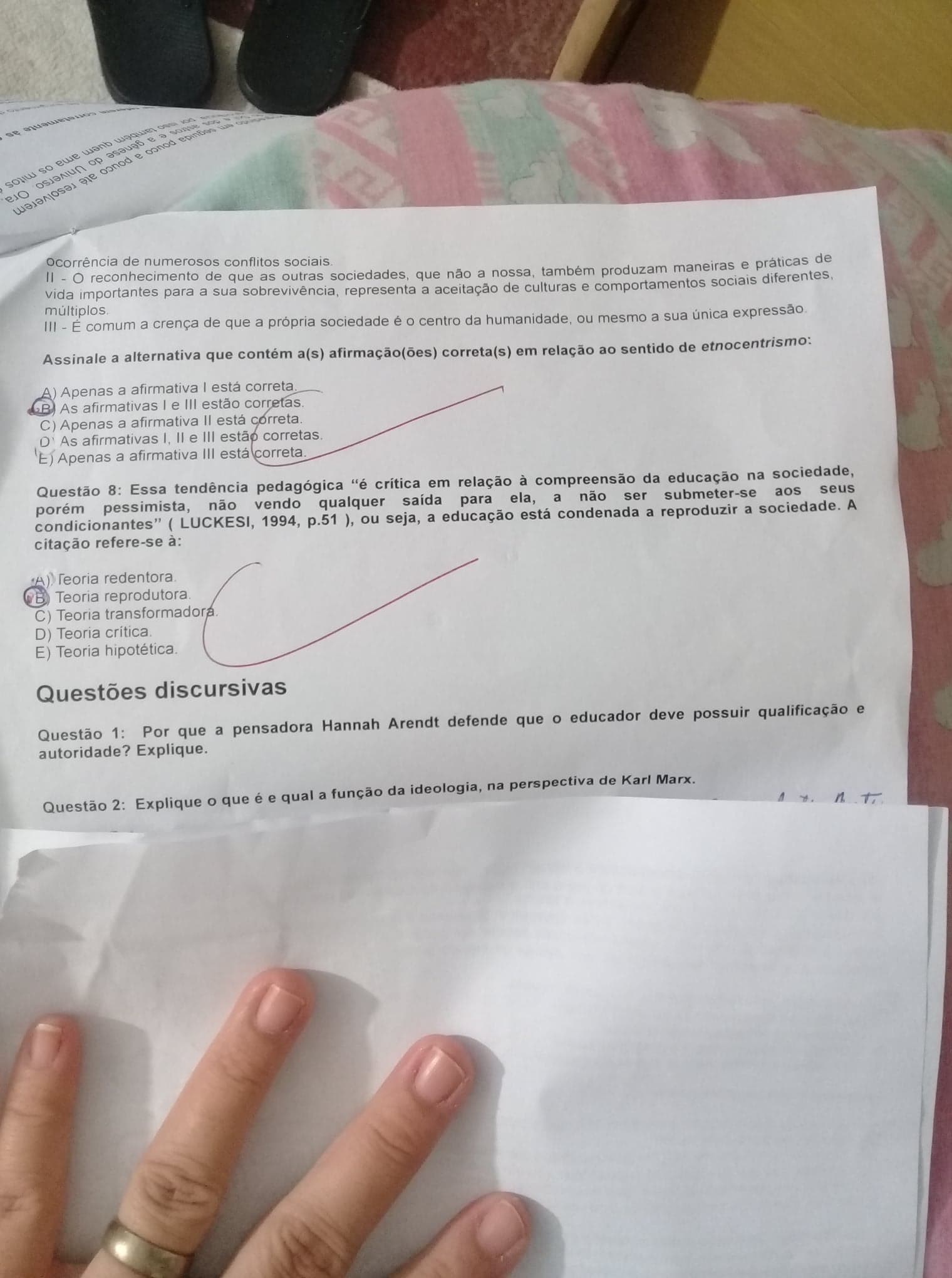 Ocorrencia de numerosos conflitos sociais II - reconhecimento de que as outras sociedades, que nao a nossa, tambem produzam maneiras e praticas diferentes, de vida importantes para a sua sobrevivencia representa a aceitacao de culturas e comportamentos sociais multiplos III - E comum a crenca de que a propria sociedade e centro da humanidade ou mesmo a sua unica expressao. Assinale a alternativa que contem a(s) afirmacao(o) correta(s) em relacao ao sentido de etnocentrismo: A) Apenas a afirmativa I esta correta. B) As afirmativas II e III estao corretas. C) Apenas a afirmativa II esta correta. D) As afirmativas I e III estao corretas. E) Apenas a afirmativa III esta correta.