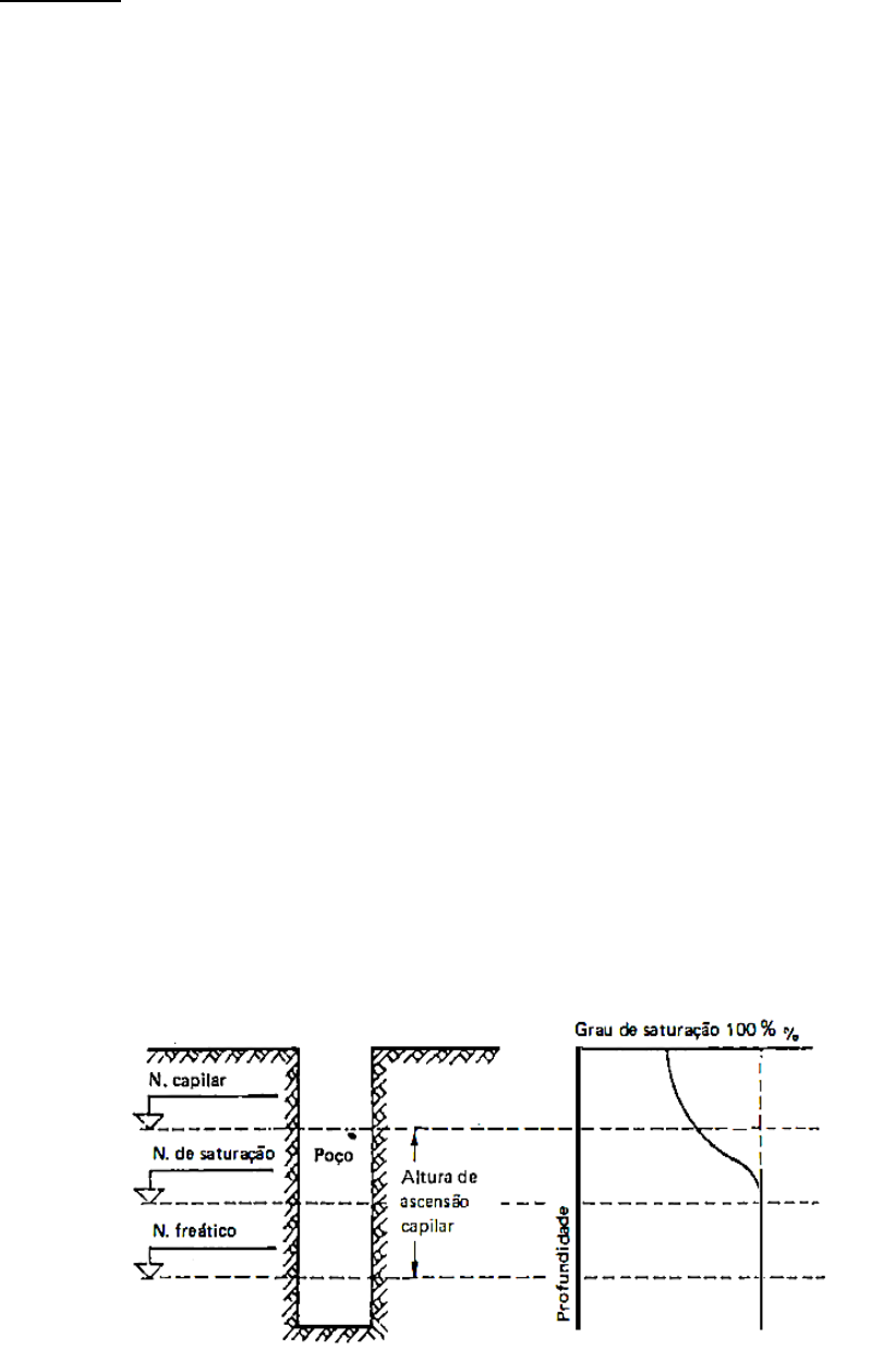 Complementos de Mecânica dos Solos e Fundações – Material de Apoio 2 Capilaridade: O que é o fenômeno da capilaridade? A água capilar nos solos Meniscos capilares independentes do nível de água Capilarímetros Importância dos fenômenos capilares 1. O QUE É O FENÔMENO DA CAPILARIDADE? Conforme vimos anteriormente, a água nos vazios dos solos se comporta de formas diferentes, podendo ser classificada como água adsorvida (ou adesiva), água de constituição, água livre, água higroscópica e água capilar. Nesta aula, trataremos das águas capilares nos interstícios das partículas sólidas de um solo. Entende-se por FENÔMENO DE CAPILARIDADE a propriedade que os líquidos possuem de se elevarem acima do nível onde há a pressão atmosférica, por meio de capilares (tubos de pequenos diâmetros). No caso dos solos, têm-se como capilares os espaços vazios entre as partículas sólidas dos solos, que se interconectam uns com os outros e com o lençol freático por onde corre a água livre dos solos. Portanto, o fenômeno da capilaridade nos solos é a capacidade apresentada pela água contida nos vazios deste solo de se elevar acima do nível do lençol freático. Esse fenômeno da capilaridade é importante porque a água capilar é responsável pela saturação do solo acima do nível do lençol freático, pela coesão aparente das areias úmidas e pela contração das argilas. É interessante se verificar, entretanto, que tipicamente o fenômeno da capilaridade não satura toda a coluna do solo até o nível atingido pela água capilar. Se observarmos o esquema abaixo, percebemos que após o nível freático, a água capilar satura todos os vazios do solo até um determinado nível, denominado NÍVEL DE SATURAÇÃO. Após este nível, a água capilar não é suficiente para preencher todos os vazios do solo. Perfil do comportamento capilar da água no solo. Retirada de Caputo (2000). A B A água possui um comportamento diferenciado em sua superfície que fica em contato com o ar, devido à orientação de suas moléculas. Esse comportamento é diferente no interior do corpo de água, onde as moléculas de água estão envolvidas por outras moléculas de água em todas as direções: Representação do comportamento das moléculas de água na superfície e no inteiror do corpo de água. Modificada de Pinto (2006). A tensão superficial que surge devido a essa interação molecular da água com o ar pode ser associada a uma tensão de membrana, pois seus efeitos são semelhantes. Quando a água (ou outro líquido) fica em contato com um corpo sólido, as forças químicas de adesão fazem com que a água fique com uma superfície curva. Essa curvatura apresentada pela superfície livre da água depende do tipo de material sólido com o qual ela está interagindo, e com seu grau de limpeza. Para um vidro limpo, por exemplo, esse grau de curvatura é quase nulo (como o representado na imagem (A) abaixo). Quando essa curvatura existe (como o representado na imagem (B) abaixo), significa que há uma diferença de pressão atuando nos dois lados da superfície da água que está em contato com o ar. Essa diferença de tensão interna e externa na coluna de água é equilibrada pela resultante da tensão superficial. Quanto maior for a curvatura da água, maior será a diferença entre as pressões interna e externa. Essa diferença de pressão pode ser calculada caso se conheçam a geometria da água e a sua tensão superficial. Imagem representativa das tensões superficiais da água com o ar modificada de Pinto (2006) O comportamento da água capilar nos solos pode ser analisado então ao se considerar a Teoria do Tubo Capilar, que diz que quando um tubo é colocado em contato com a superfície livre da água, a água subirá pelo tubo até atingir uma posição de equilíbrio. Essa subida da água resulta do contato entre ela, o vidro do tubo e o ar; e da tensão superficial apresentada pela água em contato com o ar. Caso o vidro esteja limpo, a superfície da coluna de água que subiu por ele apresentará curvatura nula. Caso contrário, a curvatura apresentada pela água em um tubo cilíndrico será esférica e interceptará as paredes do tubo com um ângulo que irá depender das propriedades do material do qual o tubo for feito. A altura que a água atingirá dentro do tubo capilar é aquela na qual o seu peso dentro do tubo se iguale à força resultante da tensão superficial que a mantém na posição acima do nível da água. Ou seja, será a posição na qual as pressões que impulsionam a água para cima se igualem àquelas que a forçam para baixo: Representação esquemática do comportamento da água no tubo capilar. Retirada de Pinto (2006) Se considerarmos um tubo com raio r, no qual a água com peso específico (ɣw) subiu a uma altura hc , podemos calcular o peso da água (P) como sendo igual ao volume de seu corpo (o volume do tubo que, se for cilíndrico, é igual a πr2hc multiplicado pelo seu peso específico (veja aula de índices físicos dos solos): 𝑃 = π . 𝑟2. ℎ𝑐 . ɣ𝑤 Se considerarmos uma tensão superficial T que atua sobre toda a superfície de contato entre a água e o tubo, então a força resultante F dessa tensão será igual ao cumprimento da circunferência formada pela superfície da água multiplicada pela tensão: 𝐹 = 2 . π . 𝑟 . 𝑇 A altura capilar da água, então, será o ponto no qual P = F. Quando igualamos as duas equações, temos: π . 𝑟2. ℎ𝑐 . ɣ𝑤 = 2. 𝜋. 𝑟. 𝑇 De onde, isolando-se hc: 𝒉𝒄 = 𝟐 . 𝐓 𝐫. ɣ𝒘 = 𝟒 . 𝐓 𝐝. ɣ𝒘 Onde: T = tensão superficial da água por unidade de linha de contato com o tubo; r = raio do tubo; ɣw = peso específico da água e d = diâmetro do tubo. Pela fórmula, conhecida como Lei de Jurin (para uma situação de ascensão máxima, quando o equilíbrio é atingido), pode-se deduzir que a altura capilar da água é inversamente pr