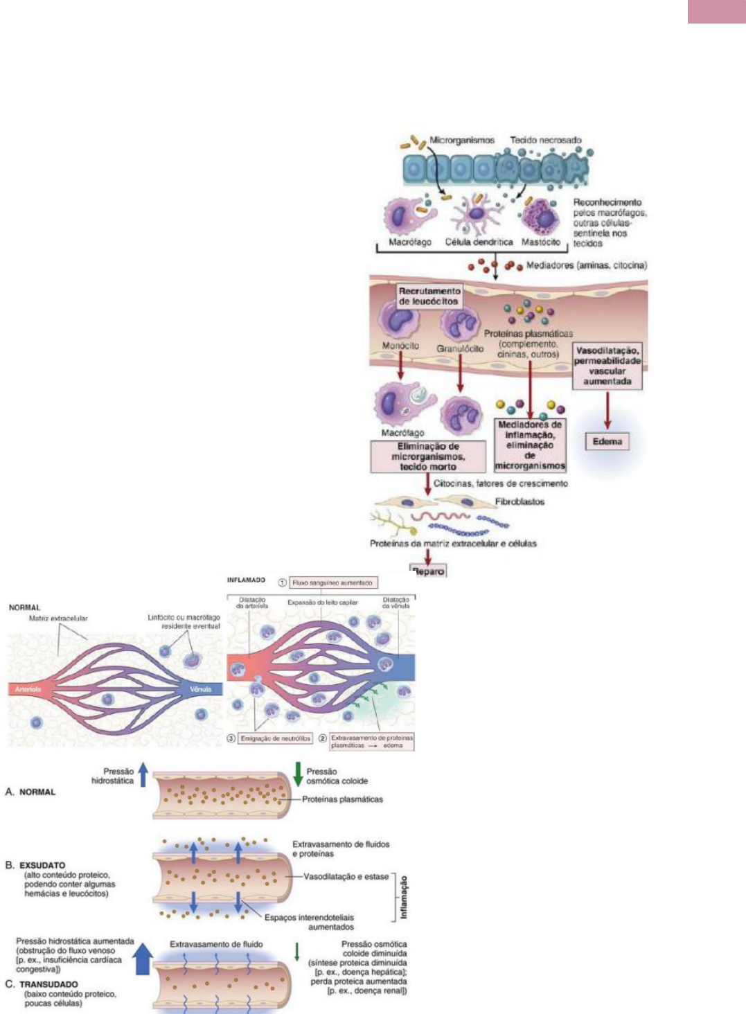 1 Ana Paula Backes ATM 2023/2 – UNISC Patologia I Inflamação e Reparo • A resposta dos tecidos, quando lesados, se baseia em recrutamento de células e moléculas reparadoras da circulação para os locais onde são necessários; • Reação em etapas: → Agente agressor é reconhecido pelas células e moléculas do hospedeiro; → Leucócitos e proteínas são recrutados para o local da lesão; → Ambos são ativados e trabalham concomitantemente para destruir e eliminar o invasor; → Reação controlada e concluída; → Tecido é reparado; • Os vasos sanguíneos extravasam leucócitos e fluidos, que acabam se acumulando, pros tecidos extravasculares; • Sinais Cardinais de Inflamação: rubor, tumor (edema) e migração de leucócitos; • Inflamação Aguda: → Célula Característica: Neutrófilos (depois de, aproximadamente, 36- 72 horas, morre por apoptose); → Principais Estímulos: microrganismos e necrose; → Rápida e de curta duração; em média 3 dias; Alteração do calibre vascular (microcirculação); × Alteração no fluxo sanguíneo e da permeabilidade dos vasos → maximização da saída de proteínas e leucócitos, em direção ao local da lesão; Exsudação: saída de substancias do sistema vascular para o interstício; Transudato: fluido com baixo conteúdo proteico, pouco material celular. Resulta de desequilíbrio osmótico ao longo da parede do vaso; Edema: excesso de fluido no interstício; 2 Ana Paula Backes ATM 2023/2 – UNISC Pus: exsudato purulento; → Geralmente evolui para um processo crônico; → Independente da etiologia, a sequência de eventos é a mesma: eventos vasculares → eventos celulares; → Mesmo quando localizada, tem associação com reações induzidas por citocinas: febre, proteínas de fase aguda, leucocitose, outros e sepse; → Mediadores Inflamatórios: maioria tem meia vida curta, sendo “convocados” a partir de diversos estímulos como a cascata inflamatória, substâncias bacterianas, produtos microbianos, etc; Prostaglandinas: produzidas pelos mastócitos, macrófagos, células endoteliais e muitos outros tipos celulares; Leucotrienos: produzidos por leucócitos e mastócitos através da ação da lipoxigenase, e são envolvidos nas reações vasculares e do músculo liso, bem como no recrutamento de leucócitos; Lipoxinas: geradas a partir dos AA através da vida de lipoxigenase. Suprimem a inflamação ao inibir o recrutamento de Leucócitos; Citocinas: produzidas r linfócitos, células dendríticas e macrófagos ativados, células endoteliais, epiteliais e do tecido conjuntivo que medeiam e regulam reações imunológicas inflamáveis; × TNF e II-1: promovem a adesão de Leucócitos no endotélio, além de sua migração através dos vasos. Contribuem para a Ativação endotelial – aumento de expressão de moléculas, produção de mediadores, FC e eucosanóides. Ativação de Leucócitos e demais células: ativa fibroblastos, respostas de neutrófilos, induz a inflamação aguda. Resposta sistêmica da fase aguda; Quimioinas: agem como quimio atraentes para leucócitos específicos. Quimiocinas Inflamatórias: produção é induzida por microrganismos e por estímulos – estimulam os Leucócitos a ligarem-se no endotélio. Manutenção da arquitetura dos tecidos – quimiocinas homeostáticas – organizam vários tipos celulares; 3 Ana Paula Backes ATM 2023/2 – UNISC → Estímulos: Infecções: bacteriana, viral, microbiana, fúngica ou parasitária; Necrose: propicia a inflamação, isquemia, trauma e lesões físicas, queimaduras/congelamento, irradiação a substâncias; Corpos estranhos: farpas, sujeira ou suturas; Reações imunes: causa dano no próprio individuo; Traumas; Agentes químicos e físicos; → Mecanismos de Extravasamento: Formação de fendas no endotélio da vênula; → vasodilatação (histamina) → vermelhidão e calor; Lesão endotelial direta; Extravasamento retardado prolongado e dos vasos recém-formados; Transcitose (exo e endocitose juntas); 4 Ana Paula Backes ATM 2023/2 – UNISC Diminuição do fluxo sanguíneo e aumento da viscosidade do sangue. Resultam na obstrução dos pequenos vasos com hemácias se movimentando lentamente; Leucócitos sanguíneos (Neutrófilos) se acumulam no endotélio vascular. Essas células migram através da parede vascular para dentro do tecido intersticial; Contração das células endoteliais resulta no aumento dos espaços interendoteliais (iniciado por histamina, leucotrienos, ...); → resposta transitória imediata; Lesão endotelial – necrose. Queimaduras. Neutrófilos aderem ao endotélio podem lesar as células endoteliais e amplificar a reação. Dura até os vasos serem trombosados ou reparados; → Alterações Celulares: Mudanças na permeabilidade e no fluxo sanguíneo acarretam no influxo de leucócitos, afim de eliminar os agentes agressores, encaminhados aos locais de necessidade; Esses leucócitos são ativados para desempenharem suas funções de defesa (ingerem, destróem, eliminam ou prolongam); Etapas do extravasamento: × Marginação; × Rolamento; × Adesão ao endotélio (pavimentação); × Transmigração ou diapedese; × Migração nos tecidos intersticiais; Adesão Leucocitária: × Regulação através da ligação com moléculas de adesão complementares; × Mediadores químicos: quimiotoxinase citicinas; × Expressão e avidez das moléculas de adesão; × Receptores de adesão: Selectinas, imunoglobulinas, integrinas, glicoproteínas semelhantes à mucina; 5 Ana Paula Backes ATM 2023/2 – UNISC Transmigração: × Ação das quimiocinas em direção do gradiente quimiotático; × Ocorre predominantemente nas vênulas; × Ação da membrana basal: produção de colagenases; × Adesão na matriz extracelular; Quimiotaxia: × Locomoção ao longo de um gradiente químico: Agentes exógenos; Produtos bacterianos; × Sistema complemento (C5a); × Via da lipoxigenase (leucotrieno B4); × Citocinas (i