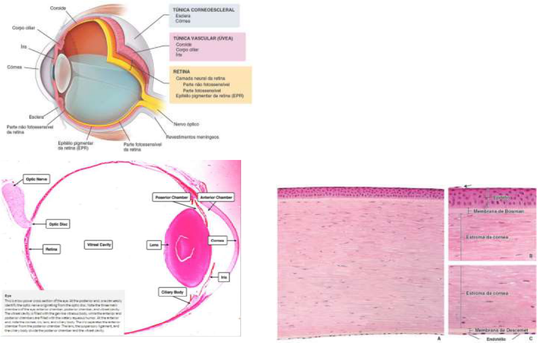 Sistema Fotorreceptor e Audiorreceptor SISTEMA FOTORRECEPTOR Introdução *Globo ocular: órgão sensitivo responsável pela visão: impulsos processos na retina, análise e interpretação desses impulsos pelo SNC. *Cavidade orbital óssea: suspenso pelos músculos extrínsecos, muito tecido adiposo *Córnea e cristalino: capturam a luz e focalizam-na automaticamente *Iris; ajuste automático as diferenças na iluminação *Células fotorreceptoras (retina): detectam a intensidade de luz, cor e codificam impulsos elétricos – nervo optico. Camadas do olho *corpo ciliar: produção do humor aquoso *esclera: tec. Conjuntivo denso modelado *melanina: absorção de luz – epitélio pigmentar da retina que contem melanina Túnica corneoescleral: Esclera - Opaca e esbranquiçada; Tecido conjuntivo denso modelado rico em fibras colágenas e fibroblastos; Redes de fibras elásticas e substância fundamental; - Capsula de tenon: escrela- episclera (tec.conjuntivo frouxo) – capsula de tenon – tecido adiposo. Graças a essa disposição, o globo ocular pode sofrer movimentos de rotação em todas as direções. Córnea -Epitélio anterior ou epitélio da córnea: estratificado pavimentoso não queratinizado; desmossomos e microvilosidades (na última camada); terminações nervosas livres – sensibilidade tátil; constantemente renovado. -Membrana de Bowman: fibras colágenas em diversas direções; contribui para reforçar a estrutura da córnea. -Estroma: maior parte da córnea; lamelas de fibras colágenas dão propriedade transparente (camadas perpendiculares alternadas); fibroblastos/ avascular; -Membrana de Descemet: membrana basal do endotélio; - Epitélio posterior ou endotélio: simples pavimentoso; participa da nutrição e absorção do humor aquoso. LIMBO (transição esclerocorneal): Zona de transição da córnea para esclera; FUNÇÃO DE NUTRIÇÃO; Colágeno da córnea torna-se fibroso e opaco; Muito vascularizado: nutrição da córnea; Sistema Fotorreceptor e Audiorreceptor -Células-tronco límbicas: epitélio da córnea; células responsáveis por fazer a renovação das células epiteliais da córnea e esclera. - CANAIS DE SCHELEMM (Seio venoso da esclera): no estroma da transição esclerocorneal (limbo), nesse canal o humor aquoso produzido nos processos ciliares do corpo ciliar é drenado para o sistema venoso. Isso é possível em razão de um sistema de espaços em labirinto, os espaços de Fontana, que vão do endotélio da córnea ao canal de Schlemm. O epitélio corneano, nessa região, transforma-se gradualmente no epitélio da conjuntiva. Túnica vascular Coroide -TCF: rico em vasos sanguíneos, fibras colágenas/elásticas, melanócitos, fibroblastos; -Tem capilares fenestrados organizados (camada coriocapilar) -Separando essa subcamada da retina, observa-se uma fina membrana de aspecto hialino, chamada de membrana de Bruch (fibras elásticas) Corpo ciliar - Dilatação da coroide na altura do cristalino - junção corneoescleral; TCF -Músculo ciliar: acomodação do cristalino de acordo com as diferenças de luminosidade. -Revestido por prolongamentos da retina (Epitélio ciliar); 1ª epitélio simples cúbico com melanina; 2ª epitélio sensorial; - Processos ciliares: Prolongamentos do corpo ciliar; Mesmo revestimento epitelial; Secreção de humor aquoso; Secreção e fixação das fibras zonulares - cristalino; FORMA HUMOR AQUOSO. Íris -É um prolongamento da coroide que cobre parte do cristalino; -Pupila: orifício central circular; -Estroma: tecido conjuntivo ricamente vascularizado/melanócitos; - Superfície anterior: sem epitélio; camada descontinua de fibroblastos e melanócitos, TC pouco vascularizado. -Superfície posterior: epitélio pigmentar posterior; Mioepitélio pigmentar anterior –músculo dilatador da pupila; Melanina abundante (cor dos olhos); Camada interna - Retina -Epitélio pigmentar da retina (EPR):Camada simples de células cúbicas com núcleo basal; avascular, camada vítrea nutre essa camada *Síntese de melanina – grânulos absorvem a luz que estimulou os fotorreceptores; Camadas 1ºEpitélio pigmentar: epitélio simples cubico, com melanina, apoiada na lâmina vítrea (coroide) 2ºCamada de cones e bastonetes: porções dos segmentos externos dos cones e bastonetes. 3º Membrana limitante externa: onde ocorre união/comunicação das células de sustentação (célls de Miller) com os cones e bastonetes. Sistema Fotorreceptor e Audiorreceptor 4º Camada nuclear externa: núcleos dos cones e bastonetes. 5º Camada plexiforme externa: regiões de sinapses entre cones e bastonetes, células horizontais e os neurônios bipolares. 6º Camada nuclear: Núcleos das células horizontais, das amacrinas, cells. De Miller, dos neurônios bipolares. 7º Camada plexiforme interna: ocorre sinapses dos neurônios bipolares e células amacrinas com os neurônios ganglionares (multipolar). 8º Camada de células ganglionares: núcleos das células ganglionares. 9º Camadas de fibras do nervo optico: axônios amielinicos que se unem para formar o nervo optico *No nervo optico os axônios são mielínicos 10º Membrana limitante interna: lâmina basal das células de Miller. Cones e bastonetes -Células com dois polos: dendrito fotossensível, enquanto o outro polo forma sinapse com células bipolares; -Prolongamento fotossensível: forma de cone ou bastonete; BASTONETES (120 milhões): células finas e alongadas; Principais receptores para baixos níveis de luz; CONES (6 milhões): células alongadas; São elementos de percepção da luz em intensidade normal; grande acuidade visual; Três pigmentos diferentes (Teoria tricolor da visão em cores); - Segmento externo (que contem os pigmentos fotossensíveis, e estão em contato com epitélio pigmentar) *Bastonetes: rodopsina; *Cone: fotopsina Fóvea -Pequena região situada no eixo óptico da retina; Local onde a visão tem maior nitidez; Região central – só cones!!!!; Luz atinge os