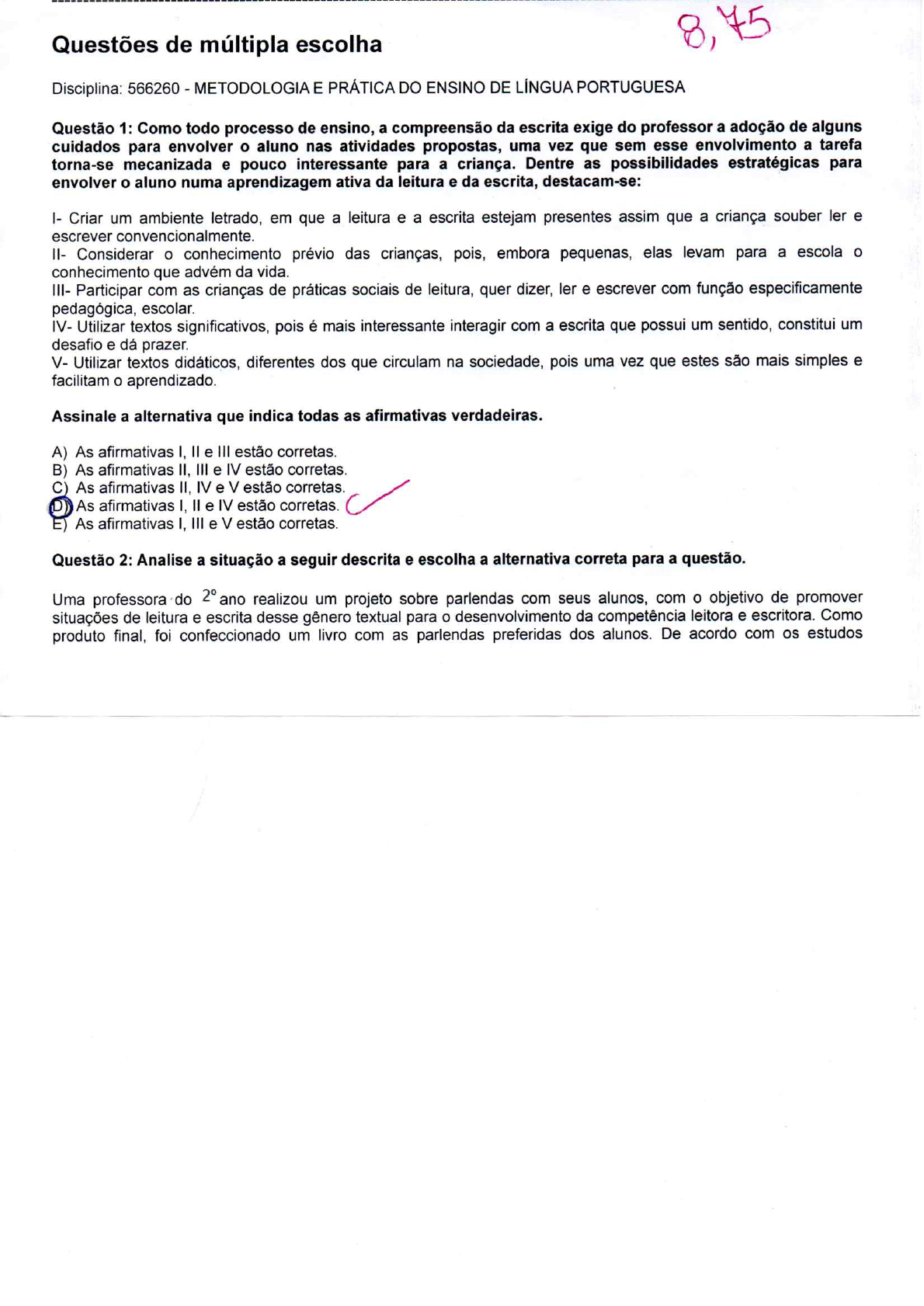 PROVA - METODOLOGIA E PRÁTICA DO ENSINO DE LÍNGUA PORTUGUESA corrigida