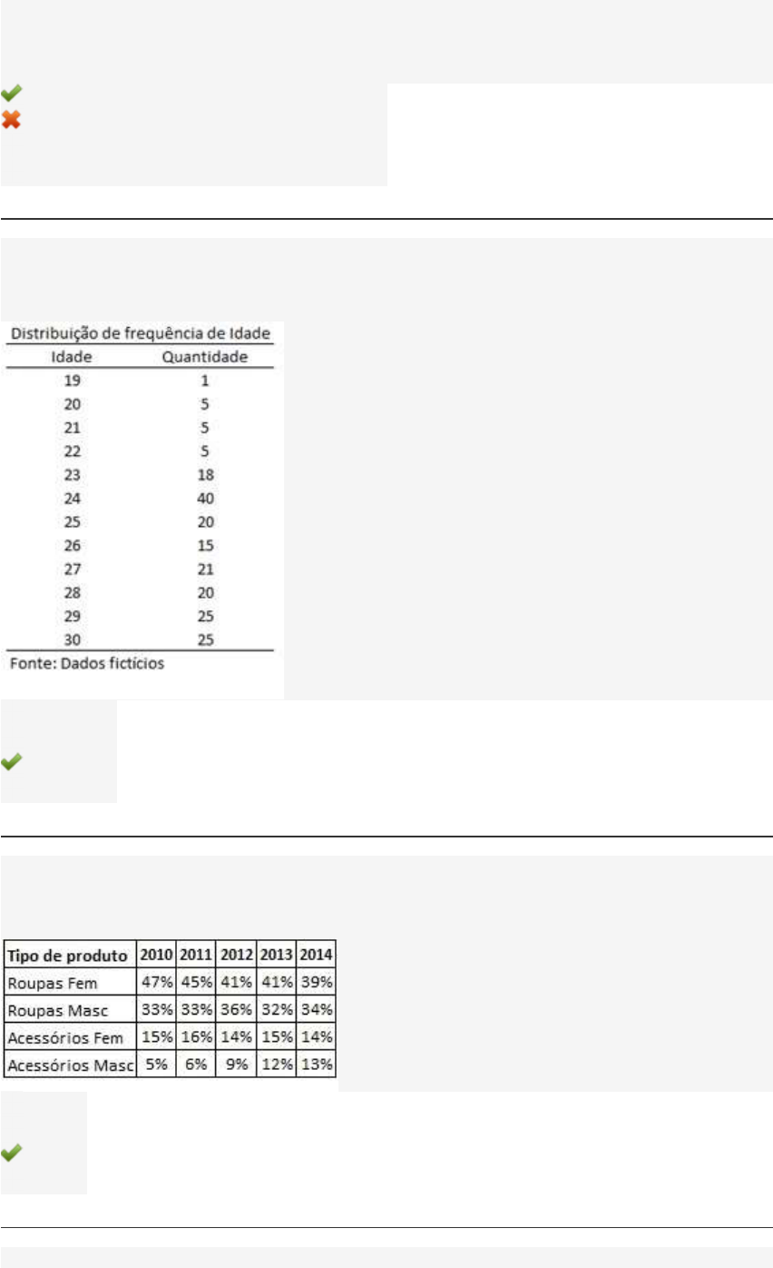 1. Os dados a seguir referem-se à participação, em um ciclo avaliativo, de um grupo de acadêmicos de uma amostra de cinco Polos de Apoio Presencial da UNIASSELVI: 332, 403, 1711, 1603, 179. Com esses dados, estime a participação média e o desvio-padrão destes acadêmicos desta Avaliação Institucional: a) Média = 845,6 e desvio-padrão = 746,09. b) Média = 809,8 e desvio-padrão = 746,09. c) Média = 809,8 e desvio-padrão = 626,49. d) Média = 845,6 e desvio-padrão = 626,49. 2. Em um dia da semana, foi coletada a idade de 200 trabalhadores até 30 anos em uma praça municipal. A distribuição de frequência absoluta da idade desses trabalhadores, em anos, é apresentada na tabela a seguir. Podemos afirmar que a idade média e a idade modal pesquisada, respectivamente, são: a) 24 - 26. b) 25 - 26. c) 26 - 24. d) 24 - 25. 3. Uma empresa que fabrica roupas e acessórios teve uma evolução na produção de acessórios masculinos durante o período de 2010 a 2014. Conforme quadro a seguir, podemos afirmar que o percentual médio de acessórios masculinos produzidos nesse período foi de: a) 6%. b) 7%. c) 9%. d) 8%. 4. Para melhor interpretar e avaliar dados estatísticos, podemos utilizar as Medidas de Tendência Central e as Medidas de Dispersão. Medida de Tendência Central é um valor único que tenta descrever as características de um conjunto de dados, identificando uma posição central dentro do conjunto de dados, já as de dispersão avaliam o quanto que os valores de uma série contornam este "centro". Sobre as Medidas de Tendência Central, analise as opções a seguir: I- Média. II- Mediana. III- Desvio padrão. IV- Coeficiente de variação. V- Moda. Assinale a alternativa CORRETA: a) As opções III e IV estão corretas. b) As opções II, III e V estão corretas. c) As opções I, II e IV estão corretas. d) As opções I, II e V estão corretas. 5. As separatrizes estão classificadas dentro da teoria de métodos quantitativos como medidas de posição, sendo empregadas para separar o conjunto de dados de uma amostra em um número de partes iguais, visando a facilitar sua análise. Sobre as separatrizes, analise as sentenças a seguir: I- A mediana é uma separatriz, pois ela separa os dados de uma amostra em dois conjuntos de mesmo tamanho. II- Os quartis são valores que dividem o conjunto de dados da amostra em quarenta partes iguais. III- Os decis são valores que dividem o conjunto de dados da amostra em cem partes iguais. IV- Os quartis são valores que dividem o conjunto de dados da amostra em quatro partes iguais. Agora, assinale a alternativa CORRETA: a) Somente a sentença II está correta. b) As sentenças II e III estão corretas. c) Somente a sentença III está correta. d) As sentenças I e IV estão corretas. Anexos: Formulário de Métodos Quantitativos 6. Para a apresentação de dados oriundos de pesquisas estatísticas, alguns tipos de gráficos utilizados são dependentes das características dos dados. Com relação à utilização dessas ferramentas, analise as sentenças a seguir: I- O gráfico por setores ou pizza são mais indicados para variáveis qualitativas. II- O gráfico de colunas ou barras é mais recomendado para séries históricas e mistas. III- O gráfico de colunas ou barras é mais recomendado para séries territoriais e categóricas. IV- O pictograma é geralmente originado a partir dos gráficos de linha. Assinale a alternativa CORRETA: a) Somente a sentença IV está correta. b) As sentenças I e III estão corretas. c) Somente a sentença II está correta. d) As sentenças II e IV estão corretas. 7. Dentre as Medidas de Posição, uma delas se caracteriza por dividir os elementos da distribuição ao meio, exatamente, isto é, ocupa o centro da distribuição. Assinale a alternativa CORRETA que se enquadra nesta descrição: a) Mediana. b) Moda. c) Média. d) Média ponderada. 8. Arredondamentos são fundamentais para nossos estudos, principalmente ao calcular valores que têm muitas casas decimais. Muitas vezes, é conveniente suprimir unidades inferiores às de determinada ordem. Esta técnica é denominada arredondamento de dados ou valores. Às vezes, é muito mais fácil e mais compreensível usarmos valores arredondados para melhor entendimento do público que terá acesso à informação. De acordo com as regras de arredondamento, analise as sentenças a seguir: I- Ao arredondar o número 2,156 para uma casa após a vírgula, resultará em 2,1, pois o número descartado é o 5 e há algarismos após ele. II- Ao arredondar o número 10,225 para duas casas após a vírgula, vamos obter o número 10,22, pois não há algarismos após o 5 e o que antecede o número descartado é par. III- Ao arredondar o número 7,366 para duas casas após a vírgula, vamos obter 7,37, pois o algarismo a ser descartado é maior que 5. IV- Não é possível arredondar o número 0,258 para uma casa após a vírgula, pois ele inicia com o algarismo 0 (zero). Assinale a alternativa CORRETA: a) As sentenças II e IV estão corretas. b) As sentenças I e II estão corretas. c) As sentenças II e III estão corretas. d) As sentenças I e III estão corretas. Anexos: Formulário de Métodos Quantitativos 9. Certa empresa necessita verificar a altura média de seus colaboradores que trabalham no setor administrativo da empresa, obtendo os seguintes resultados: 1,55 ? 1,63 ? 1,69 ? 1,70 ? 1,72 ? 1,75 ? 1,80 ? 1,84. Podemos afirmar que a altura média desse departamento é: a) 1,70. b) 1,72. c) 1,71. d) 1,73. 10. A secretaria de saúde de um determinado município concatenou seus dados conforme demonstra a tabela a seguir, que indica a idade de uma amostra de pacientes com câncer atendidos nos hospitais da cidade. Com base nesses dados, analise as sentenças a seguir: I- 5% dos pacientes possuem entre 20 e 30 anos. II- 20% dos pacientes possuem entre 60 e 70 anos. III- 29% dos pacientes possuem entre 20 e 40 anos. IV- 25% dos pacientes pos