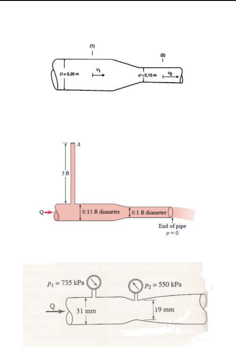 UNIVERSIDADE FEDERAL DO RIO GRANDE ESCOLA DE QUÍMICA E ALIMENTOS DISCIPLINA DE FENÔMENOS DE TRANSPORTE I Lista de Exercícios VI (2019/01) – Equações da Continuidade e de Bernoulli 1 – Água escoa em regime permanente no duto de seção circular mostrado na figura abaixo com uma vazão mássica de 50 kg/s. Sendo ρ = 1.000 kg/m3 a massa específica da água, determine a vazão volumétrica do escoamento e as velocidades médias em 1 e 2. (R: 0,05 m3/s, 1,6 m/s, 6,4 m/s). 2 - Água flui em um tubo, conforme indicado na figura, em estado estacionário e com efeito viscoso insignificante (μ = 0). Determine a máxima vazão volumétrica possível de ser alcançada pela água, considerando o emprego do medidor de pressão piezômetro instalado na linha. 3 - Determine a vazão volumétrica através da tubulação mostrada na figura abaixo, se o fluido que circula pela tubulação é água. 4 – Para o escoamento mostrado na figura, estime a pressão P1 e a velocidade v1, se v2 = 20 m/s e H = 5 cm. (R: 3,516 m/s, 193,6 kPa). 5 - Na Figura 5 despreze todas as perdas de carga e preveja o valor de H e P se: a) h = 15 cm; b) h = 20 cm. 6 - Água escoa em regime permanente nos tanques mostrados na figura. Determine a profundidade da água no tanque A, hA. 7 - Água flui continuamente de um tanque aberto, conforme a figura abaixo. A altura do ponto 1 é igual a 10 m e os pontos 2 e 3 estão a uma altura de 2 m. A área da seção transversal no ponto 2 é igual a 0,048 m 2 ; no ponto 3 ela á igual a 0,016 m 2 . A área do tanque é muito maior do que a área da seção transversal do tubo. Calcule: a) a vazão volumétrica da água que sai pela tubulação; b) a pressão manométrica no ponto 2. 8 - Água escoa desde um reservatório muito grande através de um tubo de 2 in de diâmetro, conforme a figura a seguir. O fluido manométrico do manômetro em U aberto é mercúrio (d = 13,6). Determinar a velocidade no tubo e a vazão que sai do reservatório. 9 - Determine a velocidade V1 na montagem da figura abaixo. 1100 -- AA FFiigguurraa aabbaaiixxoo mmoossttrraa uumm eessqquueemmaa ddee uumm bboorrrriiffaaddoorr ddee áágguuaa nnaa ffoorrmmaa ddee ““vveennttuurrii”” qquuee ssuuggaa áágguuaa ddee uumm rreesseerrvvaattóórriioo ddee nníívveell ccoonnssttaannttee ssuubbmmeettiiddoo àà pprreessssããoo aattmmoossfféérriiccaa.. QQuuaall ddeevveerráá sseerr aa vveelloocciiddaaddee ddoo aarr eemm ““BB”” ppaarraa uumm hh == 1100 ccmm?? AAss ddiimmeennssõõeess ddoo ttuubboo vveennttuurrii ssããoo aass sseegguuiinntteess:: DD == 22 iinn,, dd == 00,,55 iinn.. CCoonnssiiddeerree aa mmaassssaa eessppeeccííffiiccaa ddoo aarr iigguuaall aa 11,,2233 kkgg//mm 33 .. 11 - Na montagem mostrada a seguir (um medidor Venturi), a leitura no manômetro diferencial de mercúrio é 35,8 cm. Determinar a vazão de água através do Venturi, desprezando as perdas entre A e B. 12 - O respiro do tanque mostrado abaixo está fechado e o tanque foi pressurizado para aumentar a vazão Q. Qual é a pressão no tanque P1, para que a vazão no tubo seja o dobro daquela referente à situação onde o respiro está aberto? 13 - Dada a figura, determine a máxima altura H possível para que se evite a cavitação. Faça: d = 4 in; T = 70 0 F. Despreze todas as perdas e suponha Patm = 100 kPa. (R: 2,21 ft). 1144 –– ÁÁgguuaa fflluuii aattrraavvééss ddaa ttuubbuullaaççããoo qquuee ssooffrree uummaa ccoonnttrraaççããoo,, aa uummaa vvaazzããoo ddee 11 fftt 33 //ss.. DDeetteerrmmiinnee aa lleeiittuurraa ddoo mmaannôômmeettrroo ddiiffeerreenncciiaall eemm ppoolleeggaaddaass ddee mmeerrccúúrriioo ((ρρHHgg == 1133660000 kkgg//mm 33 )),, aassssuummiinnddoo qquuee nnããoo hhaajjaa ppeerrddaa ddee eenneerrggiiaa ppoorr ffrriiccççããoo ((ppeerrddaa ddee ccaarrggaa)) nnoo ttrreecchhoo ccoonnssiiddeerraaddoo.. 15 – Água flui em estado estacionário de um grande tanque fechado, conforme a figura abaixo. O deslocamento no manômetro de mercúrio é de 1 in e os efeitos viscosos podem ser desprezados. a) Determine a vazão volumétrica de saída da água; b) Determine a pressão do ar no espaço acima da superfície da água no tanque. 16 – Determine a potência (em Watts) da bomba mostrada na figura abaixo. Determine também as pressões em A e B. A perda de carga no trecho pode ser desprezada.