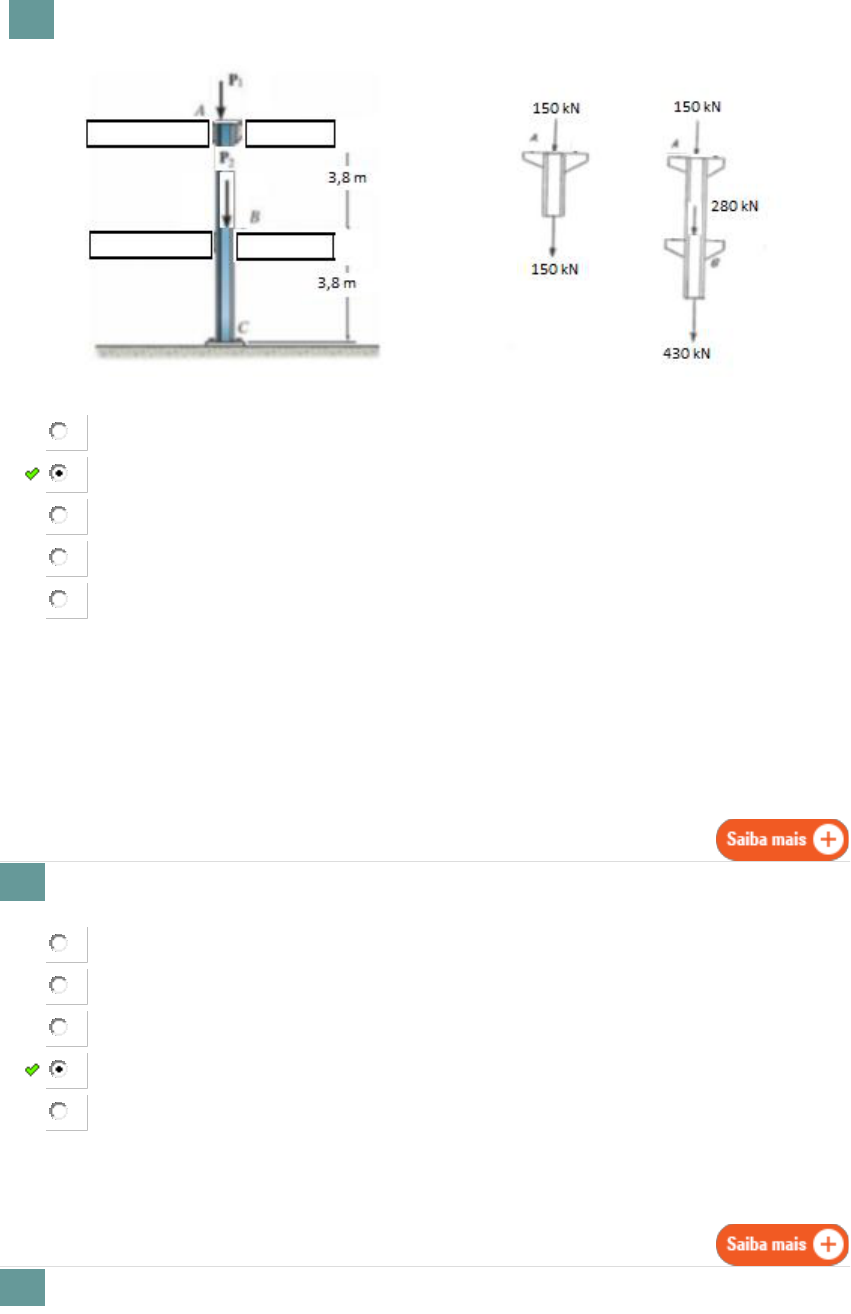 Uma coluna de aço (E = 200 GPa) é usada para suportar as cargas em dois pisos de um edifício. Determine o deslocamento BC, sabendo que P1 = 150 kN e P2 = 280 kN e a coluna tem 20 mm de diâmetro: