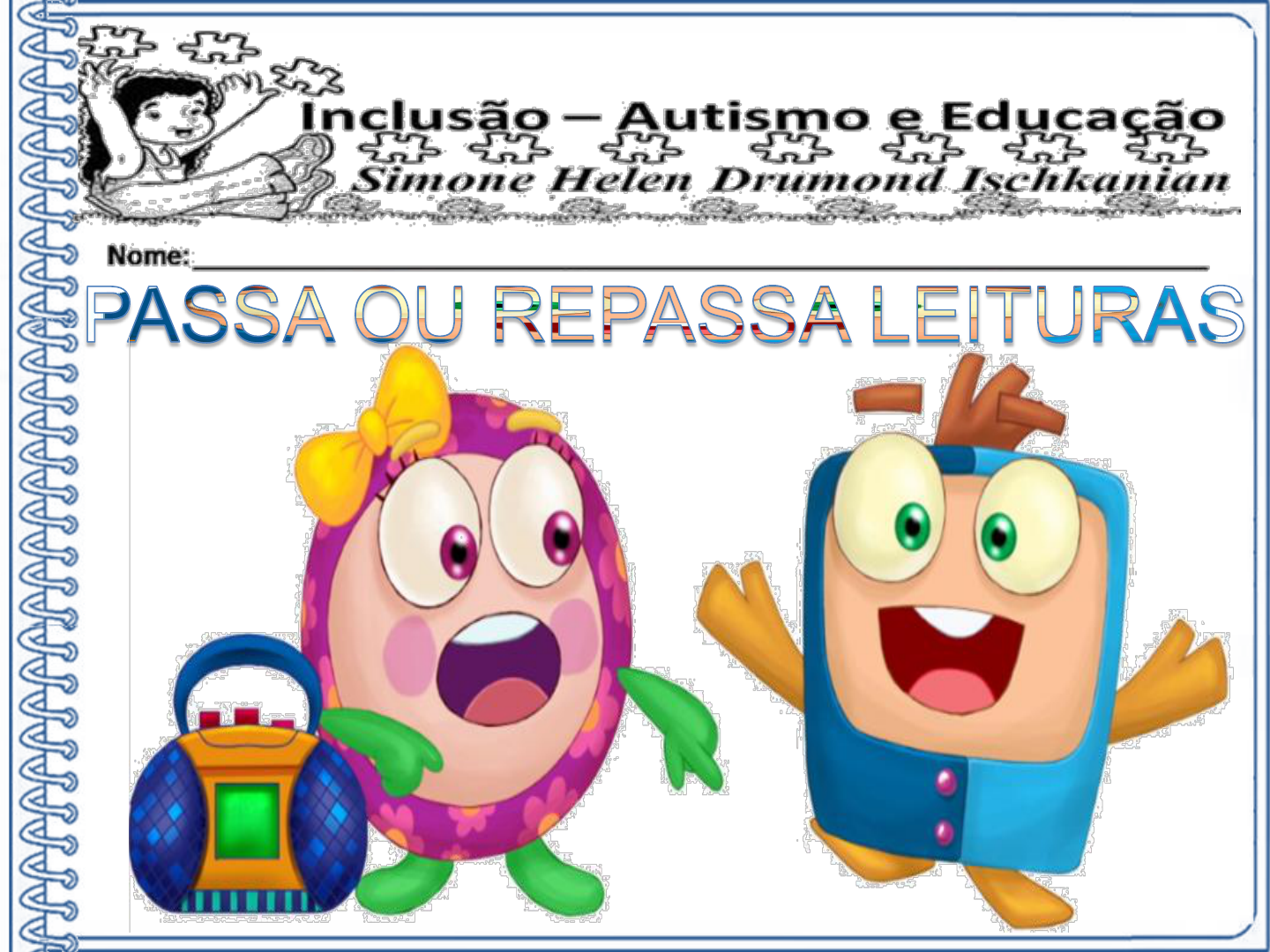 A u ts – C ri a ç ã o d e R e n a to B a rr e to / Referencia: Auts – Renato Barreto Auts é de autoria de Renato Barreto, que se inspirou em seu filho Arthur. A série Auts retratar o autismo de forma educacional, onde a criança aguça seu imaginário através de diversos contextos educativos. O dublador do Auts é o Arthur filho do Renato Barreto. Tenho certeza que Auts e sua turma, vão aguçar o desenvolvimento de diversas habilidades das crianças do nosso querido Planeta Azul. Auts estréia na TV para falar de autismo. Acesse o Google Play APP Auts e click em INSTALAR.Auts – Criação de Renato Barreto A u ts – C ri a ç ã o d e R e n a to B a rr e to BBBBBBBB BOA BIA BEBE BOI BAÚ PASSA OU REPASSA LEITURAS A u ts – C ri a ç ã o d e R e n a to B a rr e to BBBBBBBB BODE BOBO BOIADA BOBI BIBA PASSA OU REPASSA LEITURAS A u ts – C ri a ç ã o d e R e n a to B a rr e to BBBBBBBB CABO CAIU CUECA COCO BOCA PASSA OU REPASSA LEITURAS A u ts – C ri a ç ã o d e R e n a to B a rr e to BBBBBBBB CADUCO CADEIA CABIDE CACO CALO PASSA OU REPASSA LEITURAS A u ts – C ri a ç ã o d e R e n a to B a rr e to BBBBBBBB DIA DADO DEDO DOEU CADEADO PASSA OU REPASSA LEITURAS A u ts – C ri a ç ã o d e R e n a to B a rr e to BBBBBBBB DOCA DODÓ DIDI DELA DEU PASSA OU REPASSA LEITURAS A u ts – C ri a ç ã o d e R e n a to B a rr e to BBBBBBBB FICA FOFO FADA FOI FOCA PASSA OU REPASSA LEITURAS A u ts – C ri a ç ã o d e R e n a to B a rr e to BBBBBBBB GAGO GUGO GIGI GUGA GEGE PASSA OU REPASSA LEITURAS A u ts – C ri a ç ã o d e R e n a to B a rr e to BBBBBBBB HINO HELEN HELICE HIPER HOMEM PASSA OU REPASSA LEITURAS A u ts – C ri a ç ã o d e R e n a to B a rr e to BBBBBBBB JACARÉ JUCA JÓIA JIPE JIBÓIA PASSA OU REPASSA LEITURAS A u ts – C ri a ç ã o d e R e n a to B a rr e to BBBBBBBB KIKI KAKÁ KUKA KIKO KEKE PASSA OU REPASSA LEITURAS A u ts – C ri a ç ã o d e R e n a to B a rr e to BBBBBBBB BOLA LAMA LUA LEMA LEAO PASSA OU REPASSA LEITURAS A u ts – C ri a ç ã o d e R e n a to B a rr e to BBBBBBBB MOEDA MOLA MICO MIMI MIMOU PASSA OU REPASSA LEITURAS A u ts – C ri a ç ã o d e R e n a to B a rr e to BBBBBBBB NADOU NAVIO NUCA NENA NINI PASSA OU REPASSA LEITURAS A u ts – C ri a ç ã o d e R e n a to B a rr e to BBBBBBBB PIA PÉ PIANO PAREDE PINO PASSA OU REPASSA LEITURAS A u ts – C ri a ç ã o d e R e n a to B a rr e to BBBBBBBB RAIO RATO REDE RAIO ROMA PASSA OU REPASSA LEITURAS A u ts – C ri a ç ã o d e R e n a to B a rr e to BBBBBBBB SAIA SELO SOMA SONECA SOU PASSA OU REPASSA LEITURAS A u ts – C ri a ç ã o d e R e n a to B a rr e to BBBBBBBB TITO TIA TEIA TEMA TOLA PASSA OU REPASSA LEITURAS A u ts – C ri a ç ã o d e R e n a to B a rr e to BBBBBBBB VACA VIVI VAI VOU VEIO PASSA OU REPASSA LEITURAS A u ts – C ri a ç ã o d e R e n a to B a rr e to BBBBBBBB XIXI XUCA XALÉ XUXU XUXA PASSA OU REPASSA LEITURAS A u ts – C ri a ç ã o d e R e n a to B a rr e to BBBBBBBB ZERO ZICO ZONA ZECA ZELO PASSA OU REPASSA LEITURAS A u ts – C ri a ç ã o d e R e n a to B a rr e to BBBBBBBB BELO JANELA CASA RÁDIO FONE PASSA OU REPASSA LEITURAS A u ts – C ri a ç ã o d e R e n a to B a rr e to BBBBBBBB ROUPA CADEIRA MESA FOGAO ROUPA PASSA OU REPASSA LEITURAS A u ts – C ri a ç ã o d e R e n a to B a rr e to BBBBBBBB REMO RODA MACACO MOLA NAVIO PASSA OU REPASSA LEITURAS A u ts – C ri a ç ã o d e R e n a to B a rr e to BBBBBBBB SACO MAQUINA MENINO NEVE ZELOU PASSA OU REPASSA LEITURAS A u ts – C ri a ç ã o d e R e n a to B a rr e to BBBBBBBB AVIAO RUA LAGOA CANOA FEIRA PASSA OU REPASSA LEITURAS A u ts – C ri a ç ã o d e R e n a to B a rr e to BBBBBBBB CAMINHO FESTA FINO FOLHA FLOR PASSA OU REPASSA LEITURAS Educação Infantil Profissional: _________________ _________________ _________________ PEI - PLANO EDUCACIONAL INDIVIDUALIZADO Planejamento Diário Objetivos de aprendizagem e desenvolvimento Campos de Experiências Vivências Recursos Pedagógicos Profissional: ______________________________ ______________________________ Direitos de aprendizagem: ( ) Conviver ( ) Brincar ( ) Participar ( ) Explorar ( ) Expressar ( ) Conhecer-se Eixos norteadores: As interações e as brincadeiras O PEI do Método de Portfólios Inclusão – Autismo e Educação de Simone Helen Drumond Ischkanian procura assegurar, que a criança no contexto da inclusão, na Educação Infantil, tenha as condições necessárias para aprender em situações nas quais possam desempenhar um papel ativo em ambientes que as convidem a vivenciar desafios e desenvolvimento de habilidades, por meio do lúdico, das interações e brincadeiras.. PEI - PLANO EDUCACIONAL INDIVIDUALIZADO Direitos de aprendizagem Conviver Brincar Participar Explorar Expressar Conhecer-se Profissional: ______________________________ ______________________________ Eixos norteadores: As interações e as brincadeiras Eixos norteadores: As interações e as brincadeiras. Objetivos de aprendizagem e desenvolvimento Campos de Experiências Vivências Recursos Pedagógicos Profissional: ______________________________ ______________________________ PEI - PLANO EDUCACIONAL INDIVIDUALIZADO Eixos norteadores: As interações e as brincadeiras. Atividades Permanentes Roda de história Roda de conversa Faz-de-Conta Música Hora da Leitura Cuidados com o Corpo Exploração dos espaços de aprendizagens Outras: _______________________ _______________________ _______________________ Atividades Diversificadas Oficinas de desenho Pintura Modelagem Construções Ateliês Teatro Danças Outras. _________________________ _________________________ _________________________ _________________________ _________________________ _________________________ Atividades transitórias (Casa-Creche-Pré-escola- Ensino Fundamental) Integração e continuidade dos processos de aprendizagens das crianças. ________________________ ________________________ ________________________ ________________________________________________ __