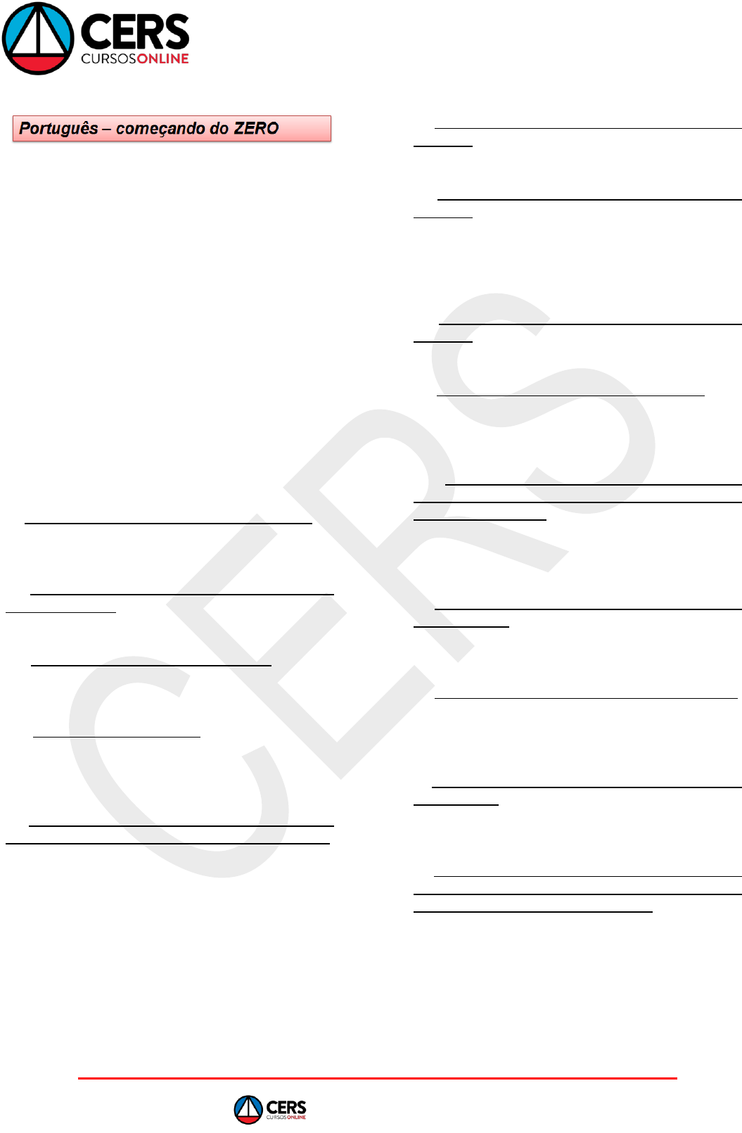 www.cers.com.br COMEÇANDO DO ZERO Língua Portuguesa Rodrigo Bezerra 1 Flexões de tempo: * Infinitivo pessoal falarem, beberem, partirem * Gerúndio falando, bebendo, partindo. * Particípio falado, bebido, partido. Emprego dos tempos e modos verbais: 1. Presente Emprega-se o presente do indicativo para indicar um fato que se realiza no momento em que se fala: * Ele estuda Português. A lição não é fácil. Nem sempre, porém, indica fato ou ação contemporânea ao momento em que se fala. Pode-se ainda empregá-lo para: a) descrever um fato ou estado permanente: O Sol aquece a Terra. Maria é mãe de Jesus. As leis do Universo são imutáveis. b) indicar ação habitual ou que se pratica constantemente: Maria fuma demais. Vou ao cinema todos os domingos. c) dar realismo a fatos passados: Cabral descobre o Brasil em 1500. Os bandeirantes abrem o sertão brasileiro e conquistam a terra. d) indicar futuro próximo (nesse caso, é geralmente acompanhado de um adjunto adverbial): Terminei meus negócios e sigo amanhã para Nova Iorque. e) substituir o imperativo, quando se deseja denotar mais um pedido do que uma ordem: Você me faz isso amanhã (= faça-me isso amanhã) . 2. Pretérito imperfeito O pretérito imperfeito indica uma ação situada no passado que apresenta continuidade, progressão dentro desse passado. Emprega-se também o pretérito imperfeito para: a) descrever fatos frequentes ou repetidos no passado: Quando era criança ia sempre à casa de vovó, onde brincava com Maria. b) designar fatos indicando continuidade no passado: As diversas tribos que habitavam o continente americano eram de cultura diferente; algumas caçavam e pescavam, ao passo que outras já tinham conhecimento de agricultura. c) descrever pessoas, fatos ou coisas no passado: Ela parecia inteligente. O rio fazia uma pequena curva antes de cair em catarata. d) indicar época ou tempo no passado: Era época da seca quando José deixou o Nordeste. Eram seis horas da tarde quando Ana telefonou. e) indicar, entre duas ou mais ações simultâneas, qual estava ocorrendo quando sobreveio a outra (nesse caso, o segundo verbo é geralmente usado no pretérito perfeito simples): Pedro entrava quando eu saí. Conversávamos quando a criança caiu. f) expressar frequência, repetição, causa e consequência (nesse caso, os verbos vêm ambos no pretérito imperfeito): Eu saía quando ele entrava. g) descrever ação planejada e não realizada: Eu ia passear, mas começou a chover e desisti. Pretendíamos falar com ele, mas não tivemos tempo. h) narrar fábulas, lendas ou contos, situando-os no passado (nesse caso, usa-se o pretérito imperfeito do verbo ser): Era uma vez um príncipe. .. i) indicar um só fato preciso no passado, quando a época ou a data em que ocorreu a ação vem claramente mencionada: Duas horas depois de receber o telegrama, Geraldo partia do aeroporto de Congonhas. Passado o tempo exigido por lei, João se naturalizava. 3. Pretérito perfeito simples ' O pretérito perfeito simples indica uma ação, geralmente não habitual, concluída antes www.cers.com.br COMEÇANDO DO ZERO Língua Portuguesa Rodrigo Bezerra 2 do ato de falar; o fato começou e terminou no passado, seja passado remoto ou próximo: • Fui ao mercado hoje de manhã. • Estive com ele em 1980. 4. Pretérito perfeito composto O pretérito perfeito composto indica a repetição ou a continuidade de um fato iniciado no passado e que ainda se realiza no presente, vindo acompanhado de adjuntos adverbiais como desde, ultimamente, esses dias etc.: * Tenho feito tudo por ele desde que quebrou o braço. Não temos tido sorte ultimamente. 5. Pretérito mais-que-perfeito simples O pretérito mais-que-perfeito simples expressa um fato já concluído antes de outro também no passado. a) em situações formais na língua escrita: Viera especialmente para o concerto. b) para substituir o pretérito imperfeito do subjuntivo: Comportou-se como se fora (= fosse) senhora das terras. c) em certas frases exclamativas: Quem me dera ser rico! O pretérito mais-que-perfeito composto é empregado, como o simples, para expressar um fato já concluído antes de outro também no passado. É usado na língua falada e, em geral, também na escrita: * Tinha vindo especialmente para o concerto. 6. Futuro do presente simples O futuro do presente simples é usado para indicar um fato futuro em relação ao momento em que se fala: Irei à praia neste fim de semana. Emprega-se também para: a) indicar fatos de realização provável, pois estão mediante certa condição: Se ele vier, falarei com ele. b) indicar incerteza, dúvida, suposição: Será possível uma coisa dessas? Estarei eu aqui pela providência divina? Observação O futuro do presente simples é comumente substituído, na língua falada, por locuções verbais (conjunto inseparável formado de um verbo auxiliar e de um principal usado no infinitivo, no particípio ou no gerúndio), como, por exemplo: O presente do indicativo do verbo haver, mais preposição de, mais infinitivo impessoal do verbo principal para exprimir intenção: * Hei de falar com ele antes do fim do mês. 8. Futuro do presente composto O futuro do presente composto indica: a) ação futura consumada antes de outra também futura: * Já teremos terminado o trabalho quando eles chegarem. b) possibilidade de uma ação já ter se consumado: * Já terão saído? 9. Futuro do pretérito simples Usa-se o futuro do pretérito simples: a) para indicar um fato futuro em relação a um fato passado: Ele prometeu a Maria que chegaria antes das seis. b) quando a oração subordinada revela um fato não realizado ou que talvez não se realize: Iríamos se ele permitisse. c) para exprimir incerteza ou dúvida sobre fatos passados: Quem estaria lá? Ele teria uns vinte anos quando se casou. d) em certas orações exclamativas ou interrogativas que denotam surpresa ou indignação: Nunca agiríamos dessa maneira! Seria possível uma