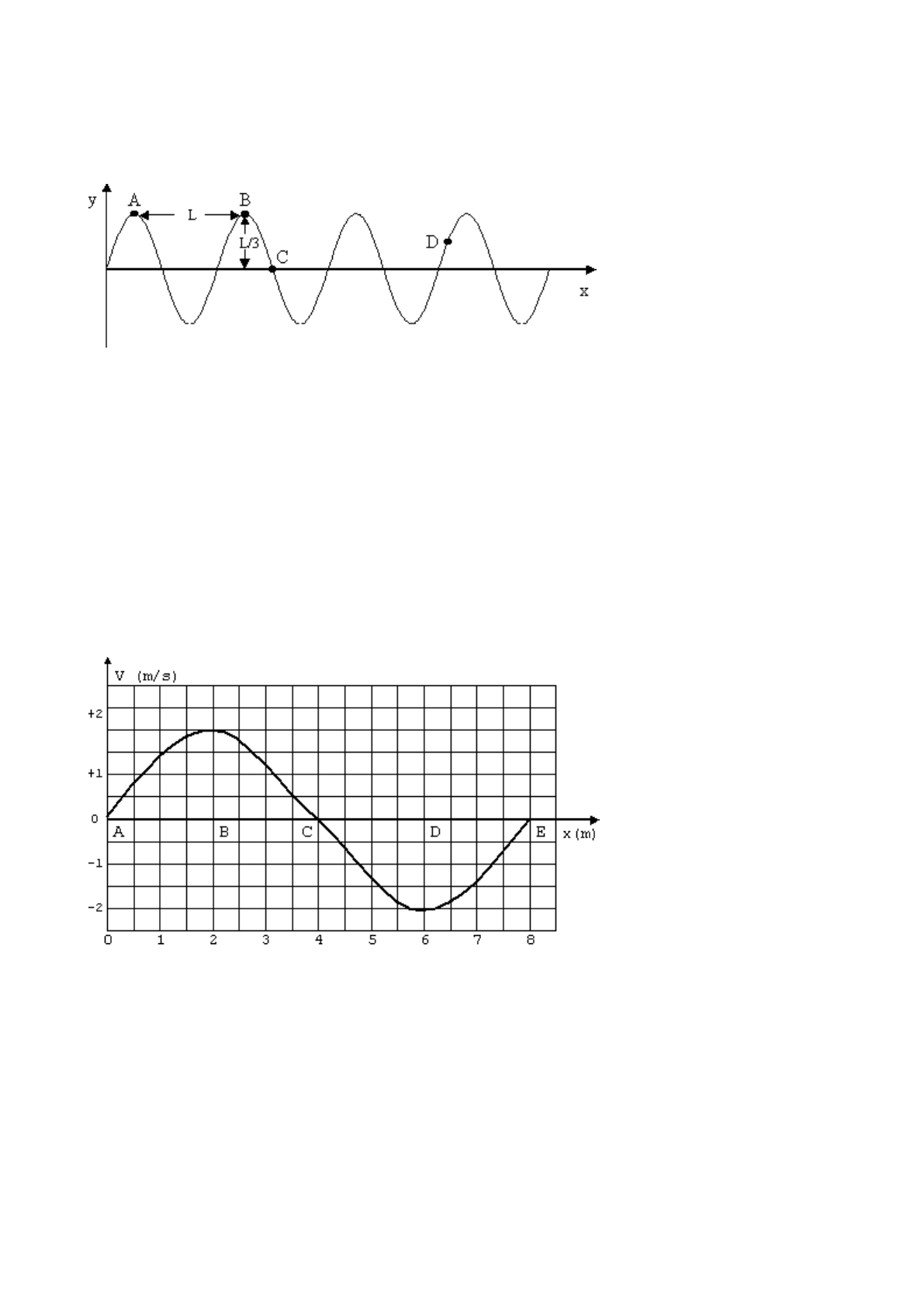 ONDAS 01 01) (UFV/2001) A figura abaixo ilustra um "flash" ou instantâneo de um trem de ondas que se propaga em uma corda para a direita e com velocidade constante. Pode-se, então, afirmar que: a) o período da onda é L. b) o comprimento da onda é L/3. c) a velocidade instantânea do ponto D da corda é vertical e para baixo. d) a amplitude da onda é L. e) a velocidade instantânea do ponto C da corda é nula 02) (SEI-01/2º) As ondas eletromagnéticas no vácuo são todas idênticas com relação: a) à amplitude. d) ao período. b) ao comprimento de onda. e) à velocidade de propagação. c) à freqüência. 03) (FUVEST/99) O gráfico representa, num dado instante, a velocidade transversal dos pontos de uma corda, na qual se propaga uma onda senoidal na direção do eixo dos x. A velocidade de propagação da onda na corda é 24m/s. Sejam A, B, C, D e E pontos da corda. Considere, para o instante representado, as seguintes afirmações: I. A freqüência da onda é 0,25 Hz. II. Os pontos A, C e E têm máxima aceleração transversal (em módulo). III. Os pontos A, C e E têm máximo deslocamento transversal (em módulo). IV. Todos os pontos da onda se deslocam com velocidade de 24m/s na direção do eixo x. São corretas as afirmações: a) todas. d) somente I e II. b) somente. e) somente II, III e IV. c) somente II e III. 04) (UFLA/2001) Vários instrumentos musicais emitem a mesma nota. Um espectador consegue distinguir a nota emitida pelos diferentes instrumentos por causa a) das freqüências diferentes. b) das alturas diferentes. c) dos timbres diferentes. d) dos comprimentos de onda diferentes. e) dos períodos diferentes. 05) (UFF/2001) A figura representa a propagação de dois pulsos em cordas idênticas e homogêneas. A extremidade esquerda da corda, na situação I, está fixa na parede e, na situação II, está livre para deslizar, com atrito desprezível, ao longo de uma haste. Identifique a opção em que estão mais bem representados os pulsos refletidos nas situações I e II: a) b) c) d) e) 06) (PUCMG/2001) Considere os seguintes fatos: I. A sirene de uma ambulância parece mais aguda quando está aproximando-se do observado e, mais grave, quando está afastando-se dele. II. Gotículas de água atingidas por luz solar produzem um arco-íris. III. É possível que duas fontes lineares de luz, convenientemente dispostas, produzam, em um filme fotográfico, um padrão de faixas claras e escuras. Esses fatos estão corretamente relacionados aos seguintes fenômenos físicos: a) I - Interferência; II - Refração e Reflexão; III - Propagação retilínea da luz. b) I - Efeito Dopples; II - Interferência; III - Dispersão. c) I - Difração; II - Efeito Tyndall; III - Interferência. d) I - Efeito Doppler; II - Refração e Reflexão; III - Interferência. 07) (UNESP/2000) A figura representa, num determinado instante, o valor (em escala arbitrária) do campo elétrico E associado a uma onda eletromagnética que se propaga no vácuo, ao longo do eixo X, correspondente a um raio de luz de cor laranja. A velocidade da luz no vácuo vale 3,0x108 m/s. Podemos concluir que a freqüência dessa luz de cor laranja vale, em hertz, aproximadamente, a) 180. d) 2,0x10–15. b) 4,0x10–15. e) 0,5x1015. c) 0,25x1015. 08) (UFMG/97) Duas pessoas esticam uma corda, puxando por suas extremidades, e cada uma envia um pulso na direção da outra. Os pulsos têm o mesmo formato, mas setão invertidos como mostra a figura. Pode-se afirmar que os pulsos a) passarão um pelo outro, cada qual chegando à outra extremidade. b) se destruirão, de modo que nenhum deles chegará às extremidades. c) serão refletidos, ao se encontrarem, cada um mantendo-se no mesmo lado em que estava com relação à horizontal. d) serão refletidos, ao se encontrarem, porém invertendo seus lados com relação à horizontal. 9) (UFMG/98) O som é um exemplo de uma onda longitudinal. Uma onda produzida numa corda esticada é um exemplo de uma onda transversal. O que difere ondas mecânicas longitudinais de ondas mecânicas transversais é a) a freqüência. b) a direção de vibração do meio de propagação. c) o comprimento de onda. d) a direção de propagação. 10) (PUC-RJ/2001) Ondas sonoras e luminosas emitidas por fontes em movimento em relação a um observador são recebi-das por este com freqüência diferente da original. Este fenômeno, que permite saber, por exemplo, se uma estrela se afasta ou se aproxima da Terra, é denominado de efeito a) Joule. d) Volta. b) Oersted. e) Faraday. c) Doppler. - GABARITO - MOVIMENTO ONDULATÓRIO - (RESOLUÇÃO DO CURSO RAIZ) 01 - C 06 - D 02 - E 07 - E 03 - C 08 - A 04 - C 09 - A 05 - B 10 - C ONDAS 02 1 - Nas últimas décadas, o cinema têm produzido inúmeros filmes de ficção científica com cenas de guerras espaciais, como Guerra nas Estrelas. Com exceção de 2001, Uma Odisséia no Espaço, essas cenas apresentam explosões com estrondos impressionantes, além de efeitos luminosos espetaculares, tudo isso no espaço interplanetário. a) Comparando Guerra nas Estrelas, que apresenta efeitos sonoros de explosão, com 2001, uma odisséia no Espaço, que não os apresenta, qual deles está de acordo com as leis da Física? Explique sua resposta. b) E quanto aos efeitos luminosos apresentados por ambos, estão de acordo com as leis Físicas? Justifique. 2 - A figura abaixo representa uma onda periódica propagando-se na água (a onda está representada de perfil). A velocidade de propagação desta onda é de 40 m/s, e cada quadradinho possui 1 m de lado. Determine: a) O comprimento de onda () desta onda. b) A amplitude (A) desta onda. c) A freqüência (f) da onda. d) O período (T) de oscilação do barquinho sobre a onda. 3 - Explique a diferença entre a uma onda transversal e uma onda longitudinal. 4 - Qual é a relação matemática existente entre a velocidade de uma onda, sua freqüência e seu comprimento de onda? 5 - Qual é a única coisa que uma