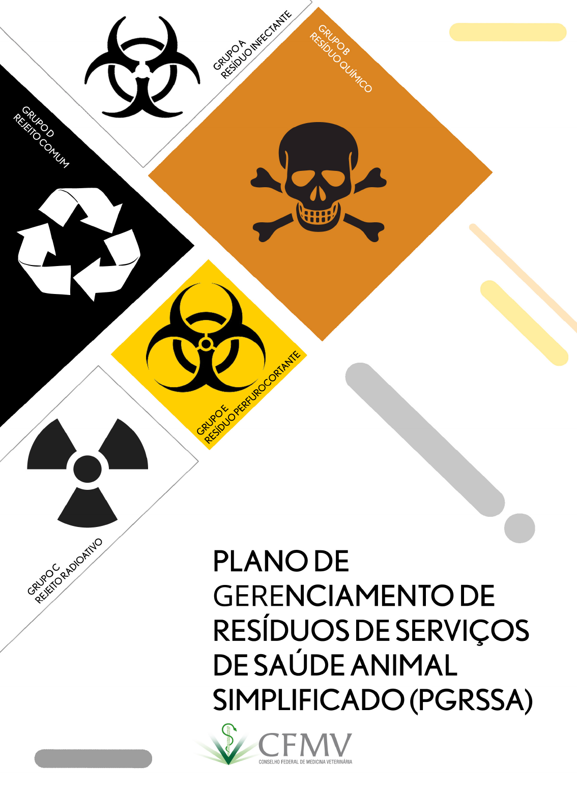 PLANO DE GERENCIAMENTO DE RESÍDUOS DE SERVIÇOS DE SAÚDE ANIMAL SIMPLIFICADO (PGRSSA) - 2019 - Equipe Técnica Esta obra foi elaborada pela Comissão de Saúde Ambiental do Conselho Regional de Medicina Veterinária do Estado de São Paulo (CRMV/SP) e contou com a participação dos seguintes médicos veterinários: Comissão de Saúde Ambiental do Conselho Regional de Medicina Veterinária do Estado de São Paulo (CRMV/SP) Ana Claudia Furlan Mori Elma Pereira dos Santos Polegato Maria Cecília Marcondes Veiga Roberto de Azevedo Lobão Adaptada para utilização em nível Federal pela Comissão Nacional de Meio Ambiente – Gestão 2015-2017 Índice Apresentação...................................................................................................7 Definições e Siglas...........................................................................................8 Grupo A - Resíduo Biológico Infectante..........................................................12 Grupo B - Resíduo Químico...........................................................................14 Grupo C - Rejeito Radioativo..........................................................................16 Grupo D - Resíduo Comum ........................................................................ 18 Grupo E - Resíduo Perfurocortante...............................................................20 Plano de Gerenciamento de Resíduos de Serviços de SaúdeAnimal Simplificado (PGRSSA)...........................................................22 Segurança e Saúde do Trabalhador...............................................................26 Referências.....................................................................................................27 7 A Comissão Nacional de Meio Ambiente adaptou o material produzido pela Comissão de Saúde Ambiental do Conselho Regional de Medicina Veterinária do Estado de São Paulo (CRMV/SP) quanto a proposta de implementação do Programa de Gerenciamento de Resíduos de Serviços de Saúde Animal (PGRSSA) simplificado, visando auxiliar no desenvolvimento desta ferramenta de gestão de resíduos, a partir da identificação e análise dos problemas existentes relacionados aos resíduos de serviços de saúde animal, bem como padronizar os procedimentos em todas as unidades prestadoras de serviços de saúde animal (consultórios, clínicas, hospitais, laboratórios etc.) que compõem o sistema CFMV e CRMV dos Estados. Além do cumprimento à legislação vigente, visa fortalecer os conceitos sobre a importância de reduzir, reaproveitar e reciclar, podendo, em muitos casos, representar uma redução nos custos diretos e indiretos para a instituição prestadora de serviços veterinários, bem como considerar a relevância das medidas relativas à segurança do sistema de gerenciamento de resíduos no tocante ao usuário do serviço de saúde, ao trabalhador e ao meio ambiente. Apresentação 8 9 Definições e Siglas Acondicionamento: procedimento que visa embalar adequadamente os resíduos gerados, de acordo com as suas características, com a finalidade de preservar a saúde e o meio ambiente. Certificado de Destinação: certificado a ser emitido pela empresa receptora garantindo a reciclagem ou a destinação final ambientalmente correta. Certificado de Destruição Térmica: certificado a ser emitido pela empresa receptora garantindo a incineração (descaracterização total do resíduo perigoso) e destinação final ambientalmente correta. Certificado de movimentação de resíduos de interesse ambiental – CADRI: certificado emitido por órgão ambiental estadual que regulamenta o transporte, tratamento e destinação dos resíduos gerados. Coleta interna: consiste em transferir os resíduos já segregados, embalados e/ou acondicionados adequadamente e de forma segura do local gerador até o local de armazenamento. Gerenciamento: constitui-se em um conjunto de procedimentos de gestão, planejados e implementados a partir de bases científicas e técnicas, normativas e legais, com o objetivo de minimizar a produção de resíduos e proporcionar aos resíduos gerados, um encaminhamento seguro, de forma eficiente, visando a proteção dos trabalhadores, a preservação da saúde pública, dos recursos naturais e do meio ambiente. Identificação: permite o reconhecimento dos resíduos contidos nas embalagens e recipientes, e fornece informações ao correto manejo dos RSS. Os sacos plásticos e recipientes utilizados para acondicionar os resíduos infectantes são identificados com símbolo internacional de substância infectante. MTR (Manifesto para Transporte de Resíduos Perigosos): documento obrigatório que deve acompanhar o veículo de transporte de resíduos Classe I. Perfurocortante: material que pode perfurar, cortar ou dilacerar a pele se não for contido durante o manuseio (agulhas, escalpes, bisturis, lâminas, cacos de vidro e ampolas), proveniente de estabelecimentos prestadores de serviços de saúde. Resíduo: qualquer material para o qual não há mais uso futuro. Pode resultar de produtos ou materiais biológicos e químicos ou de atividades institucionais ou domésticas (exemplo: lixo). Resíduo químico: resíduos contendo substâncias químicas que apresentam risco à saúde pública ou ao meio ambiente, em função de suas características de inflamabilidade, corrosividade, reatividade e toxicidade. Resíduos classe I - Perigosos: Apresentam periculosidade ou uma das seguintes características: inflamabilidade, corrosividade, reatividade, toxicidade e patogenicidade que possam representar risco à saúde pública, provocando ou acentuando o aumento de mortalidade, incidência de doenças ou riscos ao meio ambiente, quando manuseado ou descartado inadequadamente. Ex: baterias, produtos químicos. Resíduos classe II - Não Perigosos: são aqueles que não se enquadram nas classificações de resíduos classe I (perigosos), ou seja, são