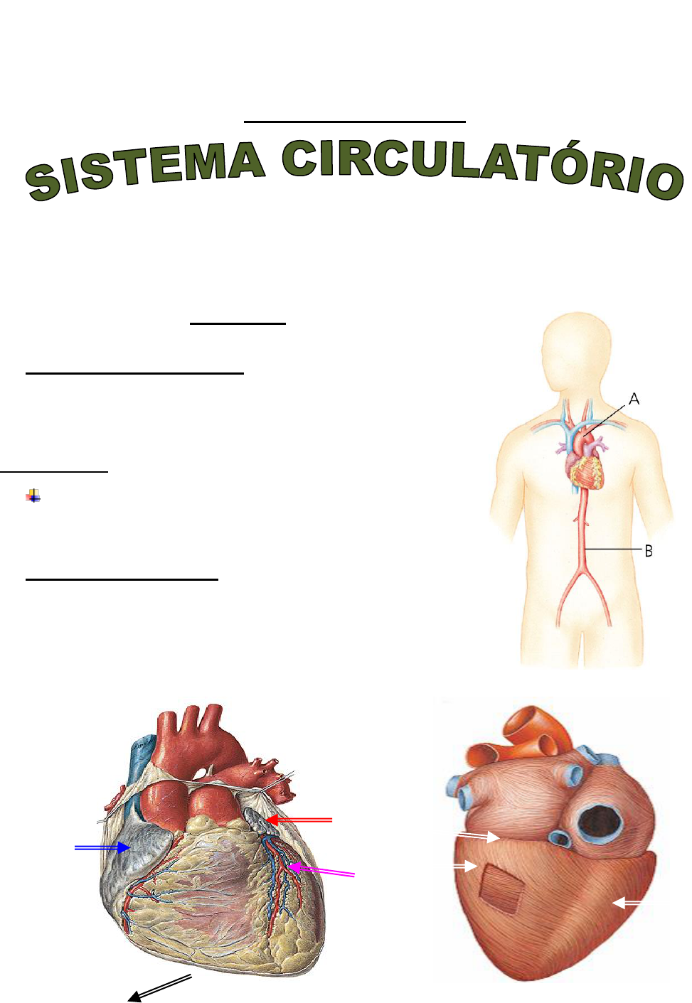 1 ANATOMIA HUMANA ROTEIRO PRÁTICO DOS OSSOS CORAÇÃO 1. CONFIGURAÇÃO EXTERNA: • FACES: DIAFRAGMÁTICA , ESTERNOCOSTAL, PULMONAR • BASE • ÁPICE DO CORAÇÃO (AC) PERICÁRDIO: PERICÁRDIO SEROSO: ❖ LÂMINA PARIETAL (LP) ❖ LÂMINA VISCERAL (LV) 2. FACE ESTERNOCOSTAL: • AURICULA DO ÁTRIO DIREITA • AURICULA DO ÁTRIO ESQUERDO • VENTRÍCULO DIREITO • VENTRÍCULO ESQUERDO 2 AC 3. FACE DIAFRAGMÁTICA: • ÁTRIO DIREITO • VEIA CAVA SUPERIOR • VEIA CAVA INFERIOR • ATRIO ESQUERDO • VEIAS PULMONARES DIREITA • VEIAS PULMONARES ESQUERDA • A. CORONÁRIA DIREITA • VENTRÍCULO DIREITO • VENTRÍCULO ESQUERDO 4. CONFIGURAÇÃO INTERNA DO VENTRÍCULO DIREITO ESQUERDO VALVA ATRIOVENTRICULAR DIREITA: VAL VA ÁTRIOVENTRICULAR ESQUERDO : - VÁLVULA ANTERIOR - VÁLVULA ANTERIOR - VÁLVULA POSTRIOR - VÁLVULA POSTERIOR - VÁLVULA SEPTAL VALVA DA A. AORTA VALVA DO TRONCO PULMONAR 3 PRINCIPAIS ARTÉRIAS DO ORGANISMO HUMANO: 5. TRONCO PULMONAR TC 4 • ARTÉRIA PULMONAR ESQUERDA • ARTÉRIA PULMONAR DIREITA 6. ARTÉRIA AORTA PARTE ASCENDENTE DA AORTA • A. CORONÁRIA DIREITA • A. CORONÁRIA ESQUERDA ARCO AÓRTICO 37 • TRONCO BRAQUIOCEFÁLICO • A. CÁROTIDA COMUM DIREITA • A. SUBCLÁVIA DIREITA • A. CÁROTIDA COMUM ESQUERDA • A. SUBCLÁVIA ESQUERDA 5 7.1.2 RAMOS TERMINAIS DA AORTA: • A. ILÍACA COMUM DIREITA • A. ILÍACA INTERNA DIREITA • A. ILÍACA EXTERNA DIREITA • A. ILÍACA COMUM ESQUERDA • A. ILÍACA INTERNA ESQUERDA • A. ILÍACA EXTERNA ESQUERDA ARTÉRIAS DOS MEMBROS INFERIORES 6 • A. FEMORAL • A. POPLÍTEA • A. DORSAL DO PÉ ARTÉRIAS DOS MEMBROS SUPERIORES • A. AXILAR • A. BRAQUIAL • A. RADIAL 7 PRINCIPAIS VEIAS DO ORGANISMO HUMANO • V. CAVA SUPERIOR • VEIA BRAIQUIOCEFÁLICA DIREITA • VEIA BRAQUIOCEFÁLICA ESQUERDA • VEIA JUGULAR INTERNA • VEIA JUGULAR EXTERNA • VEIA SUBCLÁVIA DIREITA E ESQUERDA 8 VEIAS DO MEMBRO SUPERIOR • V. CEFÁLICA • V. BASÍLICA • VEIAS DO MEMBRO INFERIOR • V. SAFENA MAGNA • V. SAFENA PARVA • V. FEMORAL