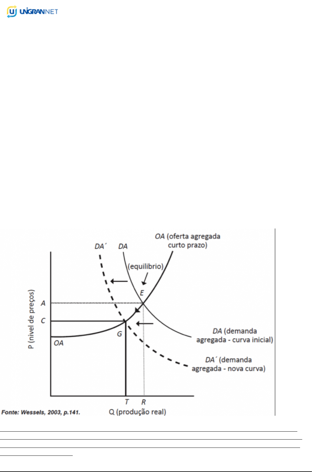 GABARITO Página 1 - 26/06/2019 às 10:52 Prova Data de aplicação: 07/06/2019 Curso: Administração Disciplina: Macroeconomia Ano: 20191 / Semestre: 4 PROVA 01 Questão 1 OBSERVE A FIGURA ABAIXO, ELA MOSTRA O DESLOCAMENTO DA CURVA DE DEMANDA AGREGADA PARA A ESQUERDA (DE DA PARA DA’), SINALIZANDO UMA REDUÇÃO DA DEMANDA AGREGADA. RESPONDA: Cite e explique um fator que possa ter causado o deslocamento da curva de demanda agregada para a esquerda. Resposta do aluno: Quando o país está incerto com a economia e por isto reduz gastos com consumo e mesmo com o nivel de preços se mantendo constante a redução do consumo agragado irá provocar redução na demanda agregada e a curva da demanda agregada desloca-se para esquerda. GABARITO Página 2 - 26/06/2019 às 10:52 Parecer do professor: Correta Questão 2 A TAXA DE JUROS É UM DOS FATORES QUE INFLUENCIAM A DEMANDA DE MOEDA. EXPLIQUE A RELAÇÃO ENTRE A DEMANDA DE MOEDA E A TAXA DE JUROS. Resposta do aluno: A demanda de moeda é inversamente relacionada com a taxa de juros, pois um aumento na taxa de juros faz com que diminua a circulação de moeda no país, já uma queda na taxa de juros fará efeito contrário. Parecer do professor: Correta Questão 3 COM RELAÇÃO AO CONTEÚDO ESTUDADO SOBRE MOEDA, ANALISE AS PROPOSIÇÕES A SEGUIR. I. Os meios de pagamento são representados pelo total de moeda em poder do público, pelos depósitos à vista nos bancos comerciais e pelos depósitos em cadernetas de poupança. II. Um ativo financeiro é considerado de liquidez imediata quando este pode cumprir seu papel de moeda a qualquer momento e quando não rende juros. III. Os ativos financeiros que possuem maior grau de liquidez são o papel moeda e as moedas metálicas. IV. Os depósitos à vista nos bancos comerciais são representados pela quantidade de moeda disponível nas contas correntes dos correntistas. V. Os depósitos em cadernetas de poupança apresentam maior grau de liquidez em relação aos depósitos à vista nos bancos comerciais. ASSINALE A ALTERNATIVA CORRETA: a) Somente a proposição I é correta. b) Somente a proposição II é correta. c) Somente as proposições II e III são corretas. d) Somente as proposições II, III e IV são corretas. (correta) e) Somente as proposições II, III, IV e V são corretas. Questão 4 COM BASE NO MODELO KEYNESIANO SIMPLES, ASSINALE O ITEM INCORRETO. a) O modelo supõe que a economia está em equilíbrio com desemprego de fatores de produção. b) A oferta agregada expressa a quantidade total de bens e serviços finais que todas as empresas e famílias da economia estão dispostas a produzir e colocar no mercado a um determinado nível de preço durante certo período. c) A oferta agregada efetiva é representada pela produção ou PIB máximo que o país poderia atingir se estivesse trabalhando em pleno emprego. (correta) d) Segundo o princípio da demanda efetiva, é a demanda que desencadeia a produção, a geração de emprego e de renda. e) O modelo supõe que toda a demanda pode ser completamente atendida mesmo se a economia não estiver produzindo em máxima capacidade produtiva. Questão 5 ASSINALE A ALTERNATIVA QUE CONTÉM DOIS FATORES QUE AFETAM A DEMANDA AGREGADA DA ECONOMIA. a) Taxa de câmbio e carga tributária sobre o setor produtivo. b) Taxa de juros praticada no mercado e nível de investimento. (correta) c) Taxa de juros praticada no mercado e nível de inovação tecnológica. d) Nível de preços da economia e custos de produção. GABARITO Página 3 - 26/06/2019 às 10:52 Questão 6 COM RELAÇÃO AOS MODELOS DE DETERMINAÇÃO DA RENDA E DO PRODUTO NACIONAL PELO LADO REAL, ASSINALE A ALTERNATIVA INCORRETA. a) Segundo o Princípio da Demanda Efetiva, o produto agregado de uma economia é determinado pela disponibilidade de fatores de produção dessa economia. (correta) b) A Teoria Keynesiana propõe a atuação do Estado na economia. c) O modelo clássico de determinação da renda tem como pressuposto a Lei de Say. d) Segundo Keynes, a economia estará em equilíbrio mesmo quando não opera em máxima capacidade produtiva. e) A oferta agregada efetiva da economia é definida como o PIB dessa economia. Questão 7 COM BASE NO MODELO KEYNESIANO SIMPLES, ASSINALE A ALTERNATIVA INCORRETA. a) Para Keynes, a crise dos anos 30 aconteceu pois o nível de oferta agregada da economia era insuficiente. (correta) b) No curto prazo, os salários, por exemplo, não podem variar livremente. c) O estoque de capital da economia varia no longo prazo. d) A oferta agregada depende do estoque de capital da economia. Questão 8 ASSINALE A ALTERNATIVA FALSA. a) Um dos problemas da Macroeconomia é conseguir manter os preços estáveis. b) A macroeconomia estuda o comportamento das empresas, dos consumidores, do governo e a interações entre eles, assim como a relação com o resto do mundo. c) No mercado de trabalho são determinados o nível de emprego e o salário. d) Poupança agregada é a parcela da renda agregada que não é gasta em consumo. e) O produto a custos de fatores leva em conta os custos de realizar a produção e os impostos. (correta) Questão 9 Quando um trabalhador ganha seu salãrio e separa uma quantia para pagar suas contas ao longo do mês, este trabalhador está usando a função da moeda como: a) Reserva de valor da moeda. (correta) b) Padrão de valor da moeda. c) Unidade de conta da moeda. d) Meio de troca da moeda. e) Poupança da moeda. Questão 10 A POLÍTICA MACROECONÔMICA ENVOLVE A ATUAÇÃO DO GOVERNO SOBRE A CAPACIDADE PRODUTIVA (PRODUÇÃO AGREGADA) E DESPESAS PLANEJADAS (DEMANDA AGREGADA), COM O OBJETIVO DE PERMITIR À ECONOMIA OPERAR A PLENO EMPREGO, COM BAIXAS TAXAS DE INFLAÇÃO, OBTER CRESCIMENTO ECONÔMICO E PROPORCIONAR UMA DISTRIBUIÇÃO MAIS JUSTA DA RENDA. OS PRINCIPAIS INSTRUMENTOS DE POLÍTICA MACROECONÔMICA SÃO A POLÍTICA FISCAL, POLÍTICA MONETÁRIA, POLÍTICA CAMBIAL E COMERCIAL E POLÍTICA DE RENDAS. COM RELAÇÃO AO CONTEÚDO AP