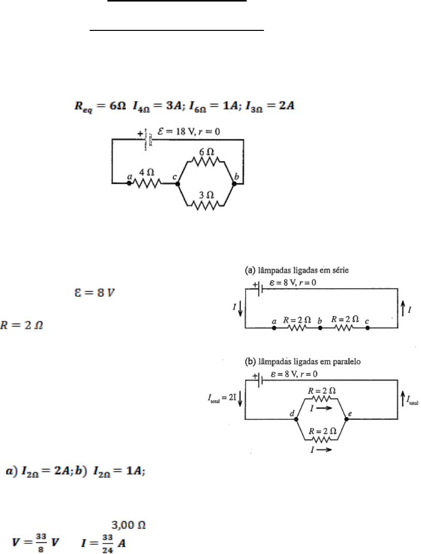 Lista de Exercícios 6 Circuito e Corrente Contínua 1. (Resistência Equivalente) Calcule a resistência equivalente do circuito abaixo e encontre a corrente que passa em cada resistor. A fonte de fem possui resistência interna desprezível. (Respostas: ; ). 2. (Ligação em série versus ligação em paralelo) Duas lâmpadas idênticas devem ser conectadas a uma fonte com fem e resistência interna desprezível. Cada lâmpada possui resistência . Calcule a corrente que passa em cada lâmpada e a potência fornecida a cada lâmpada e o circuito todo, supondo que as lâmpadas sejam ligadas a) em série e b) em paralelo. c) Suponha que uma das lâmpadas se queime, ou seja, seu filamento fica interrompido e a corrente não pode mais fluir por ele. O que ocorre com a outra lâmpada, no caso da ligação em série? E no caso da ligação em paralelo? (Respostas: ) 3. (Associação de resistores) Considere o circuito mostrado na figura ao lado. (a) Encontre a tensão no resistor de . (b) Encontre a corrente no mesmo resistor. (Resposta. a) ; b) ) 4. Na Figura abaixo, a corrente na resistência 6 é i6=1,4A e as resistências são R1=R2=R3=2, R4=16, R5=8 e R6=4. Qual é a f.e.m da fonte ideal? (Resposta: 48,3V) 5. Na figura ao lado as fontes ideais têm forças eletromotrizes e e os resistores têm resistências e . Determine (a) a corrente no circuito; (b) a potência dissipada no resistor 2; (d) a potência fornecida pela fonte 1; (e) a potência fornecida pla fonte 2. (f) A fonte 1 está fornecendo ou recebendo energia? (g) A fonte 2 está fornecendo ou recebendo energia? (Respostas: a) ; b) ; c) ; d) ; e) ; f) fornecendo; g) recebendo). 6. A figura mostra um circuito com mais de uma malha formado por uma fonte ideal e quatro resistências com os seguintes valores: R1= 20 Ω, R2= 20 Ω, R3= 30 Ω, R4= 8,0 Ω, ε= 12 V. Qual é a corrente na fonte? (Resposta: 0,30 A) 7. Uma pilha comum de lanterna pode fornecer uma energia da ordem de antes de se esgotar. (a) Se uma pilha custa , quanto custa manter acesa uma lâmpada de durante usando pilhas? (b) Quanto custa manter acessa a mesma lâmpada usando a eletricidade da tomada se o preço da energia elétrica é por quilowatt-hora? (Resposta. (a) $ 320; (b) $0,048) 8. Determine a resistência equivalente entre os pontos A e B. Se a diferença de potencial entre A e B é de , determine a corrente e a diferença de potencial no resistor de . (Resposta. I=55/44 A; V=10 V) 9. A figura mostra um circuito cujos elementos têm os seguintes valores: As três fontes são ideais. Determine o sentido das correntes nos três ramos. 10. O circuito indicado na figura ao lado contem dois resistores e duas baterias, cada uma delas com uma fem e uma resistência interna. Calcule (a) a corrente no circuito, (b) a diferença de potencial Vab e (c) a potência de cada fem. 11. (Carga um capacitor) Um resistor com resistência de 10 MΩ é conectado em série com um capacitor cuja capacitância é de 1,0 F e com uma bateria de fem igual a 12,0 V. Antes de a chave ser fechada no instante t = 0, o capacitor está descarregado. a) Qual é a constante de tempo? b) Qual é a fração da carga final que está sobre a das placas quando t = 46 s? c) qual é a fração de corrente inicial que permanece quando t = 46 s? (Respostas: t = 10 s; 0,99; 0,010) 12. (Descarga um capacitor) O resistor e o capacitor do exercício anterior são conectados novamente, como indica a figura abaixo. Antes de a chave ser fechada, o capacitor foi carregado com uma carga igual a 5,0 C. A seguir a chave é fechada no instante t = 0 s e o capacitor começa a se descarregar. a. Em que instante a carga do capacitor é igual a 0,50 mC? B. Qual é a corrente neste instante? 13. Um resistor de 15 K e um capacitor de 20 F são ligados em série, e uma ddp de 12V é aplicada bruscamente ao conjunto. (a) Calcule a constante de tempo do circuito. (b) Determine a carga do capacitor após 150ms; (c) Determine a corrente após 300ms. (Respostas: a) 0,3s; b) 9,44.10-5C; c)2,94.10-4ª) IMPORTANTE: As questões das Listas de Exercícios foram retiradas das referências bibliográficas abaixo. As listas não substituem os livros-texto. HALLIDAY, D.; RESNICK, R.; WALKER, J. Fundamentos de Física: Eletromagnetismo. 8 ed. Rio de Janeiro: LTC, 2009. JEWETT JR, J. W.; SERWAY, R. A. Física para cientistas e engenheiros: Eletricidade e magnetismo. São Paulo: Cengage Learning, 2011. TIPLER, P. A. Física para Cientistas e Engenheiros. Vol. 3. Rio de Janeiro: LTC, 2008. YOUNG, H. D; FREEDMAN, R. A. Física III: Eletromagnetismo. 12 ed. São Paulo: Addison Wesley, 2009.