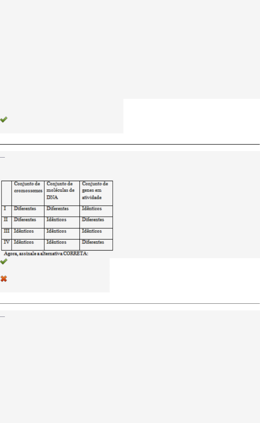As células especializadas de um organismo pluricelular são capazes de alterar seu padrão de expressão gênica sob ação de estímulos externos. Imagine que você comeu um frango contaminado com "Salmonella sp", uma bactéria causadora de infecção intestinal. Analise as sentenças a seguir: I- A bactéria estimula os linfócitos B a expressarem os genes responsáveis pela produção de anticorpos. II- Os anticorpos não estão relacionados à defesa do organismo. III- Os linfócitos B só são estimulados na presença de um vírus. IV- Os genes responsáveis pela produção de anticorpos são transcritos para que as proteínas neutralizem a "Salmonella sp". Agora, assinale a alternativa CORRETA: a) As sentenças I e III estão corretas. b) As sentenças II, III e IV estão corretas. c) As sentenças I e IV estão corretas. d) Somente a sentença II está correta. 2. As células do nosso corpo são classificadas em células somáticas, que apresentam dois lotes cromossômicos, sendo diploides (2n); e em células germinativas que originam os gametas, que apresentam um lote cromossômico, sendo haploides (n). Ao compararmos células somáticas de diferentes tecidos do corpo de uma pessoa, encontramos: a) Somente a opção IV está correta. b) Somente a opção II está correta. c) Somente a opção III está correta. d) Somente a opção I está correta. 3. Para que a síntese proteica ocorra, são necessários vários componentes celulares trabalhando juntos, como mostra a figura a seguir. Com base na imagem, classifique V para as sentenças verdadeiras e F para as falsas: ( ) O esquema mostra a síntese proteica em uma célula procarionte. ( ) Os tipos de RNA necessários para a síntese proteica em procariotos e eucariotos são essencialmente diferentes. ( ) Na expressão de um gene eucariótico, a transcrição e a tradução ocorrem ao mesmo tempo. ( ) Uma molécula de RNAm pode ser utilizada para a síntese concomitante de outras moléculas de proteína. Agora, assinale a alternativa que apresenta a sequência CORRETA: FONTE DA IMAGEM: Disponível em: <http://s3.amazonaws.com/magoo/ABAAAAtmMAJ-0.jpg>. Acesso em: 8 jul. 2013. a) V - F - V - V. b) V - V - F - F. c) F - V - V - F. d) F - F - F - V. 4. Na natureza há dois tipos de ácidos nucleicos, o DNA e o RNA. Há um sistema de comunicação entre eles para garantir que as informações sejam mantidas dentro da célula, em forma de código genético. Quanto aos ácidos nucleicos DNA e RNA, analise as seguintes sentenças: I- No DNA as bases nitrogenadas se ligam entre adenina (A) ? timina (T), citosina (C) ? guanina (G). II- No RNA as bases nitrogenadas se ligam entre adenina (A) ? uracila (U), citosina (C) ? guanina (G). III- O DNA pode ser encontrado no núcleo celular. IV- O RNA pode ser encontrado na membrana, citoplasma e núcleo da célula. Agora, assinale a alternativa CORRETA: a) As sentenças I, II, e III estão corretas. b) As sentenças III e IV estão corretas. c) As sentenças I e IV estão corretas. d) As sentenças I, III e IV estão corretas. 5. A tradução gênica é o processo pelo qual as informações contidas nas sequências de nucleotídeos dos RNA mensageiros são utilizadas para produzir proteínas. Sobre a tradução, classifique V para as sentenças verdadeiras e F para as falsas: ( ) O anticódon e o códon não interagem no momento da síntese proteica. ( ) É imprescindível a associação entre o RNAm ao ribossomo. ( ) Os ribossomos são componentes fundamentais para que a tradução ocorra. ( ) Cada proteína produzida tem uma função específica no organismo. Agora, assinale a alternativa que apresenta a sequência CORRETA: a) V - F - F - V. b) V - F - V - F. c) F - V - F - F. d) F - V - V - V. 6. Em 1987 foi fundado o Projeto Genoma, cujo propósito era decifrar e mapear o código genético humano. Além disso, essas informações seriam armazenadas em um banco de dados. Com essas informações em mãos, tornar-se-ia mais fácil identificar doenças genéticas e desenvolver medicamentos para tratamento e cura de diversas doenças, além de auxiliar na prevenção delas. Com base no exposto, analise as seguintes sentenças: I- Os genes são formados por ácido desoxirribonucleico e controlam a produção de proteínas da célula. II- Todas as células do corpo têm a mesma coleção de genes; apesar disso, encontramos células com formas e funções diferentes. III- As mudanças na programação genética de um indivíduo não alteram a produção de proteínas, nem as suas características. IV- A mutação é uma alteração do código genético de um organismo e pode ser provocada por radiações ou substâncias químicas. Agora, assinale a alternativa CORRETA: a) As sentenças I, II e IV estão corretas. b) As sentenças II, III e IV estão corretas. c) As sentenças I, III e IV estão corretas. d) As sentenças I, II e III estão corretas. 7. Para que a enzima denominada RNA polimerase consiga encontrar o ponto de início de transcrição, ela necessita de proteínas responsáveis por se ligar à sequência de DNA (promotores) que caracterizam o local de início da transcrição. Como são conhecidas essas proteínas? a) Fatores de transcrição. b) Sequências regulatórias de RNA. c) Sequências regulatórias de DNA. d) Transcrição gênica. 8. Sabe-se que o gene é a unidade fundamental da hereditariedade, sendo muito importante para controlar o metabolismo celular. Sobre o gene, assinale a alternativa CORRETA: a) É o conjunto de moléculas de DNA de um indivíduo. b) É a trinca de bases do RNA responsável pela tradução. c) É o mesmo que cromossomo, onde estão as informações gênicas. d) É a sequência de nucleotídeos de DNA que codifica uma proteína. 9. O ácido nucleico é formado pela união de nucleotídeos e apresenta em sua constituição uma molécula de ácido fosfórico, um açúcar (pentose) e as bases nitrogenadas. Considerando a imagem a seguir, que representa um