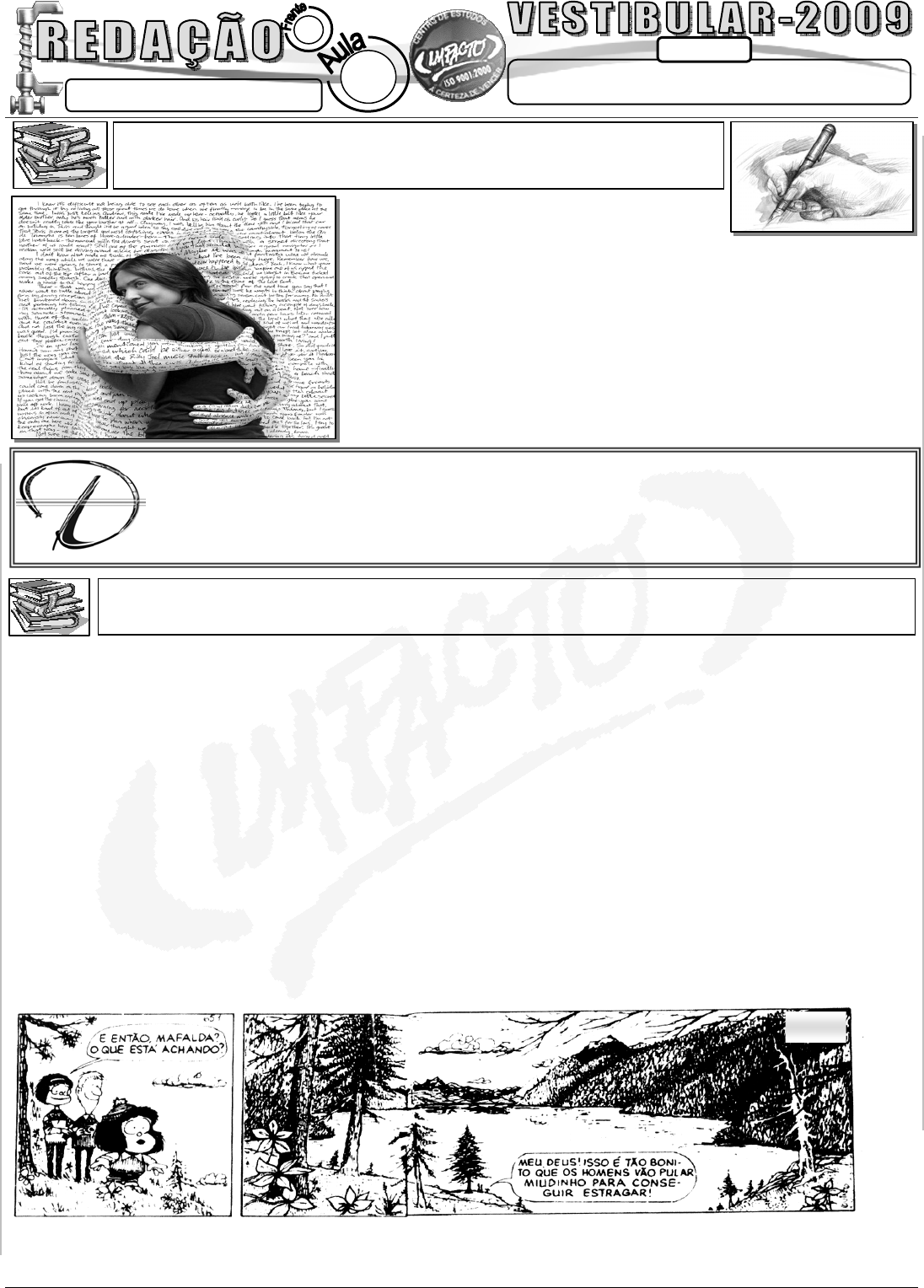 GE120208 – PE(MT) / SF(MT) / AC(MT) / CN (MT) Noções sobre Tipos e Gêneros Textuais FAÇO IMPACTO - A CERTEZA DE VENCER!!! PROFº: ROSE CUNHA Fa le c on os co w w w .p or ta lim pa ct o. co m .b r VE ST IB UL AR – 2 00 9 CONTEÚDO A Certeza de Vencer 01 1 PROPOSTAS DE REDAÇÃO PROPOSTA 01: turista que visita a Amazônia deve levar na bagagem uma dose generosa de repelente de mosquitos. Também precisa ter na mala uma minifarmácia, com os remédios que costuma tomar regularmente. Na selva não há uma farmácia em cada esquina. [...] Para os passeios na floresta, camisetas de manga longa e calças de moletom protegem contra arranhões e picadas de insetos. De janeiro a maio, época de chuvas, é um aguaceiro tremendo. O melhor período é entre junho e julho. Nesses meses, os rios atingem seu ponto de cheia e permitem o acesso de barco a regiões belíssimas da floresta. Imagine como um repórter que visita a Amazônia pela primeira vez, nos dias de hoje. FAÇA UM RELATO DE SUA VIAGEM, DESDE QUANDO VOCÊ SAIU ATÉ A VOLTA. DESCREVA O QUE VIU, O QUE DESPERTOU SUA ATENÇÃO, O QUE MAIS IMPRESSIONOU, ALGUMA PERIPÉCIA PERIGOSA OU ENGRAÇADA. O Existem basicamente três tipos de texto: descrição, narração e dissertação. De maneira simples, poder-se-ia dizer que a descrição é o registro de características de objetos, de pessoas, de lugares; a narração é um relato de fatos contados por um narrador, envolvendo personagens, localizadas no tempo e no espaço; e a dissertação é a expressão de opinião a respeito de um assunto Na prática, não é simples assim: esses tipos de texto se misturam. É possível a identificação de elementos descritivos, narrativos e dissertativos num mesmo texto, com predomínio de uns ou de outros. O relato de uma viagem, por exemplo, poderá ser predominantemente narrativo, mas também incluir descrições de pessoas e lugares visitados e ter como fecho uma reflexão sobre a importância do lazer na vida das pessoas, um elemento dissertativo, portanto. escrever, narrar e dissertar “são, na verdade, as três formas básicas com que, em nossa vida quotidiana, desvendamos as situações reais, as situações imaginárias, o entrelaçamento daquilo que chamamos dia-a-dia e daquilo que chamamos fantasia, na e pela linguagem, trata-se das várias linguagens da linguagem, da diversidade de procedimentos através dos quais vamos encorpando e solidificando a nossa capacidade de expressão. [...]”. (Emilia Amaral e Severino Antônio. Novíssimo curso vestibular – Redação I. São Paulo: Nova Cultural. 1990.p.2.) No processo de leitura e construção de sentido dos textos, levamos em conta que a escrita/fala baseiam-se em formas padrão e relativamente estáveis de estruturação e é por essa razão que, cotidianamente, em nossas atividades comunicativas, são incontáveis as vezes em que não somente lemos textos diversos, como também produzimos ou ouvimos enunciados, tais como: “escrevi uma carta”, “rebeci o e-mail”, “achei o anúncio interessante”, “o artigo apresenta argumentos consistentes”, “fiz o resumo do livro”, “a poesia é de um autor desconhecido”, “li o conto”, “ a piada foi boa”, “que tirinha engraçada”!, “a lista é numerosa”. E a lista é numerosa mesmo! (história em quadrinhos, tirinha, charge, crônica, miniconto, fábula, poesia, anuncio, cartaz, artigo de opinião, artigo de divulgação científica, piada, bula, horóscopo, dentre outros) Tanto que estudiosos que objetivaram o levantamento e a classificação de gêneros textuais desistiram de fazê-lo, em parte porque os gêneros existem em grande quantidade, em parte porque os gêneros, como práticas sociocomunicativas, são dinâmicos e sofrem variações na sua constituição, que, em muitas ocasiões, resultam em outros gêneros, novos gêneros. (Ler e COMPREENDER – os sentidos do texto/ Ingedore Villaça Koch; Vanda Maria Elias) (Idem.) (Q ui no . M af al da , 4 . M ar tin s Fo nt es , ou t. 19 90 .) TIPOS DE TEXTO GÊNERO FAÇO IMPACTO – A CERTEZA DE VENCER!!! Fa le c on os co w w w .p or ta lim pa ct o. co m .b r VE ST IB UL AR – 20 09 No texto anterior, alguém conta fatos acontecidos consigo mesmo. Trata-se de uma mulher, que relata um momento de grande tensão psicológica, quando, ao ver uma pessoa morta na própria cama, identifica nela a sua própria imagem. A descrição das roupas e dos traços físicos, “envelhecidos e degradados”, sugere a possibilidade de uma descrição psicológica: aquela figura patética, aquele rosto escondido por uma pintura vulgar, a decadência física ali estampada estariam simbolizando outro lado de sua personalidade? Ou tudo não passaria de uma alucinação. CONTE ESTE FATO A PARTIR DA ÚLTIMA IDÉIA DO TEXTO. PROPOSTA 03: (UFBA-BA) PROPOSTA 02: Uma noite, ao receber a visita de uma amiga, lembrei-me de lhe emprestar um romance. Fora a minha leitura da véspera e eu o deixaria na mesinha de cabeceira. Subi a escada, e entrei no quarto. Curioso, alguém acendera a luz... E, no entanto, eu estava certa de que ninguém subira. Caminhei intrigada, pressentindo qualquer acontecimento... Olhei minha cama e vi nela uma mulher deitada. Uma mulher... morta – ela estava morta! Tinha um horrível vestido de lantejoulas de todas as cores. E aparecia coberta de jóias baratas. Suando frio, procurando dominar o coração desordenado, cheguei mais perto. Meu Deus! Aquela face nojentamente pintada era a minha própria face! Como se alguém fizesse de mim um retrato da degradação... Meu próprio rosto... mais velho – muito mais velho! – com maquiagem de atriz decadente! Queria gritar... chamar todos... Não me foi possível. Fiquei fascinada, encarando aquele meu próprio eu degradado e envelhecido, coberto de jóias. De súbito, à altura do coração, de sob as lantejoulas, principiou a correr um esguicho de sangue, que ia engrossando, que se tornava maior. Nele iam submergindo 