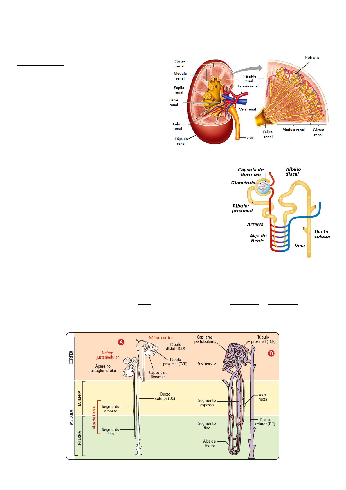 Fisiologia Humana Sistema Renal Introdução a Fisiologia Renal SISTEMA RENAL: - Rins: Cápsula, Córtex (néfrons e glomérulo), Medula (pirâmides renais, ducto coletor, alça de Henle e vasos retos), Papila e cálice - Pelve renal; - Ureter; - Bexiga; - Uretra - Artéria renal; - Veia renal; - Glândula adrenal (glândula anexa) NÉFRON: unidade filtradora renal - Túbulo Contorcido Proximal: reabsorção de íons, água e nutrientes do filtrado glomerular (célula com borda em escova) - Alça de Henle (Segmentos: Fino Descendente e Ascendente; Grosso Ascendente) Segmento fino descendente: reabsorção de água Segmentos ascendentes fino e grosso: reabsorção de NaCl (Fino por difusão; Grosso por co-transportador 1Na-2Cl-1K) - Túbulo Contorcido Distal: regula o pH e a concentração de K+ e de NaCl - Ducto Coletor: formação da urina a partir do processamento final do filtrado (células principais reabsorvem NaCl e secretam K+; células intercaladas regulam o balança ácido-básico) - Componentes Vasculares Néfron: glomérulo, arteríola eferente, capilares peritubulares e vasos retos TIPOS DE NÉFRONS (se diferenciam pela estrutura da Alça de Henle): Néfrons Corticais: associado com a alça néfrica curta, adentra apenas em uma pequena porção da medula Segmento fino descendente é curto; Segmento fino ascendente é muito curto ou inexistente e Segmento grosso ascendente é curto. Néfrons Justamedulares: associado com a alça néfrica longa, adentra profundamente na medula Segmento fino descendente é longo; Segmento fino ascendente e Segmento grosso ascendente 2019 Luiza Lese Pereira Fisiologia Humana Sistema Renal FORMAÇÃO DA URINA: A formação da urina resulta da filtração glomerular, reabsorção tubular e secreção tubular. A formação da urina começa quando uma grande quantidade de líquido é filtrada dos capilares glomerulares para o interior da cápsula de Bowman, havendo depois a reabsorção de substâncias dos túbulos renais para o sangue e a secreção de substâncias do sangue para os túbulos renais. Cada um dos processos é regulado de acordo com as necessidades corporais. RIM ENDÓCRINO: produção e secreção de renina, calcitriol e eritropoietina - renina: ativa o SRAA → PA e balanço Na - calcitriol: absorção de Ca - eritropoietina: estimula a formação de eritrócitos CORPÚSCULO RENAL: ocorre o processo inicial de filtração - Glomérulo: emaranhado de capilares fenestrados; permite a passagem de pequenas moléculas (filtrado) - Cápsula de Bowman: formada por dois folhetos (visceral ou interno e parietal ou externo - com fendas estreitas) - Espaço capsular: espaço entre os folhetos; recebe o líquido filtrado (composição semelhante ao sangue, exceto sem células sanguíneas e proteínas) que passou pelas fendas da camada externa APARELHO JUSTAGLOMERULAR: - Mácula densa: células sensíveis à osmolaridade do líquido presente na luz do TCD, e regulam o diâmetro da arteríola aferente e a secreção de renina - Células justaglomerulares: células granulares que secretam renina; estão na porção da arteríola aferente que entra em contato com a mácula densa - Células mesangiais: estão entre as arteríolas aferente e eferente CAMINHO PERCORRIDO: 2019 Luiza Lese Pereira Fisiologia Humana Sistema Renal MECANISMOS RENAIS DE MANIPULAÇÃO DO PLASMA: (1) FILTRAÇÃO GLOMERULAR: parte do sangue que extravasa para a Cápsula de Bowman (cerca de 20%) (2) SECREÇÃO TUBULAR: retirada das substâncias (no néfron) que eventualmente não foram filtradas e que precisam ser excretadas; são lançadas para a luz do túbulo. (3) REABSORÇÃO TUBULAR: retirada das substâncias da luz tubular que precisam ser preservadas; lançando de volta para o Sistema Venoso Renal. Somente substâncias que foram filtradas, secretadas e não absorvidas serão excretadas (4). Filtração Glomerular A filtração glomerular ocorre basicamente pela (a) permeabilidade seletiva da membrana de filtração e (b) existência uma pressão favorável ao extravasamento de parte desse sangue. A membrana de filtração é formada pelo endotélio vascular glomerular (que é do tipo fenestrado), pela membrana basal, que reveste o endotélio, e pelos podócitos, células que formam o epitélio visceral (com fendas) da CB. A presença de fenestras endoteliais e fendas de filtração torna a membrana permeável, e somente substâncias selecionadas (capazes de passá-la) é que serão filtradas. Ultrafiltrado = filtrado glomerular A membrana basal possui carga negativa, portanto, repele grandes ânions como as proteínas plasmáticas. Todas as substâncias que estão dissolvidas no plasma são filtradas, exceto a maioria das proteínas plasmáticas (por causa da membrana basal). Então, o filtrado que chega à Cápsula de Bowman é muito semelhante ao plasma. As proteínas não filtradas ficam retidas no glomérulo. A pressão efetiva da filtração glomerular (PEF) é determinada pelas Forças de Starling. São elas: Pressão hidrostática glomerular (Ph): criada pelos batimentos cardíacos (PA); é a pressão do líquido no interior do capilar glomerular; permite o extravasamento de cerca de 20% do plasma para o interior da CB Pressão hidrostática capsular (Pc): força que o líquido extravasado exerce contra a filtração Pressão coloidosmótica (Po): força que a proteínas não filtradas retidas no glomérulo exercem contra a filtração 2019 Luiza Lese Pereira Fisiologia Humana Sistema Renal Elas se relacionam da seguinte maneira: a Ph favorece a filtração, enquanto a Pc e a Po a desfavorecem. Ph é a variável a ser controlada, pois as demais são derivadas desta!; sendo que ela varia de acordo com as necessidades do organismo e independentemente da função tubular renal. PEF = Ph - (Pc + Po) A quantidade de filtrado formado por minuto é dada pela taxa de filtração glomerular (TFG), sendo esta o produto entre o coeficiente de filtração capilar (k) e a PEF. O