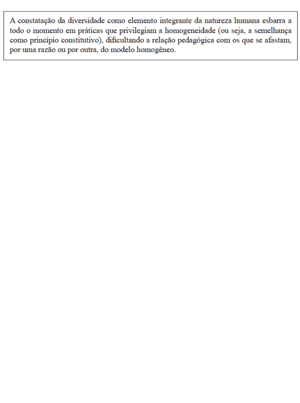 QUESTÃO 1 A alternativa que melhor explica a frase acima é: a ) a diferença entre um aluno e outro entra em conflito com práticas pedagógicas, que são organizadas considerando que todos os alunos aprendem da mesma maneira. b ) a escola não deve considerar a diversidade do alunado. c ) de fato não há diferença entre um aluno e outro, por isso as práticas pedagógicas que privilegiem a homogeneidade são as mais adequadas. d ) a escola deve considerar a diversidade do alunado, mas isso não tem relação com a prática pedagógica baseada num modelo homogêneo. QUESTÃO 2 Os estudos de Gardner dizem que a ) adultos que tiveram lesão cerebral têm perda total de suas competências, independente da dimensão do dano. b ) todos têm o mesmo potencial de inteligência, sendo que podem desempenhar qualquer função sem dificuldades. c ) adultos que tiveram lesão cerebral têm perda de algumas competências sem que outras sejam comprometidas. d ) todos têm a competência linguística mais desenvolvida, pois todos falam. QUESTÃO 3 O que devemos fazer quando o aluno está tendo uma crise convulsiva? a ) Não podemos fazer nada para ajudar quando um aluno está tendo a crise e não podemos tocar na sua saliva, pois essa doença é contagiosa. b ) Podemos chamar os pais e pedir para levarem a criança embora. c ) Proteger a cabeça, virando-a para o lado; não colocar nada em sua boca, controlar o tempo de crise. Após a crise, deixar a criança dormir e relaxar. d ) Ficar muito assustados, pois isso é perigoso. Levantar a criança e tentar acordá-la, colocando uma colher em sua boca, para que ela não enrole a língua. QUESTÃO 4 O que é epilepsia? a ) É a desordem crônica do cérebro, e as suas características clínicas associadas às alterações eletroencefalográficas em fenômenos psíquicos, motores, sensoriais e sensitivos anormais. b ) É a desordem crônica do cérebro, e as suas características clínicas não apresentam alteração físicas ou emocionais, podendo apresentar exames encefalográficos normais e com boa funcionalidade. c ) Uma condição normal que não requer nenhum tipo de cuidado especial. As pessoas acometidas dessa patologia podem assumir qualquer função mesmo em tempo de crise. d ) Uma doença grave que pode contaminar outras pessoas, não tem cura nem tratamento. QUESTÃO 5 A inclusão é um fato. Que fatores estão envolvidos nela? a ) Fatores sociais, emocionais, políticos, culturais, educacionais e direitos humanos. b ) Somente o fator social. c ) Está relacionada simplesmente aos direitos humanos. d ) O único fator que está relacionado à inclusão é o educacional. QUESTÃO 6 A teoria das inteligências múltiplas diz que a ) existem duas inteligências importantes no contextos escolar: a lógico-matemática e a linguística. b ) o professor deve desenvolver estratégias educacionais que contemplem todas as inteligências dos alunos. c ) temos as mesmas inteligências por isso somos todos iguais. d ) o professor deve investir em desenvolver mais a inteligência linguística, mesmo que essa não seja a maior habilidade do aluno, pois ela é a mais importante no desenvolvimento do sujeito. QUESTÃO 7 A expressão diversidade na ensinagem quer dizer que a ) ensinar é muito difícil em função da diversidade do alunado. b ) para aprender de forma diferente, é necessário ensinar de forma diferenciada. c ) aprender e ensinar são palavras diferentes. d ) certos alunos têm dificuldades de aprendizagem. QUESTÃO 8 Que cuidados devemos ter quando pensamos em prevenção? a ) Tomar a vacina da rubéola, pois ela vai evitar todos os tipos de deficiência. b ) Fazer o teste do pezinho já é o bastante. c ) Fazer o pré-natal, contar com a presença do pediatra neonatologista e, após o nascimento, fazer o teste do pezinho etc. d ) Todas as deficiências têm causas genéticas e por isso não podemos preveni-las. Então, não adianta ter cuidados, pois não podemos controlar nenhuma deficiência. QUESTÃO 9 A teoria comportamental cognitiva postula que os comportamentos a ) são fruto do conteúdo inconsciente. b ) não têm sua base na aprendizagem social, o meio não tem influência. c ) têm sua base na aprendizagem social. d ) são unicamente respostas dos estímulos do ambiente. QUESTÃO 10 Sobre o preconceito é correto afirmar que a ) é uma tentativa de enfrentar emoções intensamente dolorosas como o medo e a ansiedade, diante de alguma coisa que não conhecemos bem, uma opinião precipitada. b ) nem sempre é prejudicial, pois as pessoas de forma geral não se incomodam com ele sem motivos para haver inclusão. c ) é algo muito abstrato, mas, no entanto, é fácil de ser vencido. d ) os professores não têm preconceitos, pois estão acostumados com as diferenças