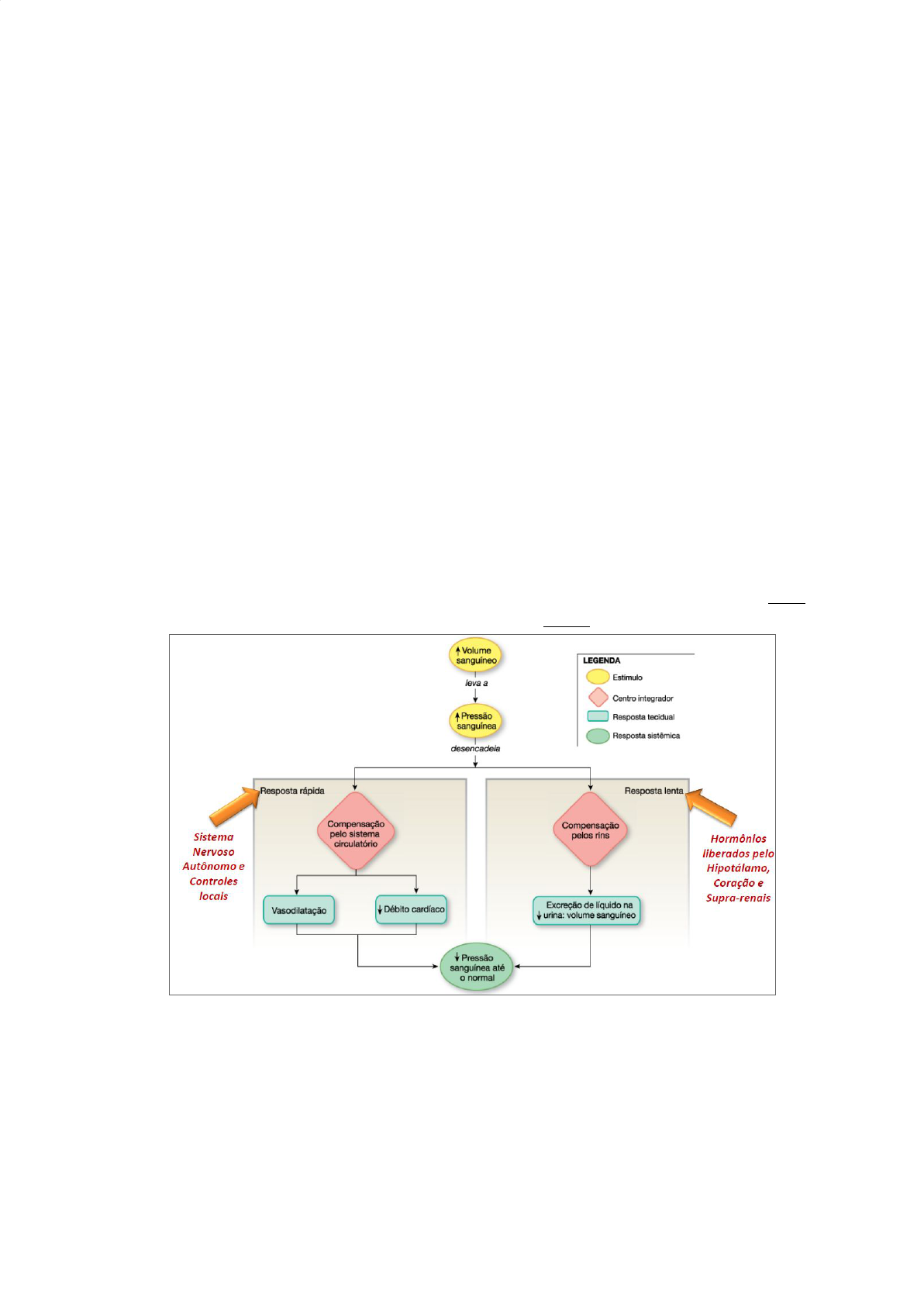 Fisiologia Humana Sistema Circulatório CONTROLE DA PRESSÃO ARTERIAL A pressão arterial pode ser definida como a força que o sangue, impulsionado pelo coração, exerce contra as paredes das artérias por onde circula, uma pressão indispensável para que este possa circular até aos capilares e alcançar todos os tecidos periféricos. A PA depende de dois fatores básicos: o DC e a RVP. O DC é a quantidade de sangue bombeado pelo VE, por minuto, para as artérias. O RVP é a oposição dos vasos sanguíneos à circulação do sangue. Existem mecanismos de regulação que permitem adaptar a PA Às necessidades fisiológicas de cada momento. ↑ DC ou ↑ RVP (vasoconstrição periférica): ↑ PA ↓ DC ou ↓ rvp (vasodilatação periférica): ↓ PA Quanto maior a RVP, menor o fluxo sanguíneo. Mecanismos de Controle da PA O controle da PA pode ser feito em curto prazo (resposta rápida; em 1 ou 2 segundos) ou a longo prazo (resposta lenta; meses, anos, décadas). O SNA é encarregado de realizar o controle em curto prazo da PA, enquanto os rins são encarregados de fazer o controle em longo prazo da PA LOCAL (RÁPIDO): miogênicos, metabólicos (O2, CO2, pH…), parácrinos/autócrinos, temperatura NEURAL (RÁPIDO): mecanorreceptores e quimiorreceptores arteriais, receptores cardiopulmonares, outros receptores (renais, termorreceptores, musculares esqueléticos) RENAL/HORMONAL (LENTO): catecolaminas, vasopressina (ADH), SRAA, ocitocina 2019 Luiza Lese Pereira Fisiologia Humana Sistema Circulatório Controle Neural da PA CIRCUITO NEURAL: Diâmetro arteriolar: controlado pela liberação tônica de noradrenalina. Barorreceptores: receptores sensoriais presentes nas paredes da aorta (aórticos) e carótidas (carotídeos) que detectam a pressão sanguínea. A partir dos barorreceptores origina-se o axônio do neurônio sensorial, que se projeta até o corpo celular de neurônios dentro do tronco encefálico. A ativação dos barorreceptores estimula o neurônio sensorial, estabelecendo uma sinapse excitatória entre os dois diferentes neurônios. Os neurônios do tronco encefálico enviam axônios que inibem o SNS (diminuição da liberação de noradrenalina no coração e de adrenalina nos vasos), ao mesmo tempo que estimulam o SNP (aumento da liberação da Ach no coração). 2019 Luiza Lese Pereira Fisiologia Humana Sistema Circulatório MECANISMO DE CONTROLE NEURAL: AUMENTO RÁPIDO DA PA causa uma diminuição da liberação da noradrenalina nas arteríolas resulta numa vasodilatação, o que ↓ RTP; e no coração, em conjunto com o aumento da liberação de Ach, diminui o automatismo e a contratilidade cardíaca, ↓ o DC. Essa diminuição do RTP e do DC leva a diminuição da PA. 2019 Luiza Lese Pereira Fisiologia Humana Sistema Circulatório DIMINUIÇÃO RÁPIDA DA PA não causa o estiramento nas paredes da aorta e nas carótidas, não ativando os barorreceptores e, portanto, não emitindo PotA nem estimulando o tronco encefálico. A liberação de noradrenalina aumenta, promovendo uma vasoconstrição das arteríolas, o que ↑ RTP; e um aumento do automatismo e da contratilidade cardíaca, ↑ DC; enquanto a liberação de Ach diminui. Esse aumento do RTP e do DC acaba aumentando a PA. 2019 Luiza Lese Pereira Fisiologia Humana Sistema Circulatório Porém, SE A PA SUBIR E SE MANTER ELEVADa, esse mecanismo não será eficaz pois os barorreceptores aórticos e carotídeos ficarão adaptados à pressão elevada, ou seja, irão parar de emitir PotA. Controle Hormonal da PA MEDIADORES SISTÊMICOS (LOCAIS): Hipotálamo e Neurohipófise: vasopressina (ADH) - estimula a reabsorção de água (↑ da PA) Rins: SRAA - vários efeitos sistêmicos (↑ da PA) Coração: peptídeos natriuréticos - estimulam a excreção de Na+ e água (↓ da PA) VOLEMIA: quantidade de sangue circulando em um indivíduo (cerca de 5 litros - adulto) NATRIURESE DE PRESSÃO: eliminação renal de sal pela urina, na qual depende da PA Quanto maior a PA, maior vai ser a natriurese NEUROHIPÓFISE: ↓ volume e ↓ pressão sanguínea : liberação de ADH : ↑ reabsorção de água 2019 Luiza Lese Pereira Fisiologia Humana Sistema Circulatório RINS: ↓ volume e/ou pressão sanguínea : liberação de renina : produção de ang-II : ↑ secreção de aldosterona : ↑ reabsorção de Na+ e água e ↑ excreção de K+ : ↑ volume e pressão sanguíneos REGULAÇÃO DO SRAA: CONTROLE DA LIBERAÇÃO DE ALDOSTERONA: 2019 Luiza Lese Pereira Fisiologia Humana Sistema Circulatório ALDOSTERONA: atua nas paredes do túbulos renais (distais) e ductos coletores. Mantêm o equilíbrio eletrolítico e homeostasia da PA. É importante na manutenção do volume do líquido extracelular pois conserva o Na+ corporal e acelera a excreção de K+. É secretado em resposta à ↓ volume LEC e à ↑ [K+]. Secreção é regulada pelo SRAA. RENINA: catalisa a conversão de angiotensinogênio em ang-I (inativa), que logo é convertida em ang-II. Ang-II estimula a síntese de aldosterona, que estimulará a reabsorção de Na+ pelos rins, restaurando o volume e o conteúdo de Na+ do LEC. ↑ renina no sangue: pode levar a hipertensão pois a renina gera um aumento na PA devido a ativação do SRAA, o qual estimula a reabsorção de Na+ pelos rins. 2019 Luiza Lese Pereira