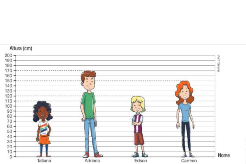 ESCOLA MUNICIPAL EUGENIO GAMA DOS SANTOS Britânia:______ de ________________ de __________. Professora:__________________________________________________. Nome completo:______________________________________________. ATIVIDADE AVALIATIVA DE MATEMÁTICA 1.Tatiana e seus amigos resolveram medir suas alturas. Observe as medidas e escreva, em metro e centímetro, a altura de cada pessoa. Tatiana:______ m e ______ cm Adriano:______ m e ______cm Edson:______ m e _______cm Carmem:______ m e______ cm 2. Qual é a pessoa mais alta e mais baixa? __________________________________________. 3. Quantos centímetros de altura Adriano tem a mais Tatiana? _________________________. Rascunho: 4. A diferença entre a altura de Carmem e Edson é maior ou menor que 50 cm?____________. Rascunho: 5. Escreva o nome das pessoas cuja alturas são maiores que 1 m e 30 cm._________________ _____________________________________________________________________________ 6. Somando a altura de todas as crianças. Quantos metros e quantos centímetros temos? _____________________________________________________________________________ Rascunho: 7. Observe o diagrama e encontre formas geométricas presente no quadro abaixo: 8.Observe e calcule: 9. Escreva os resultados da atividade anterior por extenso:_______________________________________________ ______________________________________________________________________________________________________________________________________________________________________________________________ 10. Na caixa de jogos de de Roberto existem 14 dominós, 12 damas e 6 bingos. Quantos jogos há, ao todo, nessa caixa? A) 1 B) 2 C) 3 D) 4