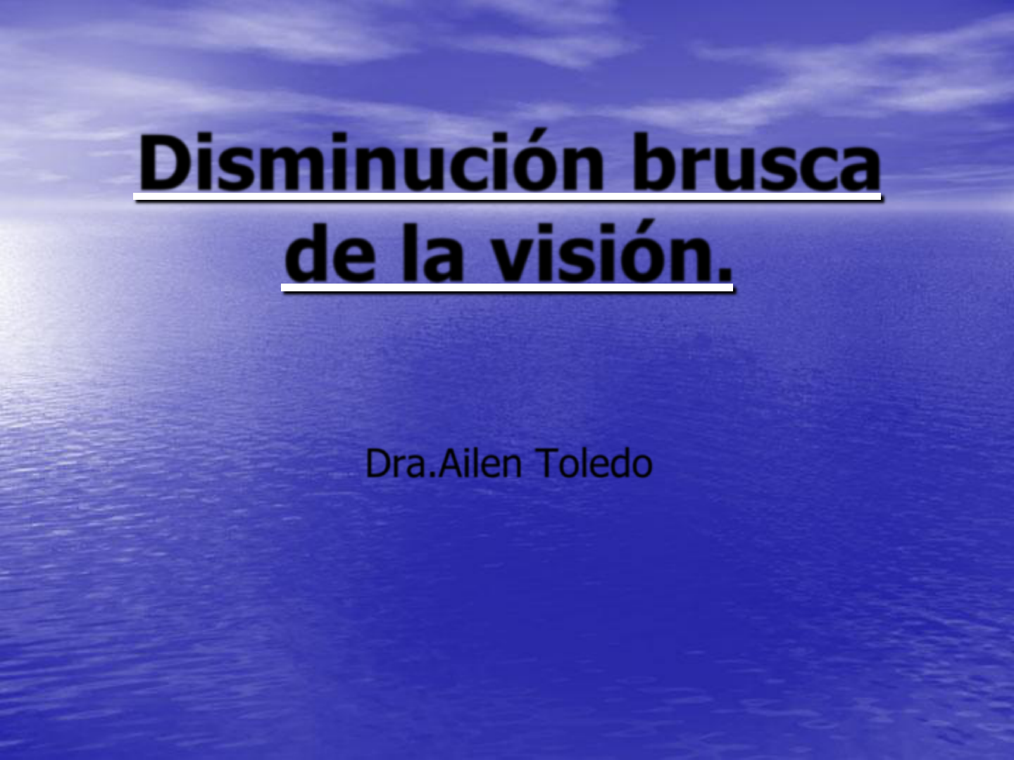 * Disminución brusca de la visión. Dra.Ailen Toledo * OBJETIVOS: Interpretar la causa de la disminución brusca de la agudeza visual. Hacer el diagnóstico presuntivo de la disminución brusca de la agudeza visual. Desarrollar los hábitos y habilidades que permitan la observación de las estructuras oculares a nivel de las cuales puedan producirse la disminución brusca. Indicar el tto inmediato y remisión correcta. * S U M A R I O Glaucoma Agudo, Neuritis Óptica, Desprendimiento de Retina, Obstrucciones Vasculares del Fondo de Ojo, Hemorragia Vítrea. 1.- Concepto. 2.- Etiología. 3.- Síntomas y Signos. 4.- Tratamiento Inmediato. 5.- Remisión al Especialista. * Glaucoma Agudo. Concepto. Pérdida brusca de la visión acompañada de dolor intenso ,aumento de la tensión intraocular y ojo rojo. * MECANISMOS DE CIERRE ANGULAR Anomalías en el tamaño o posición de las estructuras del segmento anterior. Fuerzas anormales en el segmento posterior que alteran la anatomía del segmento anterior ocular. * SINTOMAS. Dolor intenso como punzada de clavo. Pérdida brusca de la visión. Náuseas Vómitos Bradicardia. * SIGNOS Edema intenso de los párpados. Irritación cilio-conjuntival intensa. Edema corneal. Cámara anterior estrecha. Humor acuoso turbio. Midriasis media. Tensión ocular elevada de 45-50mm/hg. Fondo de ojo impreciso. Gonioscopía: Angulo irido corneal cerrado. * Tratamiento. Constituye una urgencia por el peligro de lesión del nervio (atrofia óptica). Analgésico potente , sedante sistémico y tópico. Colirio de pilocarpina 2%.1 gta en el ojo afecto 2 o 3 veces en 1 hora y cada 6 h en el ojo adelfo. Colirio de prednisolona 4 veces /día. Inhibidores de la anidrasa carbónica. Acetozolamida 500mg.bulbo EV /IM 250 mg IM y 250 mg EV. Manitol 20% 1 Fco a 60 gotas/min a durar 1 hora. * Profilaxis Al ojo no afectado instilar Pilocarpina 2% 3 -4 veces al día. Remitir al especialista para valorar tto Qco NO INVASIVO con Yag láser (Iridotomía) en el ojo del cierre, si la transparencia de la cornea lo permite y el ojo adelfo también. Iridectomía Qca si no es posible el Láser. Si el cierre angular fue prolongado y se considera que hay lesión trabecular se realizará una técnica filtrante perforante. * * NEURITIS OPTICA. Concepto.Es la inflamación del nervio óptico en cualquier parte de su extensión que puede abarcar su superficie , grupos de fibras o la totalidad de estas . * Neuritis Óptica Neuritis Óptica Anterior (Papilitis) Neuritis Retrobulbar Entre un 30 y un 60 % la Esclerosis Múltiple es la etiología Es la causa mas común de disminución de la visión por enfermedad del nervio óptico en adultos. Tiene un pico de incidencia entre la tercera y cuarta década de la vida y es vista con mayor frecuencia en mujeres Es una enfermedad donde en ocasiones ni el médico ni el paciente ven absolutamente nada * a) Afecciones Desmielinizantes. -Diabetes mellitus -Deficiencia de vit. B12 -Esclerosis múltiple b) Post infecciosas. -Infecciones endógenas.(infección vírica, extensión de una infección de las meninges o de la órbita). c) Intoxicaciones. - Tabaquismo;Alcoholismo; y algunos fármacos. Etiología. * SINTOMAS Y SIGNOS. Evaluar APP Y actividad laboral. Disminución mas o menos brusca de la visión. (puede llegar a ceguera). Dolor espontáneo alrededor del ojo , sobre todo a los movimientos oculares . Cefalalgia del mismo lado . Dificultad para visión de colores. Escotoma central. * SIGNOS. Borramiento de los bordes papilares o edemas de los mismos. Enturbiamiento del vítreo. * Tratamiento Inmediato Analgésicos y remisión al especialista para el tto específico. TTO específico Antinflamatorios esteroideos o no esteroideos , vitaminoterapia . Tratar la causa. * * DESPRENDIMIENTO DE RETINA. Concepto.Es la separación real entre el epitelio pigmentario retiniano y la retina propiamente dicha o neuroepitelio. Este espacio puede estar ocupado por líquido seroso , sangre , tejido fibroso o un tumor. * Etiología SIMPLES O REGMATÓGENOS SECUNDARIOS. POR TRACCIÓN. * Simples o Regmatógenos Es producido por un agujero o desgarro retiniano provocado por una retina degenerada o atrófica . * Secundarios o no regmatógeno El líquido pasa a través de la coroides a la retina. Se producen como complicación de una patología ocular o general como tumores oculares , retinopatías diabéticas ,siklémica,toxémica del embarazo, por traumatismos oculares, glomerulonefritis crónica, Obstrucción de la vena central de la retina. * Por tracción. Se produce por bandas fibrosas en el vítreo lo que provoca el DR traccional. Las causas más frecuentes son:la retinopatía diabética; cuerpos extraños intraoculares; lesión ocular perforante; pérdida de vítreo después de una cirugía de catarata. * Síntomas y signos. Fotopsias (Visión de relámpago,de puntos brillantes , de luces) Miodesopsias (Visión de moscas volantes o lluvias de puntos negros). Pérdida brusca de una parte del campo visual, no se ve parte de los objetos. Fondo de ojo.Se observa el levantamiento de la retina de color gris con pliegues retinianos con cierta movilidad , los vasos mas oscuros.En un DR total se observa que la retina tiene forma de embudo( queda adherida a la papila y a la ora serrrata).Puede existir hemovítreo. Desgarros. Disminución de la PIO. 5mm/hg en comparación con el otro ojo. * Desprendimiento de retina. * Diagnóstico. Oftalmoscopía directa y la indirecta bajo midriasis máxima. Otras técnicas de valor diagnósticas son Campo visual ,Ecografía , Angiografía fluoresceínica , Diafanoscopía. * Tratamiento. Una vez hecho el diagnóstico debe remitirse el pte al especialista para tto médico y/o Qco. Desprendimiento regmatógeno :Qco Desprendimiento secundario:Se orienta a la corrección del proceso subyacente. Desprendimiento por tracción:Vitrectomía por pars plana. * * Obstrucciones vasculares del fondo de ojo. Oclusión de la arteria central de la retina. Oclusión de 