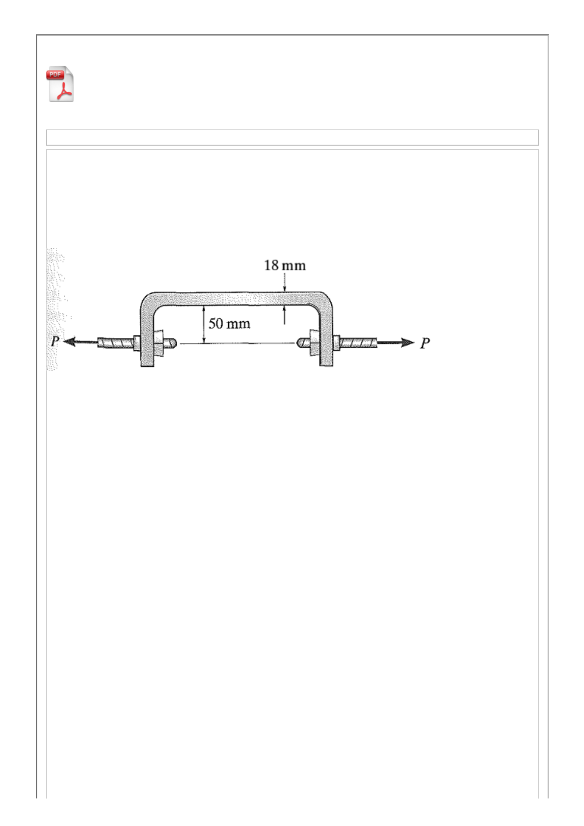 08/12/2018 UNIP - Universidade Paulista : DisciplinaOnline - Sistemas de conteúdo online para Alunos. https://online.unip.br/imprimir/imprimirconteudo 1/10 Exercício 1: O suporte de aço é usado para ligar as extremidades de dois cabos. Se a força P=2,5 kN for aplicada, determine a tensão normal máxima no suporte. O suporte possui espessura de 12 mm e largura de 18 mm. Fonte: HIBBELER, R. C. “Resistência dos Materiais”, São Paulo, Pearson, 7ª edição, 2009. A) 178,95 MPa B) 195,89 MPa C) 239,2 MPa D) 265,89 MPa E) 300,5 MPa Comentários: 08/12/2018 UNIP - Universidade Paulista : DisciplinaOnline - Sistemas de conteúdo online para Alunos. https://online.unip.br/imprimir/imprimirconteudo 2/10 Essa disciplina não é ED ou você não o fez comentários Exercício 2: A força vertical P age na parte inferior da chapa cujo peso é desprezível. Determine a distância máxima d até a borda da chapa na qual aquela força pode ser aplicada de modo a não produzir nenhuma compressão na seção a-a da chapa. Fonte: HIBBELER, R. C. “Resistência dos Materiais”, São Paulo, Pearson, 7ª edição, 2009. A) 50 mm B) 75 mm C) 100 mm D) 125 mm E) 08/12/2018 UNIP - Universidade Paulista : DisciplinaOnline - Sistemas de conteúdo online para Alunos. https://online.unip.br/imprimir/imprimirconteudo 3/10 150 mm Comentários: Essa disciplina não é ED ou você não o fez comentários Exercício 3: Determine o estado de tensão no E na seção transversal a-a. Fonte: HIBBELER, R. C. “Resistência dos Materiais”, São Paulo, Pearson, 7ª edição, 2009. A) tensão normal = 0,75 MPa, tensão de cisalhamento = 1,96 MPa B) tensão normal = -0,75 MPa, tensão de cisalhamento = 1,96 MPa C) 08/12/2018 UNIP - Universidade Paulista : DisciplinaOnline - Sistemas de conteúdo online para Alunos. https://online.unip.br/imprimir/imprimirconteudo 4/10 tensão normal = -1,01 MPa, tensão de cisalhamento = 0 D) tensão normal = -1,01 MPa, tensão de cisalhamento = 1,96 MPa E) tensão normal = 1,01 MPa, tensão de cisalhamento = 1,96 MPa Comentários: Essa disciplina não é ED ou você não o fez comentários Exercício 4: Determine o estado de tensão no ponto A quando a viga está sujeita à força de 4 kN no cabo. Fonte: HIBBELER, R. C. “Resistência dos Materiais”, São Paulo, Pearson, 7ª edição, 2009. A) tensão normal = 0,444 MPa, tensão de cisalhamento = 0,217 MPa B) tensão normal = -0,444 MPa, tensão de cisalhamento = 0,217 MPa 08/12/2018 UNIP - Universidade Paulista : DisciplinaOnline - Sistemas de conteúdo online para Alunos. https://online.unip.br/imprimir/imprimirconteudo 5/10 C) tensão normal = 0,778 MPa, tensão de cisalhamento = 0,217 MPa D) tensão normal = -0,778 MPa, tensão de cisalhamento = 0,217 MPa E) tensão normal = 0,778 MPa, tensão de cisalhamento = 0 Comentários: Essa disciplina não é ED ou você não o fez comentários Exercício 5: A viga de abas largas está sujeita à carga msotrada na figura. Determine as componentes da tensão no ponto A. Fonte: HIBBELER, R. C. “Resistência dos Materiais”, São Paulo, Pearson, 7ª edição, 2009. A) tensão normal = 70,98 MPa, tensão de cisalhamento = 0 08/12/2018 UNIP - Universidade Paulista : DisciplinaOnline - Sistemas de conteúdo online para Alunos. https://online.unip.br/imprimir/imprimirconteudo 6/10 B) tensão normal = -70,98 MPa, tensão de cisalhamento = 0 C) tensão normal = -70,98 MPa, tensão de cisalhamento = 25 MPa D) tensão normal = -105,98 MPa, tensão de cisalhamento = 25 MPa E) tensão normal = 105,98 MPa, tensão de cisalhamento = 25 MPa Comentários: Essa disciplina não é ED ou você não o fez comentários Exercício 6: O guindaste AB consiste em um tubo que é usado para levantar o feise de hastes que tem massa total de 3 toneladas. Se o tubo tiver diâmetro externo de 70mm e 10mm de espessura de parede, determine o estado de tensão que age no ponto C. 08/12/2018 UNIP - Universidade Paulista : DisciplinaOnline - Sistemas de conteúdo online para Alunos. https://online.unip.br/imprimir/imprimirconteudo 7/10 Fonte: HIBBELER, R. C. “Resistência dos Materiais”, São Paulo, Pearson, 7ª edição, 2009. A) tensão normal = -52,1 MPa, tensão de cisalhamento = 0 B) tensão normal = 52,1 MPa, tensão de cisalhamento = 0 C) tensão normal = 52,1 MPa, tensão de cisalhamento = 12 MPa D) tensão normal = 38,8 MPa, tensão de cisalhamento = 12 MPa E) tensão normal = 38,8 MPa, tensão de cisalhamento = 0 Comentários: 08/12/2018 UNIP - Universidade Paulista : DisciplinaOnline - Sistemas de conteúdo online para Alunos. https://online.unip.br/imprimir/imprimirconteudo 8/10 Essa disciplina não é ED ou você não o fez comentários Exercício 7: A haste maciça mostrada abaixo tem raio de 0,75 cm. Se esrtiver sujeita à carga mostrada, determine o estado de tensão no ponto A. Fonte: HIBBELER, R. C. “Resistência dos Materiais”, São Paulo, Pearson, 7ª edição, 2009. A) tensão normal = 214,09 MPa, tensão de cisalhamento = 175,05 MPa B) tensão normal = -214,09 MPa, tensão de cisalhamento = 175,05 MPa C) tensão normal = 214,09 MPa, tensão de cisalhamento = 0 D) tensão normal = -214,09 MPa, tensão de cisalhamento = 0 E) tensão normal = 205 MPa, tensão de cisalhamento = 175,05 MPa 08/12/2018 UNIP - Universidade Paulista : DisciplinaOnline - Sistemas de conteúdo online para Alunos. https://online.unip.br/imprimir/imprimirconteudo 9/10 Comentários: Essa disciplina não é ED ou você não o fez comentários Exercício 8: O painel de sinalização está sujeito à uma carga uniforme do vento. Determine as componentes da tensão no ponto C no poste de sustentação de 100 mm de diâmetro. Fonte: HIBBELER, R. C. “Resistência dos Materiais”, São Paulo, Pearson, 7ª edição, 2009. A) tensão normal = -107 MPa, tensão de cisalhamento 15,3 MPa B) tensão normal = 107 MPa, tensão de cisalhamento 15,3 MPa C) tensão normal = -107 MPa, tensão de cisalhamento 0 D) tensão normal = -