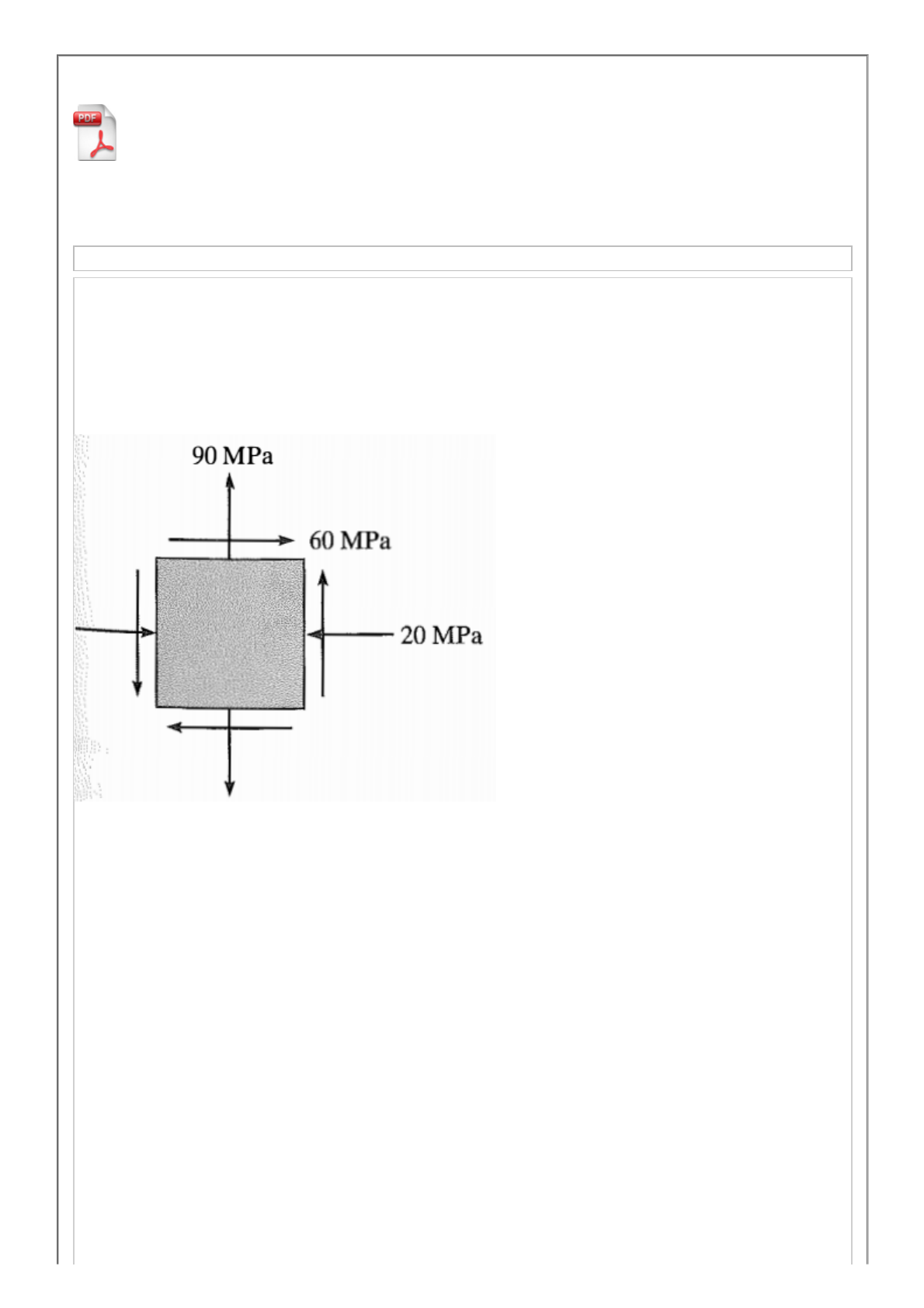 08/12/2018 UNIP - Universidade Paulista : DisciplinaOnline - Sistemas de conteúdo online para Alunos. https://online.unip.br/imprimir/imprimirconteudo 1/9 Exercício 1: O estado plano de tensão em um ponto sobre um corpo é representado no elemento mostrado na figura abaixo.Calcule a tensão de cisalhamento máxima no plano. Fonte: HIBBELER, R. C. “Resistência dos Materiais”, São Paulo, Pearson, 7ª edição, 2009. A) 78,5 MPa B) 81,4 MPa C) 95 MPa D) 08/12/2018 UNIP - Universidade Paulista : DisciplinaOnline - Sistemas de conteúdo online para Alunos. https://online.unip.br/imprimir/imprimirconteudo 2/9 102,6 MPa E) 120,8 MPa Comentários: Essa disciplina não é ED ou você não o fez comentários Exercício 2: Determine o estado de tensão equivalente em um elemento, se ele estiver orientado 30º em sentido anti-horário em relação ao elemento mostrado. Fonte: HIBBELER, R. C. “Resistência dos Materiais”, São Paulo, Pearson, 7ª edição, 2009. A) Tensão normal x'= 0,748 MPa, Tensão normal y'= -1,048 MPa, Tensão de cisalhamento x'y'=0,345 MPa B) Tensão normal x'= -0,748 MPa, Tensão normal y'= -1,048 MPa, Tensão de cisalhamento x'y'=0 MPa C) 08/12/2018 UNIP - Universidade Paulista : DisciplinaOnline - Sistemas de conteúdo online para Alunos. https://online.unip.br/imprimir/imprimirconteudo 3/9 Tensão normal x'= -0,748 MPa, Tensão normal y'= -1,048 MPa, Tensão de cisalhamento x'y'=1,203 MPa D) Tensão normal x'= 0,748 MPa, Tensão normal y'= -1,048 MPa, Tensão de cisalhamento x'y'=1,203 MPa E) Tensão normal x'= 0,748 MPa, Tensão normal y'= 0 MPa, Tensão de cisalhamento x'y'=1,203 MPa Comentários: Essa disciplina não é ED ou você não o fez comentários Exercício 3: Um bloco de madeira falhará, se a tensão de cisalhamento que age ao longo da fibra for de 3,85 MPa. Se a tensão normal em x for de 2,8 MPa. determine a tensão normal de compressão em y que provocará a ruptura. Fonte: HIBBELER, R. C. “Resistência dos Materiais”, São Paulo, Pearson, 7ª edição, 2009. A) -3,589 MPa 08/12/2018 UNIP - Universidade Paulista : DisciplinaOnline - Sistemas de conteúdo online para Alunos. https://online.unip.br/imprimir/imprimirconteudo 4/9 B) -4,598 MPa C) -5,767 MPa D) -7,850 MPa E) -8,259 MPa Comentários: Essa disciplina não é ED ou você não o fez comentários Exercício 4: Uma força axial de 900 N e um trorque de 2,5 N.m são aplicados ao eixo conforme mostrado na figura abaixo. Se o diâmetro do eixo for de 40 mm, determine as tensões principais em um ponto P sobre sua superfície. Fonte: HIBBELER, R. C. “Resistência dos Materiais”, São Paulo, Pearson, 7ª edição, 2009. A) 08/12/2018 UNIP - Universidade Paulista : DisciplinaOnline - Sistemas de conteúdo online para Alunos. https://online.unip.br/imprimir/imprimirconteudo 5/9 tensão principal 1 = -767,7 kPa, tensão principal 2 = 51,5 kPa B) tensão principal 1 = -767,7 kPa, tensão principal 2 = -51,5 kPa C) tensão principal 1 = 125,9 kPa, tensão principal 2 =59,6kPa D) tensão principal 1 = 767,7 kPa, tensão principal 2 = -51,5 kPa E) tensão principal 1 = 352,6 kPa, tensão principal 2 = -25,3 kPa Comentários: Essa disciplina não é ED ou você não o fez comentários Exercício 5: A viga mostrada abaixo está sujeita ap carregamento distribuído de 120 kN/m. Determine as tensões principais na viga no ponto P, que se encontra na parte superior da alma. Considere o momento de inércia I=67,4.10-6 m4. A) 16,5 MPa e - 0 MPa B) -16,5 MPa e -56,6 MPa 08/12/2018 UNIP - Universidade Paulista : DisciplinaOnline - Sistemas de conteúdo online para Alunos. https://online.unip.br/imprimir/imprimirconteudo 6/9 C) 11,5 MPa e 2,3 MPa D) 16,5 MPa e -56,6 MPa E) 19,2 MPa e -64,6 MPa Comentários: Essa disciplina não é ED ou você não o fez comentários Exercício 6: A estrutura mostrada abaixo suporta a carga distribuída de 200 N/m. Determine a tensão normal e a tensão de cisalhamento no ponto D que agem no sentido perpendicular e paralelo às fibras da madeira. Nesse ponto, as fibras formam um ângulo de 30o com a horizontal. Fonte: HIBBELER, R. C. “Resistência dos Materiais”, São Paulo, Pearson, 7ª edição, 2009. 08/12/2018 UNIP - Universidade Paulista : DisciplinaOnline - Sistemas de conteúdo online para Alunos. https://online.unip.br/imprimir/imprimirconteudo 7/9 A) 11 kPa e -22,6 kPa B) -11 kPa e -22,6 kPa C) 11 kPa e -0 kPa D) 26,9 kPa e 22,6 kPa E) -26,9 kPa e 22,6 kPa Comentários: Essa disciplina não é ED ou você não o fez comentários Exercício 7: Calcule as tensões principais e a tensão de cisalhamento máxima no plano para o elemento mostrado abaixo. Fonte: HIBBELER, R. C. “Resistência dos Materiais”, São Paulo, Pearson, 7ª edição, 2009. A) tensões principais: -2,58 MPa, -5,89 MPa 08/12/2018 UNIP - Universidade Paulista : DisciplinaOnline - Sistemas de conteúdo online para Alunos. https://online.unip.br/imprimir/imprimirconteudo 8/9 tensão de cisalhamento máxima: 2,50 MPa B) tensões principais: -5,53 MPa, 0 MPa tensão de cisalhamento máxima: 0 MPa C) tensões principais: 5,53 MPa, 0 MPa tensão de cisalhamento máxima: 4,47 MPa D) tensões principais: 5,53 MPa, -14,47 MPa tensão de cisalhamento máxima: 4,47 MPa E) tensões principais: -5,53 MPa, -14,47 MPa tensão de cisalhamento máxima: 4,47 MPa Comentários: Essa disciplina não é ED ou você não o fez comentários Exercício 8: O elemento en estado plano de tensões está submetido as tensões mostradas abaixo. Determine as tensões que atuam no elemento orientado ao ângulo de 30o em relação ao eixo x, em que o ângulo é positivo quando anti-horário. 08/12/2018 UNIP - Universidade Paulista : DisciplinaOnline - Sistemas de conteúdo online para Alunos. https://online.unip.br/imprimir/imprimirconteudo 9/9 A) tensão normal em x = 119,2 MPa, tensão normal em y = -60,8 MPa e tensão de cisalhamento 5,30 MPa B) tensão normal em x = -119,2 MPa, tensão normal em y = -60,8 MPa e tens