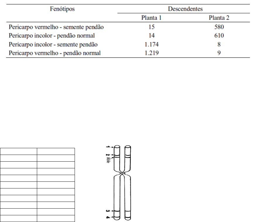Lista de Exercícios - Ligação Gênica e Mapeamento 1. Cruzou-se um diíbrido AaBb com um duplo-recessivo e obteve-se indivíduos com genótipo: 42% dominante-dominante, 8% dominante-recessivo, 8% recessivo- dominante, 42% recessivo-recessivo. a) Qual é a posição dos cromossomos no tipo parental do diíbrido? b) Qual a distância entre os genes A e B? 2. Se em um indivíduo de genótipo AB/ab a distância entre os dois lócus gênicos é de 22 unidades, que genótipo e qual proporção apresentarão os descendentes se ele for cruzado com um duplo recessivo? 3. Se em um indivíduo de genótipo Ab/aB a distância entre os dois lócus gênicos é de 22 unidades, que genótipo e qual proporção apresentarão os descendentes se ele for cruzado com um duplo recessivo? 4. Pericarpo vermelho no milho é decorrente do alelo dominante P, enquanto pericarpo incolor é condicionado pelo alelo recessivo p. Sementes no pendão são decorrentes do alelo recessivo ts2, enquanto pendão normal depende do alelo Ts2. Os resultados obtidos nos cruzamentos testes, envolvendo duas plantas heterozigóticas foram os seguintes: a) Quais os genótipos das plantas um e dois? Os genes estão nas posições cis ou trans? b) Qual a taxa de recombinação entre esses genes? 5. Entre os genes A e B de um indivíduo existe 21% de recombinação. Se os genes estão em posição trans no cromossomo parental. Calcule a quantidade de gametas de cada tipo que deverão surgir em um total de 1000 gametas. 6. Abaixo estão dadas as distâncias entre dois genes. Determine suas respectivas posições no cromossomo abaixo. Genes Distância (cM) CLANG·BINOR 10,7 BINOR·ABLE 2,8 ABLE·FONG 72,6 ABLE·CLANG 13,5 FONG·EBRAC 8,4 FONG·BINOR 75,4 FONG·CLANG 86,1 EBRAC·ABLE 81,0 EBRAC·BINOR 83,8 EBRAC·CLANG 94,5 7. As distâncias-mapa para seis genes no segundo grupo de ligação do bicho-da-seda, Bombyx mori, são mostrados na tabela abaixo. Determine a ordem dos genes no cromossomo (faça o mapa genético). Gr Rc S Y P oa Gr - 25 1 19 7 20 Rc 25 - 26 6 32 5 S 1 26 - 20 6 21 Y 19 6 20 - 26 1 P 7 32 6 26 - 27 oa 20 5 21 1 27 - 8. Na Drosophila a forma de olhos (formato de rim) é produzida pelo gene recessivo k – “kidney” – localizado no terceiro cromossomo. A cor de olhos alaranjada denominada “cardinal” é produzida pelo gene recessivo cd localizado no mesmo cromossomo. Entre estes dois loci encontra-se um terceiro locus com o alelo recessivo e que produz a cor ébano – “ebony” – para o corpo. Fêmeas homozigotas com olhos kidney e de cor cardinal são acasaladas com machos homozigotos com corpo “ebony”. As fêmeas triíbridas da F1 são então submetidas ao cruzamento-teste para produzirem a F2. Entre a progênie da F2 de 4000 insetos encontramos o seguinte: 1761 “kidney”, “cardinal” 97 “kidney” 1773 “ebony” 89 “ebony”, “cardinal” 128 “kidney”, “ebony” 6 “kidney”, “ebony”, “cardinal” 138 “cardinal” 8 selvagem (a) Determine a maneira de ligação destes genes nos pais e na F1 triíbrida. (b) Faça uma estimativa das distâncias-mapa. 9. No estágio de plântula, uma planta de milho homozigota para todos os alelos recessivos apresenta fenótipo folhas brilhantes, virescente e sem lingula. Essa planta foi cruzada com outra heterozigótica para as três características produzindo a seguinde proporção de descendentes. 10. No cruzamento-teste a+ b c+/a b+ c x abc/abc, os genes a e b estão separados por 20 u.m. e os genes b e c por 10 u.m. Se o Coeficiente de Coincidência é igual a 0.5, quantos indivíduos triplo-recessivos espera-se encontrar entre 1000 descendentes? 11. Howes e Lachman, 1974 (The Journal of Heredity, 65:313-4), verificaramque os alelos recessivos id, a e h que condicionam os fenótipos flores indeiscentes, plantas sem antocianina e sem pelos, respectivamente, estão situados no cromossomo 11 do tomateiro. A ordem dos genes é id-a-h e que a distância entre id e a é de 20 u.m. e a distância entre a e h é de 17,4 u.m. Sabendo-se que a interferência é de 0,2, a partir do cruzamento (id + a + h + /id a h) X (id a h/id a h) determine a proporção esperada de indivíduos de cada um dos fenótipos? GABARITO 1) a) Estão na posição trans. b)A distância é de 16 u.m. 2) AB - 39% ab - 39% Ab – 11% e aB – 11% 3) Ab – 39% aB – 39% AB – 11% e ab – 11% 4) a) Planta A (cis): P Ts2/p ts2. Planta B (trans): P ts2/p Ts2 b) 1,3% 5) 21% de recombinantes (10,5% de cada tipo) e 79% do tipo parental ( 39,5% de cada tipo) Ab – 395 aB – 395 AB – 105 e ab – 105. 6) 1 – CLANG, 2 – BINOR, 3 – FONG, 4 – EBRAC. Colocar também as distâncias entre os genes que são as distâncias apresentadas na tabela. 7) P – 6 - S – 1 - Gr – 19 – Y - 1 – oa – 5 – Rc 8) a) P: Fêmea k e + cd/k e + cd x macho k + e cd + /k + e cd + F1: k e + cd/k + e cd + b) k – e: 7 unidades de mapa e – cd: 5 unidades de mapa. 9) a) Ordem dos genes: v (41,3 u.m) gl (19 u.m) lg. b) CC = 0,3501. 35,01% dos crossings não ocorreram. c) Parentais: v gl + lg/v + gl lg + 10) 10 indivíduos com duplo crossing (triplo recessivo = 5). 11) 327 pilosa, com antocianina e flores deiscentes, 73 pilosa, com antocianina e flores indeiscentes, 14 pilosa, sem antocianina e flores deiscentes, 86 pilosa, sem antocianina e flores indeiscentes, 86 sem pêlos, com antocianina e flores deiscentes, 14 sem pêlos, com antocianina e flores indeiscentes, 73 sem pêlos, sem antocianina e flores deiscentes, 327 sem pêlos, sem antocianina e flores indeiscentes,