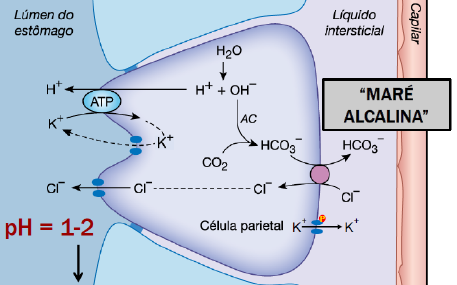 AULA 4 – SECREÇÕES GÁSTRICAS O suco gástrico é uma solução aquosa extremamente ácida produzida por glândulas da mucosa e células epiteliais de superfície. A quantidade de H+ é cerca de 3 milhões de vezes maior que no sangue e a produção de 1 litro desse suco requer cerca de 1500kcal. A função principal do estômago é de ser um reservatório, armazenando o alimento para que haja um ritmo no processo digestivo, de forma que todo o alimento ingerido não chegue de forma simultânea no intestino delgado, sendo esse ritmo controlado pelos hormônios CCK, secretina e PGI. O estômago absorve algumas substâncias, como água, alcool e alguns medicamentos, como a aspirina. Também há o inicio de digestão de proteínas. Algumas ligações químicas de proteínas podem ser digeridas no estômago pelas pepsinas. Também induz a preparação do quimo através do movimento peristáltico, ordenado, espremendo o alimento contra a parede do estômago, misturando-o com as secreções gástricas, de maneira a transforma-lo numa massa homogênea. O mecanismo de peristalse que empurra uma pequena quantidade do quimo em direção ao duodeno é conhecido como bomba pilórica. Dentro de cada depressão encontra-se diversos tipos celulares, como as células mucosas, parietais e principais. A célula mucosa produz muco, também sendo conhecida como célula caliciforme, com uma grande quantidade de grânulos mucosos em seu citoplasma. A célula parietal (ou oxíntica), produtora de HCl e fator intrínseca. A célula principal (zimogênica) possui uma grande quantidade de grânulos de zimogênio, ricas em pepsinogênio. O ácido clorídrico atua desnaturando proteínas, assim como ativando o pepsinogênio. O fator intrínseco serve para absorver a vitamina B12, vitamina essencial para a maturação das hemácias. Todas as células possuem uma quantidade considerável de água e CO2, devido a respiração celular, e cada célula modula essas moléculas de maneira diferente. A célula parietal possui uma grande concentração de anidrase carbônica, catalisando essas moléculas em ácido carbônico, que logo de dissocia em bicarbonato e H+. Esse bicarbonato irá para o interstício, através de uma troca que coloca Cl- do sangue para dentro da célula parietal. O H+ formado jogado para o lúmen do estômago através de uma bomba H+/K+ ATP-ase, entretanto, há entrada de potássio (transporte antiport). O omeprazol atua nessa bomba. Quando o Cl- acumula no citoplasma desta célula, há a abertura de um canal eletrônico para cloreto na membrana luminal. Olha na imagem, o potássio é um íon reciclado nessa reação de jogada de H+ pro lúmen do estômago, retroalimentando esse mecanismo. Na membrana basolateral há outro canal de potássio, passível de fosforilação, que dá origem a todo o mecanismo desta célula. Pois controla o potencial de membrana da célula parietal. Esse canal abre somente fosforilado. A Na+/K+ ATP-ase é uma bomba que regula a quantidade de potássio intracelular, porém não está na imagem, sendo até alvo de alguns medicamentos. Devido a graande quantidade de bicarbonato que cai na corrente sanguínea devido a produção do ácido clorídrico no lúmen estomacal, gera-se uma maré alcalina, o que é um dos fatores que promove um cansaço pós-refeição. O cansaço na verdade é produto desta alcalinização e do desvio de sangue pra região do TGI pra auxiliar o transporte de nutrientes. Um pH muito ácido é essencial para ativação de enzimas digestivas, de maneira que controla a atuação desses ácidos. Também promove a desnaturação de proteínas e paredes bacterianas. A regulação da secreção do HCl é simultânea a regulação de secreção de pepsinogênio. Regulada por secretagogos. Todos os mecanismos abaixo atuam induzindo a fosforilação do canal de potássio da membrana basolateral das células parietais. A Acetilcolina (neurotransmissor / neurócrino) estimula (++) a secreção de HCl. Liberada por terminais colinérgicos de acetilcolina, de origem de um reflexo local ou central (reflexo curto e/ou longo). Atua nos receptores muscarínicos do tipo M3 na célula parietal, elevando a concentração de Ca2+ intracelular. Estimula a liberação de gastrina e histamina, outros dois secretagogos que também estimulam a secreção de HCl. A gastrina (hormônio / endócrino) estimula (+). É produzida por células do tipo G na região pilórica. É UM HORMÔNIO. É liberado em resposta ao GRP, que é liberado em resposta a acetilcolina. Também eleva a concentração de Ca2+ intracelular, através dos receptores CCKb na célula parietal. A gastrina irá estimular a liberação de histamina (hmmmmmm temos aqui um ciclozao?) A histamina (substância parácrina) estimula pra crl (+++). Liberada pelas células ECL (mastócitos gástricos) localizadas na mucosa gástrica. É um dos maiores alvos da industria farmacêutica em patologia onde há produção excessiva de ácido. Liberada em resposta a acetilcolina e gastrina. Age nos receptores H2 da célula parietal elevando o AMPc intracelular. Logo, os 3 secretagogos potencializam a liberação de HCl. Marcelo falando de prova: Ta dizendo que se um indivíduo não produz saliva e não tem estômago, esse indivíduo não se torna desnutrido, pois o pâncreas consegue facilmente produzir quantidades o suficiente de enzimas para digerir as proteínas e carboidratos oriundos da alimentação. Logo, a saliva e o estômago são essenciais para a sobrevivência? Claro, por mais que ele ainda sobreviva, a qualidade de vida decai muito. Esse indivíduo irá necessitar de uma higiene bucal elevadíssima e sua digestão será muito demorada. Também irá ter que compensar A FALTA DE VITAMINA B12, logo, nas palavras do queridíssimo Marcelo, o estômago só é essencial pra absorção dessa vitamina. (1:28:10 da aula 5.mp3 de audio, n to loka não, pode conferir). Ele também ta dizendo que as células tronco do intest