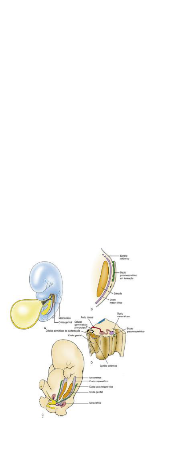 Embriologia|Reprodutor| M3 Desenvolvimento do sistema genital Os sistemas genitais iniciais nos dois sexos são semelhantes; por esta razão, o período inicial do desenvolvimento genital é referido como estágio indiferenciado do desenvolvimento sexual. As características masculinas e femininas só começam a se desenvolver na 7a semana. As gônadas (testículos e ovários) são derivadas de três fontes: • O mesotélio (epitélio mesodérmico) que reveste a parede abdominal posterior. • O mesênquima subjacente (tecido conjuntivo embrionário). • As células germinativas primordiais (CGPs) O sistema genital se origina com o sistema urinário Em indivíduos de ambos os sexos, a formação e a diferenciação das gônadas têm início com a chegada das células germinativas primordiais ao mesoderma intermediário. Essas células germinativas normalmente migram do saco vitelino, através do mesentério dorsal, para preencher o mesênquima da parede posterior durante a 5a semana. Uma vez lá, eles se deslocam para a área adjacente ao epitélio celômico, localizado medial e ventralmente em relação aos rins mesonéfricos em desenvolvimento. Em resposta, o epitélio celômico de cada lado se prolifera, torna‑se mais espesso e, junto com as células germinativas primordiais, forma um par de cristas genitais. Durante a 6a semana, as células derivadas de cada epitélio celômico formam células somáticas de sustentação, que envolvem as células germinativas e são essenciais para o seu desenvolvimento no interior das gônadas. Também durante a 6a semana, um novo par de ductos, os ductos paramesonéfricos (ou ductos de Müller), começa a se formar lateralmente aos ductos mesonéfricos em embriões de ambos os sexos, masculino e feminino. Esses ductos surgem a partir da invaginação e da proliferação de células epiteliais celômicas. Cada ducto paramesonéfrico se estende no sentido craniocaudal, além de paralelamente aos ductos mesonéfricos. No final da 6a semana, os sistemas genitais masculino e feminino são indistinguíveis pela aparência, embora diferenças celulares sutis já possam estar presentes. Da 7ª semana em diante, os sistemas masculino e feminino seguem vias diferentes. Gene SRY como determinante de sexo Um único fator determinante do sexo parece controlar a cascata de eventos que leva ao desenvolvimento masculino. Este fator de transcrição determinante do sexo é codificado pelo gene SRY (REGIÃO DETERMINANTE DO SEXO DO CROMOSSOMA Y). Quando este fator de transcrição é expresso nas células somáticas de sustentação das futuras gônadas indiferenciadas, o desenvolvimento masculino é desencadeado. Este passo é chamado de determinação sexual primária. Caso este fator esteja ausente ou defeituoso, ocorre o desenvolvimento feminino. Embriologia|Reprodutor| M3 O gene SRY, um fator de transcrição, é ativado apenas por um curto período no interior das células somáticas gonadais e parece suprarregular genes testiculares específicos e reprimir os genes ovarianos. Desenvolvimento genital masculino O primeiro evento no desenvolvimento genital masculino é a expressão da proteína SRY no interior das células somáticas de sustentação da gônada XY. Sob a influência deste fator as células somáticas de sustentação começam a se diferenciar em células de Sertoli e a secretar o hormônio antimülleriano (AMH). AMH induz a degeneração dos ductos paramesonéfricos. Células de Sertoli emitem sinais, por meio de mecanismos ainda desconhecidos, que recrutam as células mesenquimais para o interior da crista gonadal, levando elas a se diferenciarem em células de Leydig, que passam a produzir testosterona. A testosterona induz a diferenciação dos epidídimos, dos ductos deferentes e das vesículas seminais a partir do ducto mesonéfrico. Durante a vida fetal, a conversão de testosterona em DHEA também colabora para a diferenciação das genitálias externas em pênis e escroto, além de outras estruturas como a próstata. Durante a puberdade, o aumento de testosterona faz com que os túbulos seminíferos se canalizem, amadureçam e deem início à espermatogênese, além de induzir outras alterações puberais nas características sexuais primárias e secundárias. OBS: Síndrome do ducto mülleriano persistente Indivíduos que são 46,XY e possuem mutações no AMH ou nos genes dos RECEPTORES DE AMH apresentam características típicas da síndrome do ducto mülleriano persistente, pois os ductos paramesonéfricos (müllerianos) não regridem. Estes indivíduos desenvolvem estruturas que são derivadas do ducto paramesonéfrico, em adição aquelas derivadas do ducto mesonéfrico. Consequentemente, um homem com síndrome do ducto paramesonéfrico persistente desenvolve vagina, cérvice, útero e tubas de Falópio, bem como ductos deferentes e genitália externa masculina. Diferenciação das células de Leydig Durante a 9a ou 10a semana, as células de Leydig se diferenciam das células mesonéfricas mesenquimais, recrutadas pelas células pré‑Sertoli. Neste estágio inicial de desenvolvimento (até 12 semanas), a secreção de testosterona é regulada pelo hormônio peptídico gonadotrofina coriônica, secretado pela placenta. Mais tarde, as gonadotrofinas hipofisárias do feto masculino assumem o controle sintetizando os esteroides sexuais masculinizantes (andrógenos). Sob o controle da gonadotrofina coriônica placentária, tanto o número de células de Leydig quanto os níveis de testosterona chegam ao ponto máximo da 14a à 18a semana de gestação. Duas populações diferentes de células de Leydig são responsáveis pela biossíntese de andrógenos durante a vida fetal e pós‑natal: As células de Leydig fetais produzem a testosterona necessária para estimular o desenvolvimento do órgão masculino (criar o epidídimo, os ductos deferentes e as vesículas seminais a partir do ducto mesonéfrico). Entretanto, as células de