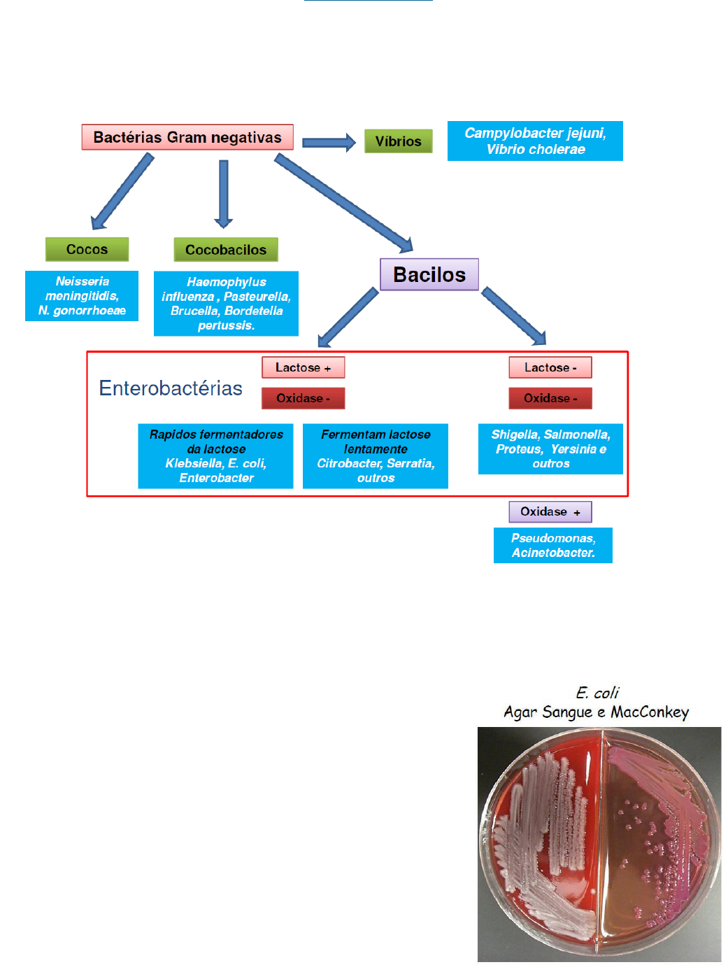 Transcrição de microbiologia- enterobactérias- Cintia R Enterobactérias Elas são bactérias que habitam o intestino (salmonela e shigella). São bacilos Gram negativas. Assim, dentro dos bacilos Gram negativos tem as enterobactérias. Elas possuem algumas propriedades químicas serão importantes no diagnóstico para diferencia-las. Ou seja, algumas bactérias conseguem utilizar a lactose como fonte de energia, sendo lactose positiva. Enquanto outras não conseguem sendo lactose negativas. E o que diferencia as enterobactérias de outros Gram negativos é a ausência da enzima oxidase, sendo então oxidases negativos. O meio de cultura Macconkey é um meio de cultura seletivo e diferencial (um indicador nesse meio diferencia uma bactéria da outra, nesse caso o diferenciador é a cor vermelha para bactérias lactose positiva). Tem-se centenas de cepas/sorotipos de enterobactérias. Patógeno primário: organismo capazes de causar infecções sempre. Shigella, Salmonella, Yersinia, Escherichia coli, Klebsiella pneumoniae. Patógeno oportunista: organismo que pode causar doenças em determinadas condições ou em alguns hospedeiros (principalmente nos imuno deficientes). Escherichia coli, Klebsiella pneumoniae, Proteus, Serratia, Enterobacter, Morganella e Providencia. As amostras de enterobactérias são semeadas em diferentes tubos de ensaio. Na clínica mais de 20 espécies estão associadas a 90% das infecções, sendo 35% das septicemias, 70% infecções do trato urinário, gastrointestinais e meningites. Elas são ubiquitárias pois estão no solo, na agua, na vegetação e na microbiota do trato intestinal dos animais e homens. As enterobactérias são chamadas de coliformes. Características gerais: Bacilos gram negativos, não formam esporos. A maioria possui flagelos. São oxidase negativos, catalase positivos. Todas fermentam a glicose e são sensíveis a luz solar, dessecação, pasteurização e desinfetantes. A mesma bactéria pode apresentar diferentes aspectos em meios de cultura diferentes. Meio Ágar McConkey: Meio seletivo e diferencial para as enterobactérias. As bactérias que fermentam lactose produzem ácido como produto final. Este ácido diminui o pH do meio para valores inferiores a 6.8, resultando na observação de colônias rosa choque/vermelhas. As bactérias que não fermentam a lactose utilizam a peptona como fonte de energia. formando amônia, que eleva o pH do ágar, levando à formação de colônias brancas/sem cor. O meio contém ácido biliar inibe o crescimento da maioria das bactérias Gram positivas, cristal violeta (inibidor para algumas bactérias Gram positivas) e o vermelho neutro (cora bactérias fermentadores de lactose). Meio de cultura BEM (eosin methilen blue): O EMB contém corantes de eosina e azul de metileno que inibem as bactérias gram-positivas num determinado grau. Os corantes funcionam também como indicadores de diferenciação em resposta à fermentação da lactose e/ou sacarose por microrganismos. * As colônias de Escherichia coli poderão apresentar um reflexo verde metalizado característico, devido à rápida fermentação da lactose. Meio SS: pode se apresentar de 3 formas dependendo do organismo semeado. * O vermelho neutro serve de indicador de pH, sendo que as colônias que fermentam a lactose produzem colônias rosa e que não fermentam, como a Shiguella e Salmonella. * Salmonella produzem colônias com centro negro, pois produzem H2S que reage com citrato férrico e tiossulfato de sódio, resultado no sulfato ferroso, de cor preta. As enterobactérias tem estruturas antigênicas: flagelos, chamado de antígeno H; capsula, chamada de antígeno K ou Vi. E os LPS que são endotoxinas. A estrutura antigênica é o polissacarídeo O que pode ter mais de 170 tipos de conformações. O lipídio A é uma endotoxinas. Assim, asmanifstaçoes sistêmicas das endotoxinas pode gerar citopenia, febre, choque, morte, entre outras. Identificação das enterobactérias: Testes para saber as propriedades bioquímicas das bactérias: Ágar triplo-açúcar + ferro (TSI) ou Kliger: esse meio tem 10x mais lactose go que glicose. O meio está em um tubinho de ensaio onde semeará a bactéria. Uma bactéria não fermentadora o meio ficará rosa, ou seja, nada acontecerá. Agora se a base ficar amarela e a superfície vermelha, significa que a bactéria utiliza apenas a glicose, pois nesse meio é colocado bem menos glicose do que lactose, então o ácido da superfície ficará vermelho. Já um microrganismo que utiliza lactose mantem o meio todo acidificado, mantendo-se todo amarelo. A salmonela produz o H2S, que é um pigmento escuro. Teste SIM: neste teste vê a produção de sulfato/indol/motilidade. A produção de H2S gera pigmento preto. A produção de indol é produto da metabolização do triptofano Para testar a motilidade coloca-se umaa agulha no meio de cultura, e o meio que contem bactérias moveis forma-se como se fosse uma nuvem ao redor da agulha. Teste do citrato: o citrato é a única fonte de carbono. Se a bactéria metabolizar o citrato o meio ficará azul. Salmonella: Bacilos Gram negativos. São moveis. Fermentam glicose e manose. Mas não fermentam lactose nem a sacarose. A maioria produz H2S. São patogênicas para seres humanos e animais. Ela tem uma classificação de espécie e subespécie peculiar, tendo 2610 espécies de salmonela, dentro dessa espécie tem a espécie entérica que contém várias subespécies sendo uma delas a subespécie entérica que é a principal causadora de salmonela humana (salmonela tifoide e não-tifoide). A classificação Sorovares de Kaufmann e White se baseiam no antígeno O (LPS) que são somáticos e caracterizam os sorogrupos e no antígeno Vi que é capsular e no antígeno H que é flagelar, Fotores de virulencia: Fimbrias: são importantes na adesao DO TIPO I:estao relacionadas com a adesao. AGREGATIVAS se ligam as microvilosidades dos enterocitos PLASMIDIAL também se li