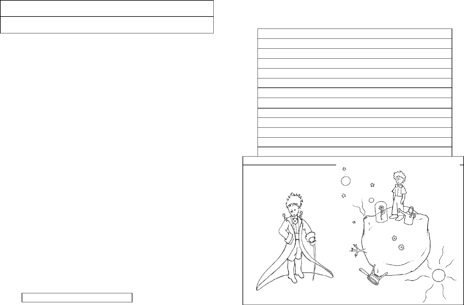 ESCOLA... Atividade Avaliativa - Língua Portuguesa Professora: Valor: Aluno(a): Nota: O Pequeno Príncipe é uma obra literária do escritor francês Antoine de Saint-Exupéry, que conta a história da amizade entre um homem frustrado por ninguém compreender os seus desenhos, com um principezinho que habita um asteroide no espaço. Esta obra é marcada pelo seu alto teor filosófico e poético, mesmo sendo considerada, a princípio, uma literatura para crianças. O Pequeno Príncipe é o terceiro livro mais traduzido do mundo, contabilizando aproximadamente mais de 160 idiomas, e um dos mais vendidos por todo o planeta. O clássico ganhou diversas adaptações, seja no cinema ou em espetáculos teatrais e musicais. Leia as frases abaixo. Explique, com suas palavras, o ensinamento que cada frase transmite. “ O essencial é invisível aos olhos, e só se pode ver com o coração” “ Foi o tempo que dedicaste à tua rosa que a fez tão importante” “ Se tu vens, por exemplo, às quatro da tarde, desde às três eu começarei a ser feliz”. “ As pessoas são solitárias porque constroem muros ao invés de pontes”. “ É preciso que eu suporte duas ou três larvas se quiser conhecer as borboletas”. Lindinhos, Boa Sorte! Amo Vocês!!! Fale sobre os personagens citados abaixo, quem são e o que cada um representa. Ilustre cada um. O Pequeno príncipe O Piloto A Rosa A Raposa A Serpente O Rei O Bêbado O Homem de Negócios O Acendedor de lampiões O Geógrafo O astrônomo O Vaidoso ESCOLA ...... Atividade Avaliativa - Língua Portuguesa Professora: Valor: 5,0 Aluno(a): Nota: Fale sobre os personagens citados abaixo, quem são e o que cada um representa, de acordo com a história do Pequeno Príncipe. O Pequeno príncipe O Piloto A Rosa A Raposa Faça (no verso da folha) uma dissertação sobre: A importância sobre os relacionamentos. (lembre-se de usar parágrafos corretamente, de observar o tema proposto, pontuação...)