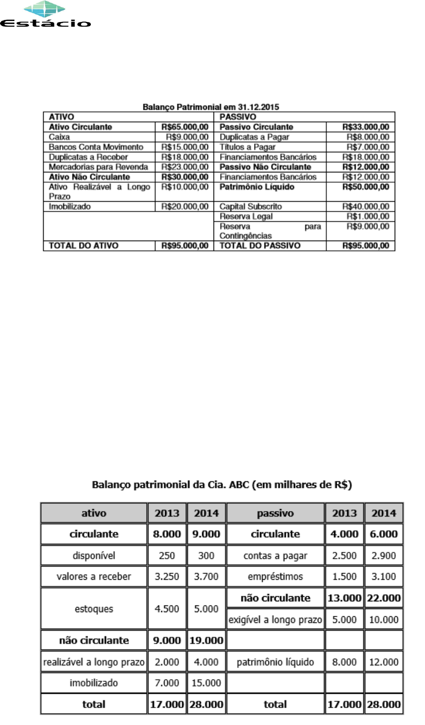 Análise das demonstrações financeiras Aula 5 1. Uma sociedade empresária apresentou, em 31.12.2015, os seguintes dados do Balanço Patrimonial: A partir desse Balanço Patrimonial, é CORRETO afirmar que: a) A liquidez corrente é, aproximadamente, de 1,67. b) A liquidez geral é, aproximadamente, de 0,73. c) A liquidez imediata é, aproximadamente, de 1,97. d) A liquidez seca é, aproximadamente, de 1,27. e) Nenhuma das alternativas anteriores estão corretas. 2. A elaboração de indicadores tem por finalidade avaliar o desempenho de determinada entidade a partir de diferentes critérios. Em relação a essa matéria, julgue o item subsequente. Se o índice de liquidez corrente for menor que um, o resultado demonstra folga no disponível para uma possível liquidação das obrigações de curto prazo. ( ) Certo ( ) Errado 3. Analise as informações que seguem: Com base na tabela acima, que apresenta o balanço patrimonial da companhia hipotética ABC, julgue o item a seguir. A análise vertical permite concluir que a representatividade dos estoques no ativo total da empresa foi, nos dois períodos contábeis, superior a 30%. ( ) Certo ( ) Errado 4. Considere a demonstração a seguir para responder à questão. O índice de liquidez geral de 2013 é: a) 2,00 b) 1,00 c) 0,50 d) 2,47 e) 1,86 5. Contador Transpetro 2011 – (CESGRANRIO) – Informações de empresas do segmento da indústria têxtil: Empresas Alfa Beta Gama Delta Épsilon PL 455.678,90 512.113,40 678.356,32 718.100,99 856.347,77 Capital de Terceiros 309.861,65 337.994,84 440.931,61 502.670,69 530.935,62 Ao se considerar o índice de Participação de Capitais de Terceiros (PCT), qual a empresa que apresenta o maior endividamento? 6. Auditor de Controle Interno – Pref. Várzea Grande – MT 2011 (FUNCAB) – Dado que no levantamento do patrimônio de uma empresa foram obtidos os valores abaixo, determine a participação de capitais de terceiros sobre os Recursos totais. Bens R$28.000 Direitos R$34.000 Obrigações R$43.000 a) 30% b) 69% c) 79% d) 44% e) 144% 7. Analista Judiciário – TER – AM 2010 (FCC) – A análise das demonstrações financeiras da empresa JK indicou que o quociente de participação de terceiros sobre os recursos totais é de 0,7 e que a composição do endividamento é 55%. Se o ativo total da empresa é de R$800.000, o seu passivo não circulante (exigível a longo prazo) é, em reais: a) 252.000 b) 308.000 c) 320.000 d) 440.000 e) 560.000 8. ENADE 2009 C.C – Analise as informações a seguir, referente ao Balanço Patrimonial da Cia. MMS, relativo ao exercício financeiro de X8. BALANÇO PATRIMONIAL ATIVO R$ PASSIVO R$ ATIVO CIRCULANTE 3.300 PASSIVO CIRCULANTE 3.000 Caixa 400 Empréstimo (curto prazo) 600 Aplicações Financeiras (Curto Prazo) 1.700 Fornecedores 500 CLIENTES 1.000 Títulos a pagar 800 ICMS a Recuperar 200 Provisão para Férias e 13º Salário 1.100 ATIVO NÃO CIRCULANTE 10.800 PASSIVO NÃO CIRCULANTE 4.500 Clientes (Longo Prazo) 1.100 Financiamentos (Longo Prazo) 4.500 Marcas e Patentes 200 PATRIMÔNIO LÍQUIDO 6.600 Obras de Arte 1.500 Capital Social 4.000 Veículos 8.000 Reservas de Lucros 1.800 Reserva de Capital 800 TOTAL DO ATIVO 14.100 TOTAL DO PASSIVO 14.100 Com base nessas informações, quais são, respectivamente, o índice de liquidez corrente e o índice de composição do endividamento?