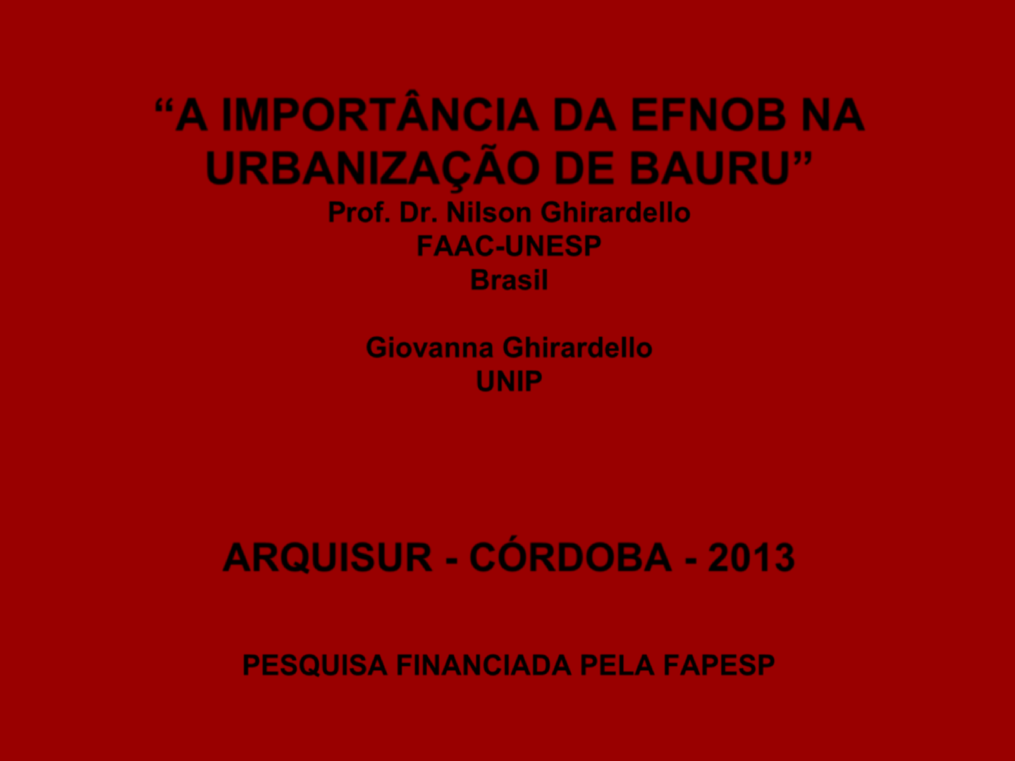 “A IMPORTÂNCIA DA EFNOB NA URBANIZAÇÃO DE BAURU” Prof. Dr. Nilson Ghirardello FAAC-UNESP Brasil Giovanna Ghirardello UNIP ARQUISUR - CÓRDOBA - 2013 PESQUISA FINANCIADA PELA FAPESP Objetivos: -Mostrar o início da formação urbana de Bauru, cidade do centro oeste paulista (Brasil). -Entender as transformações ocorridas no traçado urbano, ocasionadas pela vinda das ferrovias para a cidade: Estrada de Ferro Sorocabana, Estrada de Ferro Paulista, Estrada de Ferro Noroeste do Brasil – EFNOB. -Mostrar o relevo da vinda das ferrovias para a expansão urbana e de que maneira a sua implantação determinou a maneira como Bauru se definiu fisicamente. - Segurança dada pelas mesmas para a inversão dos capitais privados no solo urbano: novas edificações, loteamentos, implantação da infraestrutura urbana. Bauru será formada a partir de um patrimônio religioso doado em 1884, sendo que o povoado torna-se cidade em 1896. O arruador define o traçado inicial como uma imensa toalha xadrez colocada sobre uma encosta. As quadras estabelecidas de maneira regular medindo 88x88 metros divididos em 8 datas com dimensões de 22, 00m x 44, 00m, totalizando 968m2 por lote. As ruas leste-oeste mediam todas, por volta de 14 metros de largura, as no sentido norte-sul, mais largas, têm dimensões variáveis entre 16 a 20 metros. Primeiras construções foram edificadas junto à estrada que ligava os sertões a Fortaleza e Lençóis, depois chamada rua Araújo Leite. IMPLANTAÇÃO DA S FERROVIAS EM BAURU: -SOROCABANA: marca sua estação em agosto de 1904 e inaugura a linha em 1905. -Fará sua entrada pelo sul da cidade, paralela ao córrego Água da Ressaca, e depois ao Ribeirão Bauru, aproveitando as áreas planas das baixadas de forma a evitar rampas que onerariam seu custo de construção. -As ferrovias tendo assegurado por lei o direito de desapropriação, passavam por onde melhor lhe convém, sem se importar necessariamente com as pequenas vilas ou cidades, e estas devido à importância da ferrovia acatavam de forma incondicional o trajeto proposto. IMPLANTAÇÃO DA S FERROVIAS EM BAURU: EFNOB: Nasce na cidade em direção à noroeste paulista e estado do Mato Grosso; forte sentido econômico e estratégico para o país; -Em 1905 iniciam-se as obras. Em 1906 inauguram-se os primeiros 100 quilômetros a partir de Bauru. -Implantação mereceu acurados estudos, pois se tratava do ponto inicial da ferrovia. -Área ao lado da estação da Sorocabana para facilitar a baldeação e de maneira a aproveitar a topografia plana. -Os trilhos, correndo em paralelo ao córrego da Grama reforçarão a separação dos diversos bairros futuramente criados, dificultando até nossos dias a “costura” de várias frações urbanas. IMPLANTAÇÃO DA S FERROVIAS EM BAURU: A Paulista aporta em Bauru em fevereiro de 1910, tendo como ponto de chegada o início da atual rua Agenor Meira, nas proximidades da Noroeste e Sorocabana. A fim de buscar esta cota, os trilhos vindos da direção leste cortam as principais ruas à época. -Reforça-se uma barreira que vai completar a segregação já existente pela topografia de fundo de vale, em direção aos setores oeste e norte da cidade. ¨A chegada dos trilhos é quase sempre um marco na historia de uma cidade. Com a estrada de ferro vem todo o aparelhamento que ela exige, especialmente quando a cidade, por alguma razão, é escolhida para sede de qualquer atividade especial da estrada: armazém, oficinas, escritórios, ponto de cruzamento de trens ou local de baldeação¨. (MATOS, 1990, p. 197) Mais que a implantação da companhia, e os rendimentos diretos gerados por ela, deve-se considerar os reflexos indiretos na economia urbana, bem como, a confiança nos destinos locais provocados por esse verdadeiro ¨lastro¨ do desenvolvimento citadino. -Nó ferroviário favorecendo comércio e a prestação de serviços; -Cidade se torna um importante entroncamento ferroviário; -O encontro de várias ferrovias colocava a cidade em contato direto com diversas regiões do Estado, privilégio apenas comparado a capital São Paulo. -Portal da nova região servida pela EFNOB denominada de “zona noroeste paulista” que ia até o Rio Paraná. -Sede da única companhia a transportar imensas quantidades de café produzidas na “zona noroeste ”, deslocadas até Bauru e daí transportadas pela Sorocabana ou Paulista. A “NOVA CIDADE” PÓS-FERROVIAS MUDANÇAS NO URBANO: -Abertura da Avenida Sorocabana em frente a estação do mesmo nome; -Abertura da Avenida Alfredo Maia tendo como eixo o acesso da Estação Sorocabana e EFNOB; -Criação da Praça Machado de Melo em frente a estação da EFNOB; -Alteração do eixo do crescimento comercial direcionado em direção e ao redor das estações ferroviárias. -Criação de novos bairros além do perímetro inicial da cidade. A “NOVA CIDADE” PÓS-FERROVIAS MUDANÇAS NA INFRAESTRUTURA: -Instalação da rede de telefonia em 1907; -Instalação da energia elétrica em 1911; -Instalação da rede de agua e esgoto em 1912. -Participação direta dos engenheiros da EFNOB nos projetos de infraestrutura urbana da cidade. REFERENCIAS BIBLIOGRÁFICAS AZEVEDO, Fernando. Um trem corre para o Oeste. São Paulo: Livraria Martins, 1950. GHIRARDELLO, Nilson. Aspectos do Direcionamento Urbano da Cidade de Bauru. São Carlos, 1992, 187 p.. Dissertação de Mestrado (Curso de Arquitetura e Urbanismo) - Escola de Engenharia de São Carlos, Universidade de São Paulo, 1992. GHIRARDELLO, Nilson. A Beira da linha, Formações urbanas da noroeste paulista. São Paulo: Editora da Unesp, 2002. GHIRARDELLO, Nilson. A Formação dos Patrimônios Religiosos na Expansão Urbana Paulista. São Paulo, Editora da UNESP, 2010. MATOS, Odilon Nogueira de. Café e Ferrovias: A Evolução Ferroviária de São Paulo e o Desenvolvimento da Cultura Cafeeira. São Paulo, Alfa-Omega. Sociologia e Política, 1974. MILIET, Sérgio. Roteiro do café e outros ensaios.