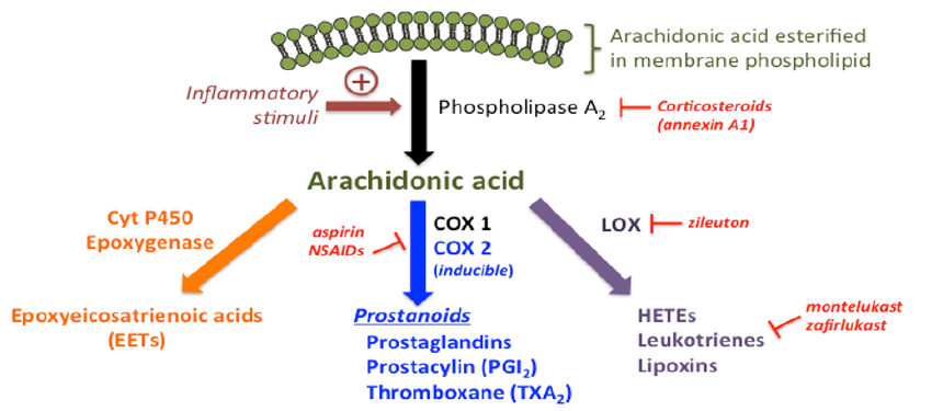 GABRIELA RIBAS – MÓDULO IV: SEMANA 3 ANTIINFLAMATÓRIOS NÃO ESTEROIDAIS Os eicosanóides são estruturas que possuem 20 átomos de carbono e são basicamente formadas de ácidos graxos, derivadas principalmente do ácido araquidônico. Prostaglandinas, prostaciclina e tromboxano são tipos de eicosanóides (achava-se que era produzida pela próstata, mas hoje se sabe que é produzida no corpo todo). O ácido araquidônico está relacionado com vários compostos. Ele está presente em fosfolipídios de membrana e é disponibilizado por enzimas acil-hidrolases (a mais importante é a fosfolipase A2 - PLA2) que separam o ácido araquidônico do lipídeo. Quando ele está livre ele pode ser metabolizado por diversas enzimas: ciclo-oxigenase (COX), lipo-oxigenase (LOX) e isoformas do citocromo P450. Além disso, ele pode sofrer oxidação não enzimática por radicais livres ou transformação em endocanabinoides. O ácido araquidônico está presente na membrana plasmática (principalmente fosfatidilcolina e fosfatidil etonolamina), ele esta na membrana formando a bi camada lipídica. Através das acil-hidrolases há a quebra dessa membrana e liberação do ácido graxo (como o ácido araquidônico), a enzima fosfolipase A2 libera o ácido do fosfolipídio deixando ele livre e assim ele pode ser metabolizado em diversas vias (se não for utilizado vai voltar para a membrana). O ácido araquidônico quando é liberado da membrana pode seguir várias vias das ciclo-oxigenases, da lipo-oxigenase LOX (forma leucotrienos), isoformas do complexo citocromo P450. As ciclo-oxigenases (COX) são as vias que vão formar as prostaglandinas (relacionadas com integridade da mucosa intestinal, função plaquetária e função renal), cada prostaglandina vai ser produzida por um tipo especifico de enzima, agindo em receptores específico, as lipo-oxigenases LOX vão formar os leucotrienos e a via da citocromo P450 vão produzir outras substâncias. Os corticosteróides vão inibir a fosfolipase A2 e os AINEs vão inibir a COX (inibindo as prostaglandinas, prostaciclinas, tromboxanos). A COX2 esta associada à inflamação, então ela produz prostaglandinas associadas com a inflamação, é bloqueada por anti-inflamatórios tradicionais e também por inibidores seletivos da COX 2 A ciclo-oxigenase é o nome usual para a prostaglandina-endoperóxido sintase. Existem três subtipos identificados: a COX-1 é constitutiva então esta sempre sendo produzida e degradada, está presente na maioria das células, envolvida na homeostasia tecidual, expressa na grande maioria dos tecidos e produz as prostaglandinas que vão agir localmente mantendo as funções celulares normais; a COX-2 também pode ser expressa em algumas células, mas é muito mais presente depois de uma indução por uma reação inflamatória que é mediada por IL-1 e TNF-alfa (antes se bloqueava apenas a 2 pois estava mais envolvida nas inflamações); a COX-3 não se sabe se é existente em humanos. Os prostanoides (termo genérico que envolve todas as prostaglandinas) vão agir em receptores de superfície acoplados a proteína G, modulam a atividade da adenililciclase e da fosfolipase C modulando níveis de AMPc intracelular. Possuem uma meia-vida curta sendo uma substância que vai agir localmente (parácrina) e isso é bom porque numa inflamação localizada não quer que essa ação vá para o corpo todo. A ação é definida pelo local de produção e o tipo de receptor do órgão (estimulatório/ inibitório). Plaquetas: Nas plaquetas humanas o TxA2 é um dos principais eicosanoides produzidos, ele é pró-coagulante estimulando a agregação plaquetária para a formação de trombos, é muito importante pois alguns anti-inflamatórios são usados para reduzir a agregação plaquetária e assim diminuir o risco vascular. A ação é inibida pela produção de prostaciclina (PGI2) inibe a ação do tromboxano para manter a coagulação normal, não funciona como desagregador então se já tiver agregado não tem como voltar Vasos Sanguíneos: Nos vasos sanguíneos podem influenciar no tônus vascular, causa vasodilatação, através principalmente da PGI2 (principal vasodilatador). Ela é produzida através da indução da COX-2 no endotélio. O que estimula a produção é o estresse de cisalhamento (fluxo sanguíneo intenso do vaso aumenta o estresse do vaso) gera células batendo causando um estresse na parede do vaso – shear stress, isso estimula a produção da COX que estimula os prostanoides que vão dilatar o vaso, e outros autacoides como a angiotensina. A prostaciclina também reduz o tônus arterial sistêmico e pulmonar, quando a molécula de PGI2 é transformada em fármaco ela é usada para controlar o tônus arteriolar pulmonar. Outros vasoativos são a PGE2 e PGD2. A PGE2 estimula o fluxo sanguíneo renal e a excreção de sal. Em conjunto com a PGI2 estão implicadas na hipotensão do choque séptico (quando tem infecção bacteriana no sangue tem produção alta de prostaglandinas principalmente PGI2 e PGE2, com isso faz uma vasodilatação em grande parte do corpo e o coração não consegue manter a pressão para manter as trocas gasosas. Além disso ela faz a manutenção do canal arterial patente até o nascimento (se usar em grávidas pode bloquear o canal arterial e com isso o feto não consegue fazer as trocas). O tromboxano promove aterogênese contribuindo para a inflamação do sistema cardiovascular e desenvolvimento de aneurismas. A prostaciclina (PGI2) inibe a aterogênese, limita a remodelagem e proliferação vascular tendo ação contrária a do tromboxano. Em geral é tromboxano x prostaciclina, é importante ter um balanço entre as duas prostaglandinas, se destruir o balanço sem o tromboxano as plaquetas não agregam e sangra muito e sem a prostaciclina aumenta risco cardiovascular. No coração a PGE2 e PGI2 protegem contra danos oxidativos dos tecidos cardíacos e são sintetizadas através da 
