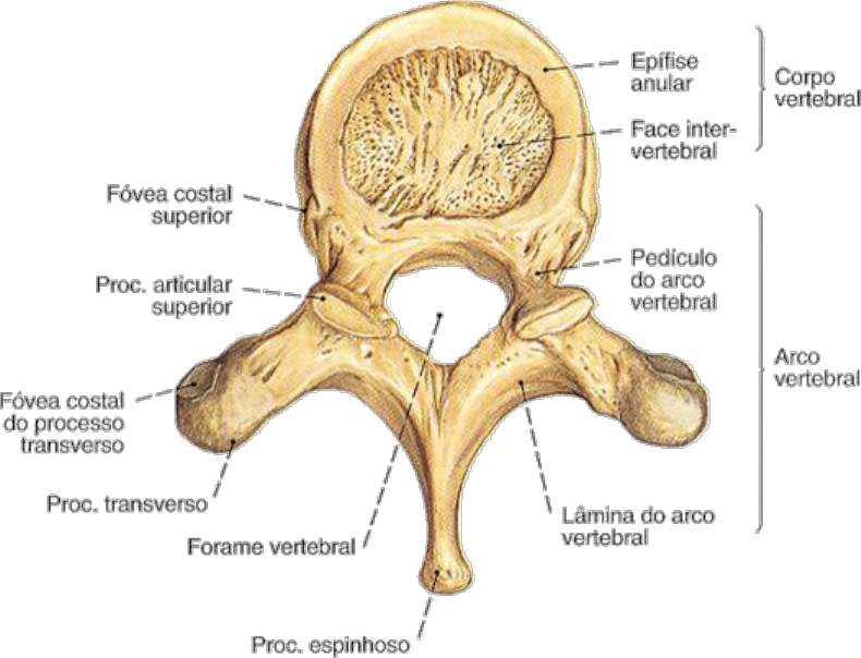 Resumo anatomia – Coluna Vertebral. A coluna vertebral de um adulto é composta por 26 ossos, incluindo as vértebras, o sacro (5 vertebras) e o cóccix (4 vertebras). As vértebras constituem uma coluna de apoio que sustenta o peso da cabeça, pescoço e tronco. Também protegem a medula espinal, oferecem passagem para os nervos espinais, que se iniciam ou terminam na medula espinal, e auxiliam na manutenção da postura ereta do corpo, em pé ou sentado. Pode ser dividida em regiões: cervical, torácica, lombar, sacral e coccígea. Podemos encontrar 7 vertebras cervicais, 12 torácicas, 5 lombares, sacro é constituído por 5 vertebras que se fundem com o decorrer da vida virando um osso apenas e o cóccix inicia-se a partir de 3 a 5 vertebras. Curvaturas da coluna vertebral Curvatura secundária (lordose cervical) Curvatura primária (cifose torácica) Curvatura secundária (lordose lombar) Curvatura primária (cifose sacral) As curvaturas primarias são denominadas “ de acomodação” porque permitem a acomodação das vísceras torácicas e abdominopélvicas em desenvolvimento. No recém-nascido a coluna apresenta-se em forma de “C”. As secundarias são denominadas “ de compensação” pois auxiliam na modificação da direção do peso sobre os membros inferiores. Anatomia vertebral: O corpo vertebral é a parte da vértebra que transfere o peso ao longo do eixo da coluna vertebral. São separados por discos intervertebrais. O arco vertebral forma os limites laterais e posterior do forame vertebral que, durante a vida, envolve um segmento da medula espinal. Regiões da coluna vertebral: Vértebras cervicais: A primeira, a segunda e a sétima vértebra cervical apresentam características únicas e são consideradas vértebras atípicas. O corpo da vertebra é pequeno comparando com o forame vertebral. forames transversários protegem a passagem das artérias vertebrais e veias vertebrais. O atlas (C I): articula-se com os côndilos occipitais do crânio, sustenta a cabeça, ausência de corpo, maior forame vertebral e permite o movimento de flexão e extensão. O áxis (C II): possui uma estrutura chamada dente do áxis que se articula com a fóvea dental do atlas, permite o movimento de rotação. Vértebra proeminente (C VII): possui um processo espinho com uma saliência longa que dá para sentir ao toque. O ligamento nucal é uma estrutura importante para o movimento da região cervical. Vértebras torácicas: Os forames vertebrais são relativamente menores que os da cervical. Fraturas ou deslocamentos por compressão, após uma queda, por exemplo, frequentemente envolvem as últimas vértebras torácicas e as primeiras duas vértebras lombares. Cada vértebra torácica articula-se com costelas ao longo da região póstero-lateral do seu corpo. Apresentam fóveas costais superiores e inferiores que se articulam com as costelas. Vertebras lombares: São as maiores vértebras. Corpo mais espesso que uma vertebra torácica devido ao peso sustentado. Não há fóveas ou faces articulares em nenhum dos lados do corpo vertebral ou no processo transverso. Forame vertebral triangular. A lesão mais comum é a laceração ou ruptura dos tecidos conectivos do disco intervertebral; essa lesão é conhecida como hérnia de disco. E ocorre nessa região com mais frequência que nas outras. Sacro: É composto por cinco vértebras sacrais fundidas Protege os órgãos genitais, digestórios e urinários Fixa o esqueleto axial ao cíngulo do membro inferior do esqueleto apendicular. O canal sacral serve como passagem para nervos espinais e meninges que revestem a medula espinal, é semelhante aos forames vertebrais. A face auricular do sacro articula-se com o cíngulo do membro inferior, constituindo a articulação sacroilíaca. O cóccix: É composto de três a cinco vértebras coccígeas. O cóccix oferece superfície de fixação para diversos ligamentos e inserção para um músculo que constringe a abertura do canal anal. Articulações e ligamentos da coluna As vertebras são unidas por 3 ligamentos: Ligamento longitudinal anterior: muda sua espessura conforme reveste os corpos vertebrais. Ligamento longitudinal posterior: dentro do canal vertebral, é continuo. Ligamento amarelo: conecta as laminas vertebrais adjacentes, as elasticidades das suas fibras auxiliam na postura ereta da coluna, não é contínuo. Discos intervertebrais ou fibrocartilagens intervertebrais. Interpostos entre os corpos vertebrais. Permitem a movimentação entre os corpos da vertebras. Sustentação do peso corporal Possuem um núcleo pulposo e um anel fibroso. Articulação atlantoccipital: Une o crânio a coluna vertebral. Ocorre entre as faces articulares do atlas e o côndilo occipital. É uma articulação sinovial. Seus meios de união são: membrana atlantoccipital anterior e posterior e os ligamentos laterais. Articulação atlantoaxial: Localiza-se entre o atlas e o áxis, é sinovial. Articulação atlantoaxial mediana: Entre o dente do Áxis e o anel formado pelo arco anterior do Atlas, possui duas cavidades sinoviais. Articulação atlantoaxial lateral: Encontra-se entre as faces articulares superiores do Áxis e as faces articulares inferiores do Atlas. Os ligamentos dessas articulações são: Ligamentos alares: Os ligamentos alares têm o aspecto de corda e se originam das partes laterais do dento do Áxis indo fixar-se nas faces mediais do côndilo do occipital. Ligamento atlantoaxial anterior: fixado à borda inferior do arco anterior do Atlas e à face ventral do corpo do Áxis. Ligamento atlantoaxial posterior: é mais delgado que o anterior e estende-se do arco posterior do Atlas às laminas do Áxis, substituindo o ligamento amarelo. Ligamento transverso: fixa o dente do Áxis ao arco anterior do Atlas, vai de uma face medial da massa lateral do Atlas à outra. Articulação Lombosacral, Articulação Sacroilíaca, Articulação Sacrococcígea