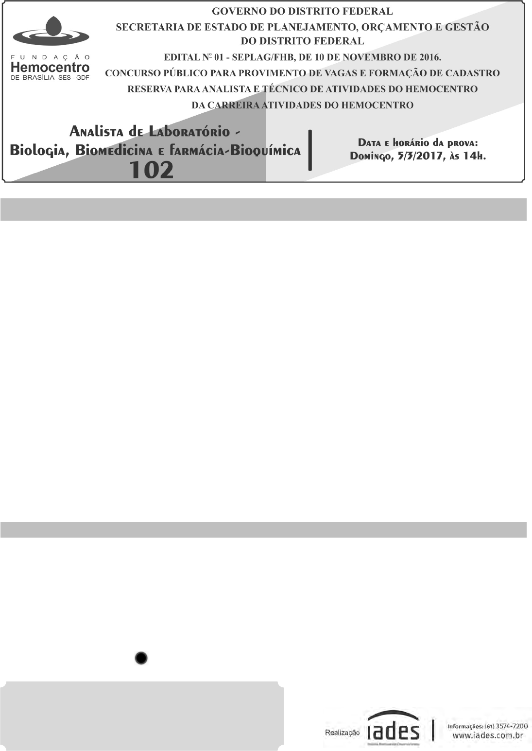 PR OV A AP LIC AD A I N S T R U Ç Õ E S • Você receberá do fiscal: o um caderno de questões da prova objetiva e discursiva contendo 50 (cinquenta) questões de múltipla escolha, com 5 (cinco) alternativas de resposta cada uma, e apenas uma alternativa correta, e 1 (uma) questão discursiva; o um cartão de respostas ótico personalizado; e, o uma folha de resposta da prova discursiva. • Quando autorizado pelo fiscal do IADES, no momento da identificação, escreva no espaço apropriado do cartão de respostas, com a sua caligrafia usual, a seguinte frase: Faz-se do amigo próximo, distante. • Verifique se a numeração das questões, a paginação do caderno de questões e a codificação do cartão de respostas ótico e da folha de resposta da prova discursiva estão corretas. • Você dispõe de 4 (quatro) horas para fazer a prova objetiva e discursiva, devendo controlar o tempo, pois não haverá prorrogação desse prazo. Esse tempo inclui a marcação do cartão de respostas ótico e o preenchimento da folha de resposta da prova discursiva. • Somente após decorrida 1 (uma) hora do início da prova, você poderá entregar seu cartão de respostas ótico, a folha de resposta da prova discursiva e o caderno de provas e retirar-se da sala. • Somente será permitido levar o caderno de questões da prova objetiva e discursiva após 3 (três) horas do início da prova. • Após o término da prova, entregue ao fiscal do IADES a folha de resposta da prova discursiva e o cartão de respostas devidamente assinado. • Deixe sobre a carteira apenas o documento de identidade e a caneta esferográfica de tinta preta, fabricada de material transparente. • Não é permitida a utilização de qualquer aparelho eletrônico ou de comunicação. • Não é permitida a consulta a livros, dicionários, apontamentos e apostilas. • Você somente poderá sair e retornar à sala de aplicação de provas na companhia de um fiscal do IADES. • Não será permitida a utilização de lápis em nenhuma etapa da prova. I N S T R U Ç Õ E S P A R A A P R O V A O B J E T I V A E D I S C U R S I V A • Verifique se os seus dados estão corretos no cartão de respostas da prova objetiva e na folha de resposta da prova discursiva. Caso haja algum dado incorreto, escreva apenas no(s) campo(s) a ser(em) corrigido(s), conforme instruções no cartão de respostas. • Leia atentamente cada questão e assinale, no cartão de respostas ótico, uma única alternativa. • O cartão de respostas ótico e a folha de resposta da prova discursiva não podem ser dobrados, amassados, rasurados ou manchados e nem podem conter nenhum registro fora dos locais destinados às respostas. • O candidato deverá transcrever, com caneta esferográfica de tinta preta, as respostas da prova objetiva para o cartão de respostas, e o texto definitivo da prova discursiva para a respectiva folha de resposta. • A maneira correta de assinalar a alternativa no cartão de respostas é cobrir, fortemente, com caneta esferográfica de tinta preta, o espaço a ela correspondente. • Marque as respostas assim: www.pciconcursos.com.br PR OV A AP LIC AD A CONCURSO PÚBLICO – HEMOCENTRO 102 – ANALISTA DE LABORATÓRIO – TIPO A PÁGINA 2/14 CONHECIMENTOS BÁSICOS Questões de 1 a 25 LÍNGUA PORTUGUESA Questões de 1 a 8 Texto 1 para responder às questões 1 e 2. Disponível em: <https://www.facebook.com/hemocentrobrasilia/photos/pb. 309692019051454.-2207520000.1482262556./1283803091640337/?type=3 &theater>. Acesso em: 20 dez. 2016. QUESTÃO 1 _______________________ Com base na leitura compreensiva do texto, assinale a alternativa correta. (A) A mensagem principal é um apelo para que a população faça parte de uma campanha de doação de sangue. (B) Somente a partir dos 19 anos de idade, uma pessoa pode doar sangue sem precisar apresentar formalmente o consentimento do respectivo responsável. (C) Desde que com consentimento formal do respectivo responsável, qualquer pessoa menor de 18 anos de idade pode ser doadora de sangue. (D) Uma pessoa que pesa precisamente 50 kg, mesmo que atenda a todas as outras orientações, não pode ser doadora de sangue. (E) Uma pessoa que consome alimentos gordurosos não pode doar sangue, pois deixa de observar a orientação “Estar bem de saúde”. QUESTÃO 2 _______________________ Com base apenas nas regras prescritas pela norma-padrão acerca da acentuação gráfica e do uso do sinal indicativo de crase, assinale a alternativa correta. (A) A construção “Orientações para o doador” poderia ser substituída pela redação Orientações à toda pessoa que pretende doar. (B) Caso o emissor decidisse explicitar o local de doação de sangue, poderia substituir a construção “Levar documento oficial de identidade com foto” por qualquer uma das seguintes redações: Levar à sua unidade de doação documento oficial de identidade com foto ou Levar a sua unidade de doação documento oficial de identidade com foto. (C) Assim como o vocábulo “saúde”, também estão corretamente acentuados saída, gratuíto e rúbrica. (D) O emissor poderia substituir a expressão “alimentos gordurosos” pela redação alimentos que contém gordura. (E) O trecho “nas três horas que antecedem a doação” poderia ser substituído por apenas uma das seguintes redações: nas três horas anteriores a doação ou à três horas antes da doação. Texto 2 para responder às questões de 3 a 5. 1 4 7 10 13 16 18 Doação de sangue Ninguém está livre de precisar de uma transfusão de sangue. Ninguém está livre de sofrer um acidente, de passar por uma cirurgia ou por um procedimento médico em que a transfusão seja absolutamente indispensável. Como não existe sangue sintético produzido em laboratórios, quem precisa de transfusão tem de contar com a boa vontade de doadores, uma vez que nada substitui o sangue verdadeiro retirado das veias de outro ser humano. Todos sabemos que