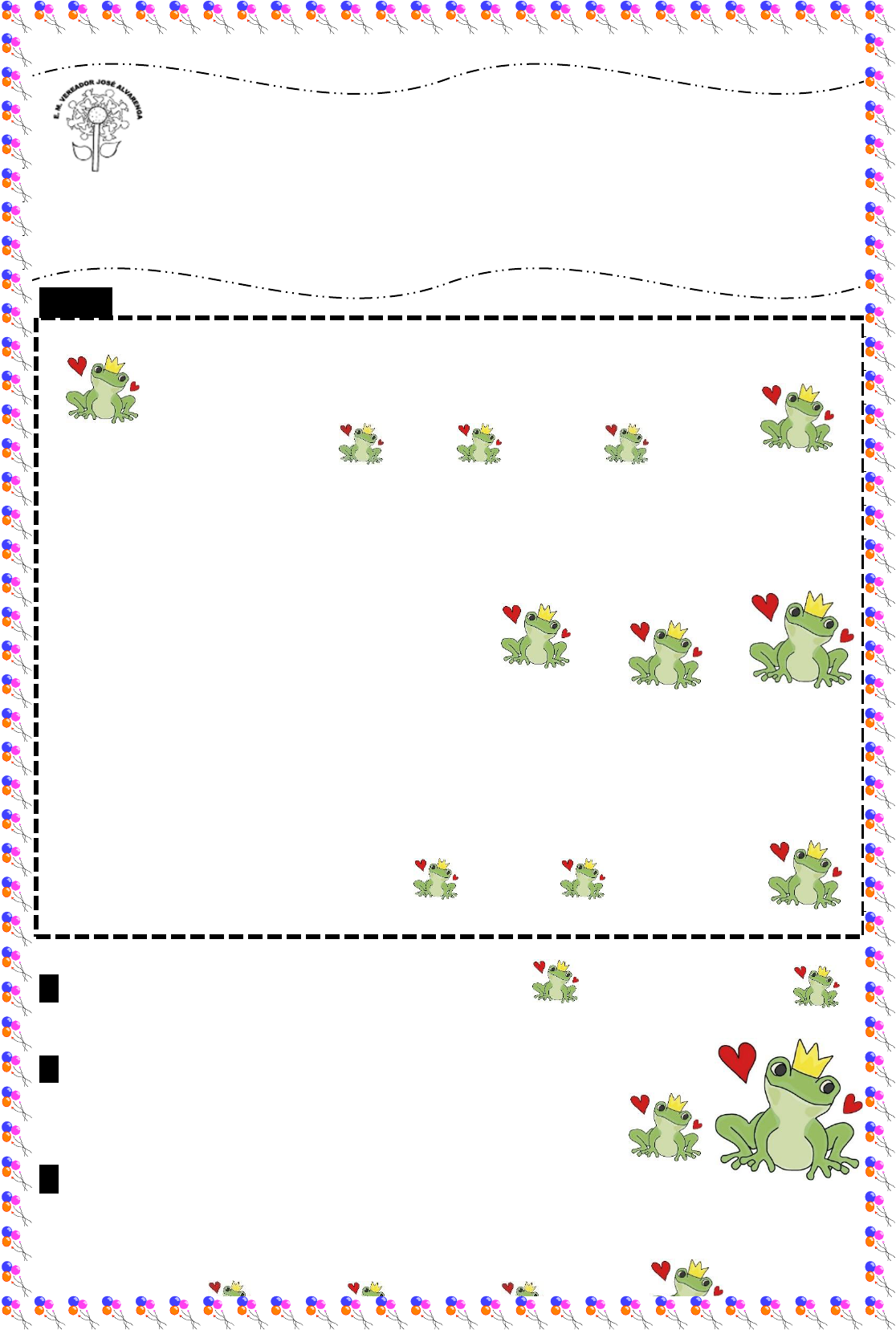 hESCOLA MUNICIPAL VEREADOR JOSÉ ALVARENGA AVALIAÇÃO DE LÍNGUA PORTUGUESA - 3º ano-Data: ___/___/20___ Nome:____________________________________________________________________ Nº de acertos:_____ Valor da prova:_____ Nº de questões:______ Nota:________ Texto IJon Scieszka Era uma vez um sapo. Certo dia, quando estava sentado na sua vitória-régia, viu uma linda princesa descansando a beira do lago. 0 sapo pulou dentro da água, foi nadando até ela e mostrou a cabeça por cima das plantas aquáticas. "Perdão, ó linda princesa", disse ele com sua voz mais triste e patética. "Será que eu poderia contar com a vossa ajuda?" Assim, ela perguntou: “0 que posso fazer para te ajudar, sapinho?” "Bem", disse o sapo. "Na verdade, eu não sou um sapo, mas um belo príncipe transformado em sapo pelo feitiço de uma bruxa malvada. E esse feitiço só pode ser quebrado pelo beijo de uma linda princesa." A princesa pensou um pouco, depois ergueu o sapo nas mãos e lhe deu um beijo. "Foi só uma brincadeira", disse o sapo. Pulou de volta no lago, e a princesa enxugou a baba de sapo dos seus lindos lábios. O Patinho realmente feio e outras histórias malucas. São Paulo: companhia das letrinhas, 1997, (S.P.) Outro Príncipe Sapo 1- Qual é o nome deste gênero textual? ( A ) Um poema. ( B ) Um bilhete. ( C ) Um conto. ( D ) Um convite. 2- Este texto e seu conteúdo geralmente relata: ( A ) uma divulgação científica. ( B ) um fato verdadeiro. ( C ) o modo de fazer um doce. ( D ) um fato imaginário. 3- Qual é o trecho que apresenta a fala da Princesa: ( A ) “Era uma vez um sapo.” ( B ) “Será que eu poderia contar com a vossa ajuda?” ( C ) “Perdão o linda princesa.” ( D ) “O que posso fazer para te ajudar, sapinho?” 4- "Perdão, ó linda princesa", disse ele com sua voz mais triste e patética. "Será que eu poderia contar com a vossa ajuda?" Nessa parte do texto o sapo queria: ( A ) Fazer um pedido à princesa. ( B ) cumprimentar a princesa. ( C ) fazer um elogio à princesa. ( D ) pedir perdão à princesa. 5- "Perdão, ó linda princesa", disse ele com sua voz mais triste e patética. “Qual o significado da palavra patética? ( A ) empolgada. ( B ) comovente. ( C ) alegre. ( D ) animada. 6- O fato engraçado dessa história é: ( A ) a esperteza do sapo em enganar a princesa. ( B ) o jeito do sapo se dirigir a princesa. ( C ) o susto da princesa ao ver o sapo. ( D ) a voz patética (comovente) do sapo, ao falar com a princesa. 7- O que leva o sapo a fazer o pedido a princesa é: ( A ) seu desejo enfeitiçar a princesa. ( B ) seu desejo de fazer uma brincadeira com a princesa. ( C ) seu desejo de quebrar o feitiço da bruxa malvada. ( D ) seu desejo de se transformar em um príncipe. 8- Na frase “foi nadando até ela”, a palavra ela se refere a: ( A ) vitória-régia. ( B ) beira do lago. ( C ) princesa. ( D ) bruxa. 9- De acordo com o texto, a princesa foi: ( A ) ingênua/boba. ( B ) brincalhona. ( C ) malvada. ( D ) teimosa. 10- Essa história aconteceu porque: ( A ) a princesa deu um salto e correu. ( B ) o sapo mostrou a cabeça na lagoa. ( C ) a princesa deu atenção ao sapo. ( D ) o sapo pulou dentro da água. Texto IIUM PRÍNCIPE! AH!! PENSEI QUE FOSSE SE TRANSFORMAR NUM PADEIRO, DOCEIRO, PIPOQUEIRO... OLÁ, GAROTINHA! DÊ-ME UM BEIJO E TERÁ UMA BELA SURPRESA! OLÁ, GAROTINHA! DÊ-ME UM BEIJO E TERÁ UMA BELA SURPRESA! 11- No texto II, Magali esperava que ao beijar o sapo ele se transformasse em um pipoqueiro ou padeiro. Marque com um (X) a opção que justifica o pensamento da personagem. a)( ) Magali é famosa por comer muita pipoca. b)( ) Por ser criança, ela gostaria de aproveitar as guloseimas feitas por estes profissionais. c)( ) Tinha o sonho de se casar com um príncipe padeiro. 12- Qual o sentimento que se percebe pelo rosto da personagem principal no primeiro e no último quadrinho? R: _______________________________________________________________________ _________________________________________________________________________ 13- Identifique as frases abaixo em: interrogativa, afirmativa, negativa , imperativae exclamativa. a) Menino levado!!! Isso não se faz. R:__________________________________________ b) Por favor! Traga-me um copo com água. R:____________________________________ c) Nossa! Que susto! R:_____________________________________________________ d) Quando você terá juízo? R:_________________________________________________ e) Não vou brincar com a boneca. R:___________________________________________ f) Por que você não foi à escola? R:____________________________________________ 14 Usando as palavras abaixo, separe as palavras nas colunas de acordo com a sua classificação quanto a sílaba tônica: AQUÁTICAS PATÉTICA BRUXA PERDÃO BRINCADEIRA LEGAL AJUDAR FEITIÇO ESCÂNDALO SAPO TRANSFORMAR PRÍNCIPE Proparoxítona Paroxítona Oxítona 16- É com C ou G? Assinale corretamente a resposta e complete as palavras: 15- É com R ou RR? Complete e assinale a resposta correta: PALAVRA R RR SOCO_____O BA____ATA CO____EU TE____EMOTO FE____IDA HEN____IQUE DANÇA____INO PALAVRA C G RELÓ____IO ____AIOLA ____ARANGUEJO A____ANHADO A____ASALHO ____ORILA ____ANSO 17- Copie as palavras em suas respectivas colunas: HIATO DITONGO TRITONGO 18- Complete com (D) Dígrafo ou (EC) Encontro Consonantal: macarrão pássaro exceto pedra brisa ninhada pneu chuva canhão malhação gritaria descida