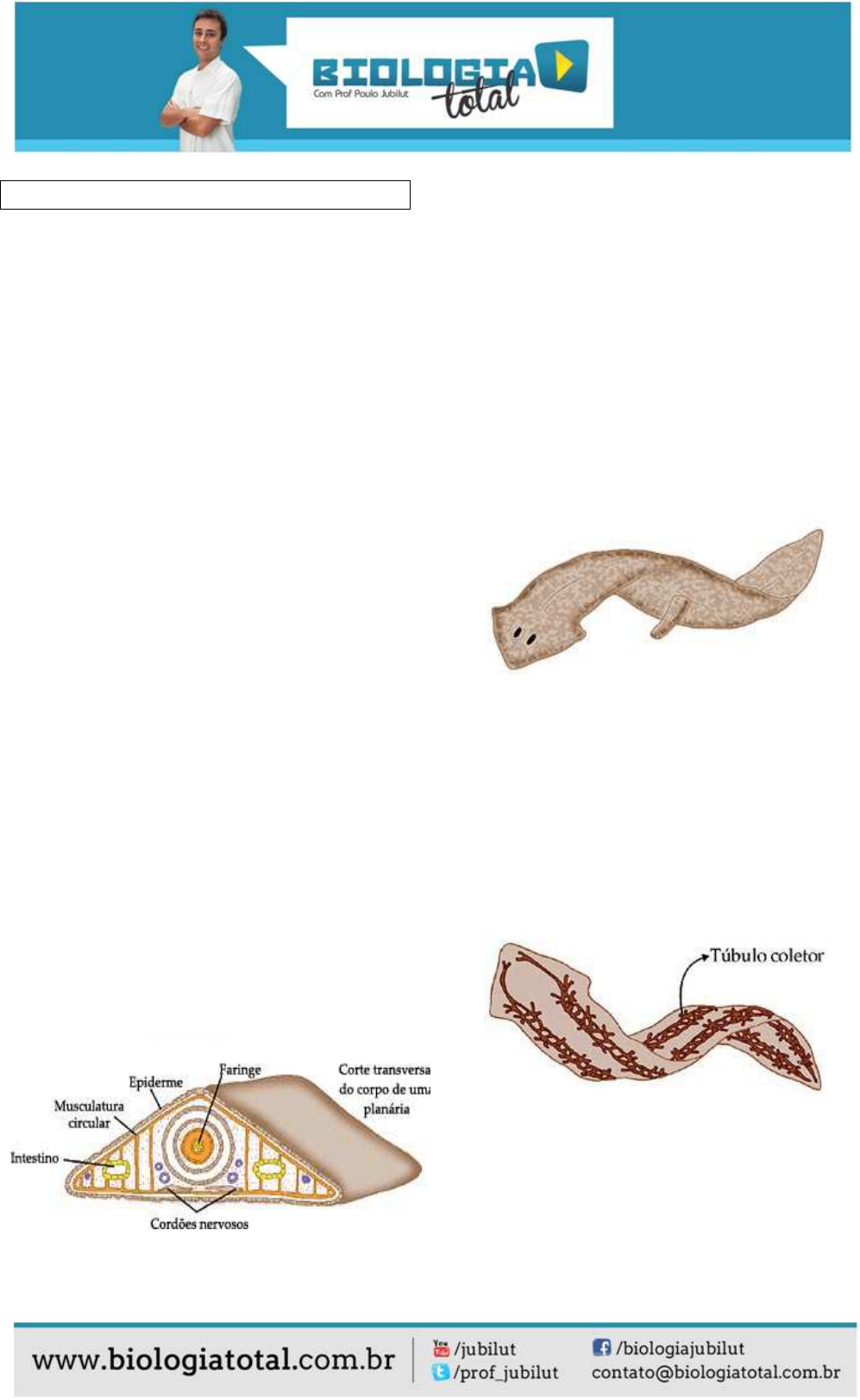 FILO PLATHYELMINTHES O filo Platyhelminthes (do grego, platy = achatado; helminthes = verme) contém os animais conhecidos como vermes achatados por terem o corpo mole e fino. Aliás, o termo "verme" é empregado popularmente para designar os animais desprovidos de patas e que apresentam o corpo alongado. No caso dos platelmintos, a essas características soma-se o fato de o corpo lembrar uma fita, pois é achatado no sentido dorsoventral. Os representantes de vida livre podem ser encontrados na água doce ou salgada ou mesmo em lugares úmidos na terra. Há muitos representantes parasitas, encontrados aderidos à superfície exterior do corpo do hospedeiro (ectoparasitas) ou habitando o interior de seu organismo (endoparasitas). Muitos são causadores de sérias doenças ao homem. Entre os platelmintos de vida livre, a grande maioria vive no mar. Entre os organismos de água doce e terrestres há representantes grandes e de cores brilhantes. São conhecidos popularmente como planárias, com destaque para a aquática Dugesia e a terrestre Geoplana. Características gerais e fisiologia São animais triblásticos, acelomados, com simetria bilateral, protostômios e neuromiários. Os platelmintos são os primeiros animais da escala zoológica a apresentarem simetria bilateral, isto é, seu corpo pode ser dividido em duas metades simétricas. A simetria bilateral está relacionada diretamente com a capacidade de movimentação do animal. A parte do corpo que primeiro entra em contato com o ambiente (extremidade anterior) contém a maioria dos órgãos sensoriais e difere da extremidade oposta (posterior). Como exemplo de platelminto podemos escolher a planária, organismo de vida livre encontradas geralmente em água doce, vivendo no fundo de lagoas ou riachos, sob pedras, folhas e galhos. O corpo é coberto por uma epiderme simples e lisa na parte dorsal e ciliada, com células glandulares, na ventral. Os cílios auxiliam na locomoção na água. Logo abaixo da epiderme, existem camadas de fibras musculares circulares e longitudinais, responsáveis pelos movimentos do animal. Os espaços existentes entre os músculos e órgãos internos são preenchidos por um parênquima formado por células pouco compactas. Não existe, portanto, celoma. O sistema digestivo é incompleto, formado pela boca, faringe e intestino bastante ramificado sem ânus. A boca, situada na extremidade da faringe, pode ser evertida formando uma proboscide para capturar os alimentos, está localizada ventralmente, quase na metade do corpo. As planárias são carnívoras, alimentando-se de outros pequenos animais. O alimento é parcialmente digerido no interior do intestino por enzimas secretadas por células glandulares existentes na gastroderme. As substâncias resultantes são absorvidas pelas células da gastroderme, que completam a digestão. A digestão, portanto é extra e intracelular. As substâncias resultantes da digestão difundem-se através do intestino para as outras células do corpo. Os resíduos da digestão são eliminados para o exterior pela boca. Faringe evertida da planária O sistema excretor, chamado protonefridial, é formado por dois anais longitudinais situados ao longo do corpo, os quais se comunicam com uma rede de pequenos canais que se ramificam pelo corpo, em cujas extremidades encontram-se as células-flama. Essas células possuem um canal contendo um tufo de flagelos, que se movimentam semelhante à chama de uma vela, daí o nome que receberam. Esse sistema é encarregado de eliminar o excesso de água e de resíduos nitrogenados do catabolismo produzidos pelas células de corpo. As trocas gasosas ocorrem por difusão direta através da epiderme, não existindo órgãos respiratórios. Os gases difundem-se diretamente de célula a célula, não havendo líquido circulatório. A planária e as trocas gasosas O sistema nervoso é formado por um par de gânglios cerebroides unidos, situados na cabeça, do qual partem pequenas ramificações para os ocelos, e dois cordões nervosos longitudinais, um de cada lado, que se estendem ao longo do corpo emitindo nervos periféricos, e se comunicam entre si por nervos transversais. Os ocelos são sensíveis à luz, mas não formam imagens. As partes laterais da cabeça possuem quimiorreceptores para o gosto e olfato. As planárias são hermafroditas. A fecundação é interna e cruzada. Duas planárias se unem pela parte ventral, quando os espermatozoides de uma são injetados na outra e vice-versa. Após a fecundação. Formam-se os ovos que são eliminados para o meio externo, onde ocorre o desenvolvimento e eclosão de novas planárias jovens. O desenvolvimento é direto. As planárias também podem se reproduzir assexuadamente por laceração. Ela se divide ao meio, longitudinalmente, e cada metade regenera uma nova planária inteira. Experiências demonstraram que planárias possuem alta capacidade de regeneração. Classificação Existem aproximadamente 13 mil espécies descritas no filo Platyhelminthes, divididas em três classes. Classe Turbellaria – reúne os platelmintos de vida livre, conhecidos popularmente como planárias, devido ao seu corpo achatado. Classe Trematoda – reúne platelmintos parasitas. Algumas espécies são ectoparasitas, isto é, vivem grudadas nas superfícies externas do corpo do hospedeiro. Outras são endoparasitas, vivendo no interior do corpo de animais vertebrados. Schistosoma mansoni A fêmea se encontra dentro da “fenda” do macho Os trematódeos têm o corpo revestido por uma cutícula resistente, que os protege contra as eventuais defesas do hospedeiro que parasitam. A boca, localizada na região anterior do corpo, desemboca numa faringe musculosa que se abre no intestino ramificado. Normalmente, exibem ventosas especiais para fixação do verme no hospedeiro, que se situam na região anterior do corpo. Os trematódeos podem ser monoicos ou dioicos, e muitas espécies precisam passar por dois ou mais