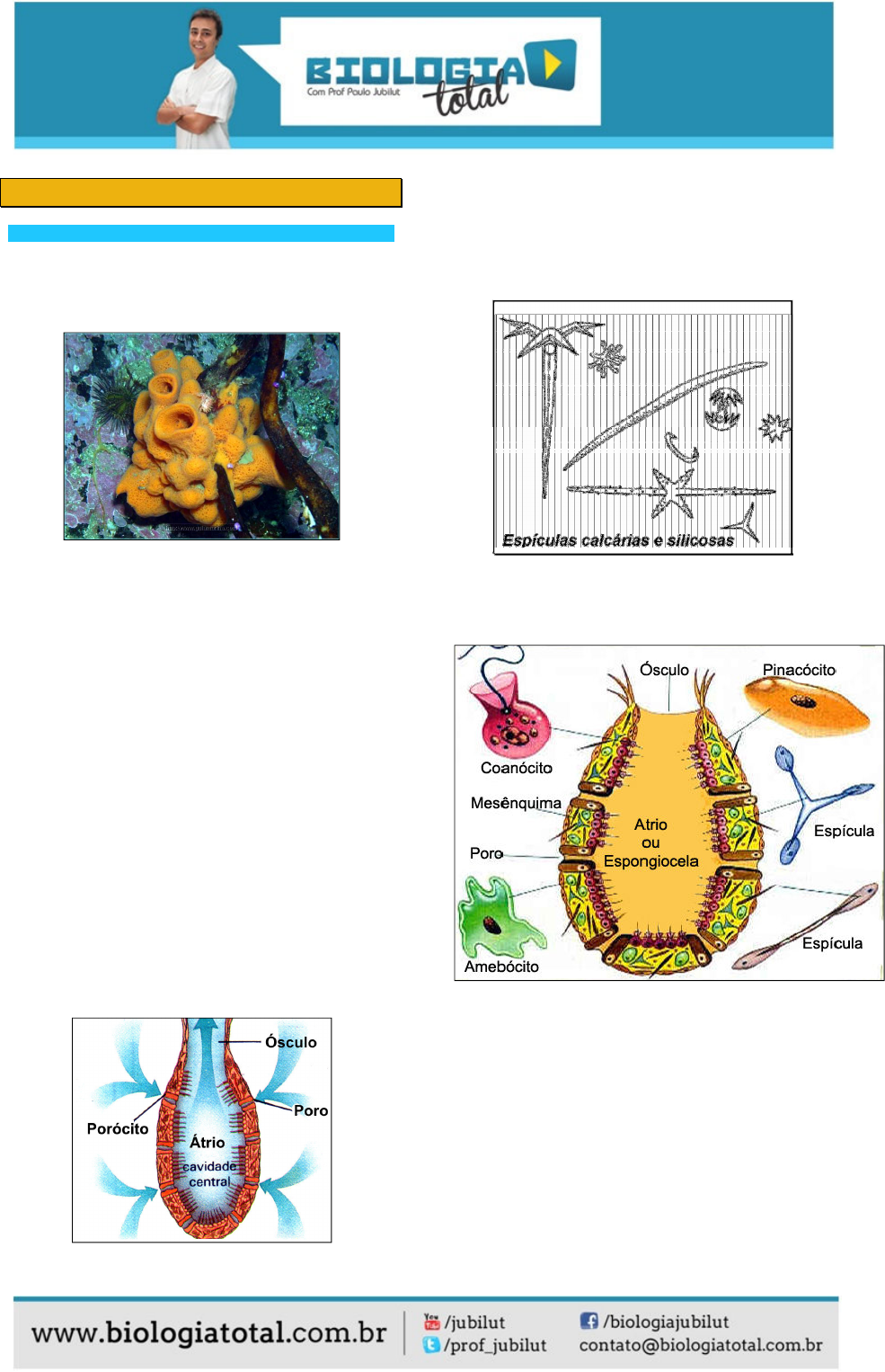 PORÍFEROS E CNIDÁRIOS FILO PORIFERA O filo Porifera (do grego póros, poro, e do latim, ferre, portador) reúne cerca de 5 mil espécies aquáticas, principalmente marinhas. Esponja marinha Os espongiários ou esponjas são animais acelomados, de simetria radial (a maioria) com estrutura corporal simples, não apresentando tecidos diferenciados ou órgãos. Podem viver isolados ou em colônias, aderidos a substratos submersos como madeira, pedras, conchas, etc. A simplicidade das esponjas possibilita que elas apresentem elevada capacidade de regeneração. Certas espécies, mesmo depois de trituradas, podem reagrupar suas células e regenerar uma esponja semelhante à original. São animais filtradores, ou seja, a água passa por dentro do corpo do animal, de onde são retirados os nutrientes da alimentação e o oxigênio da respiração. Estrutura Corporal O corpo das esponjas lembra um vaso com a base aderida ao substrato. A parede corporal apresenta duas camadas de células: a interna formada pelos coanócitos e a externa formada pelos pinacócitos. Todo o corpo de uma esponja apresenta poros inalantes em sua superfície por onde entra a água. Esta cai numa cavidade central chamada átrio ou espongiocele e sai por uma abertura superior, o ósculo. Trajeto da água em uma esponja Entre as duas camadas celulares existe um material gelatinoso o mesênquima, onde se situam as estruturas de sustentação, as espículas. Essas espículas podem ser de origem mineral (calcárias ou silicosas) ou de origem orgânica (proteína espongina). Além das espículas, o mesênquima contém ainda células que desempenham várias funções, os amebócitos. Estrutura de uma esponja (corte longitudinal) Fisiologia O alimento das esponjas compõe-se principalmente de algas, protozoários e microcrustáceos planctônicos, obtidos pela filtração da água ao seu redor. Os coanócitos capturam esse alimento e digerem-no no interior de vacúolos digestivos. A digestão, portanto, é exclusivamente intracelular. Os nutrientes obtidos do processo de digestão são distribuídos às demais células pelos amebócitos. As funções de respiração e excreção são feitas por difusão. Reprodução As esponjas se reproduzem de forma assexuada por brotamento ou sexuada com a formação de gametas. Brotamento A maioria das esponjas é hermafrodita; embora não apresentem gônadas, no período de reprodução sexuada, produzem gametas formados a partir dos gonócitos para realizar a fecundação interna. O desenvolvimento é indireto, apresentando fase larval. Reprodução sexuada em poríferos Quando as condições ambientais são desfavoráveis (épocas de frio e de seca), as esponjas podem produzir gêmulas que são estruturas de resistência onde ficam abrigadas células em repouso. No período das chuvas essas gêmulas se desenvolvem originando novos indivíduos. FILO COELENTERATA OU CNIDARIA Anêmona-do-mar Pertencem a este filo as águas-vivas, corais, hidras e anêmonas. São animais diblásticos, acelomados, de simetria radial. A maioria dos celenterados vive no mar, mas há espécies de água doce que habitam lagos e córregos de água limpa. O termo “celenterado” (do grego koîlos, ocos, e énteron, intestino) refere-se ao fato desses animais possuírem uma cavidade digestiva, a cavidade gastrovascular. Já o termo “cnidário” (do grego kníde, urtiga) deve-se ao fato de eles possuírem cnidócitos, também chamados de cnidoblastos, que são células urticantes (que queimam), usadas para defesa e captura de alimentos. Estrutura Corporal O corpo dos celenterados é formado por duas camadas celulares. A mais externa de revestimento, a epiderme, uma camada central gelatinosa, a mesogleia e a camada mais interna, a gastroderme. Apresentam duas formas corporais básicas: Formas anatômicas dos celenterados a) Pólipos – são sésseis (do latim sessilis, fixos), permanecendo grudados a rochas e a outros objetos submersos como, por exemplo, as anêmonas-do-mar e os corais. Têm corpo cilíndrico, com a boca dorsal no centro da extremidade livre, onde se localizam os tentáculos com grande concentração de cnidoblastos. Hidra (pólipo) b) Medusas – nadam livremente impulsionados por jatos de água lançados por contrações do corpo. É o caso das águas-vivas. Têm o formato de um guarda- chuva com a boca situada no centro da região inferior rodeada de tentáculos dotados de cnidoblastos. Água-viva (medusa) Fisiologia A gastroderme reveste a cavidade digestiva onde já se inicia a digestão do alimento pela ação de enzimas digestivas. Aqui, a digestão é parcialmente extracelular e a finalização de processo ocorre de modo intracelular. As trocas gasosas e a eliminação das excretas é feita por difusão. Na mesogleia, existe uma rede de células nervosas, dispostas de maneira frouxa mas ligadas entre si e são responsáveis em perceber estímulos e responder a eles. Assim, dizemos que os celenterados possuem um sistema nervoso difuso. Sistema Nervoso difuso em hidra Os cnidoblastos distribuem-se por toda a epiderme concentrando-se nos tentáculos e ao redor da boca. Essas células são típicas dos cnidários e apresentam uma cápsula ovóide chamada nematocisto, no interior da qual há um longo tubo enovelado denominado filamento urticante. Na superfície do cnidoblasto voltada para o lado externo há um cnidocílio que se comporta como um “gatilho disparador” do nematocisto. Quando o nematocisto é “disparado”, o filamento urticante se inverte rapidamente e libera um líquido tóxico através de poros em sua parede. Em certos nematocistos, o filamento urticante possui uma série de espinhos que se eriçam á medida que ele se everte da cápsula, ferindo o corpo da presa e facilitando a penetração da toxina. Cnidoblasto com nematocisto Estrutura básica de um cnidário Reprodução Os cnidários se reproduzem de forma assexuada por brotamento e sexuada com fecundação interna 