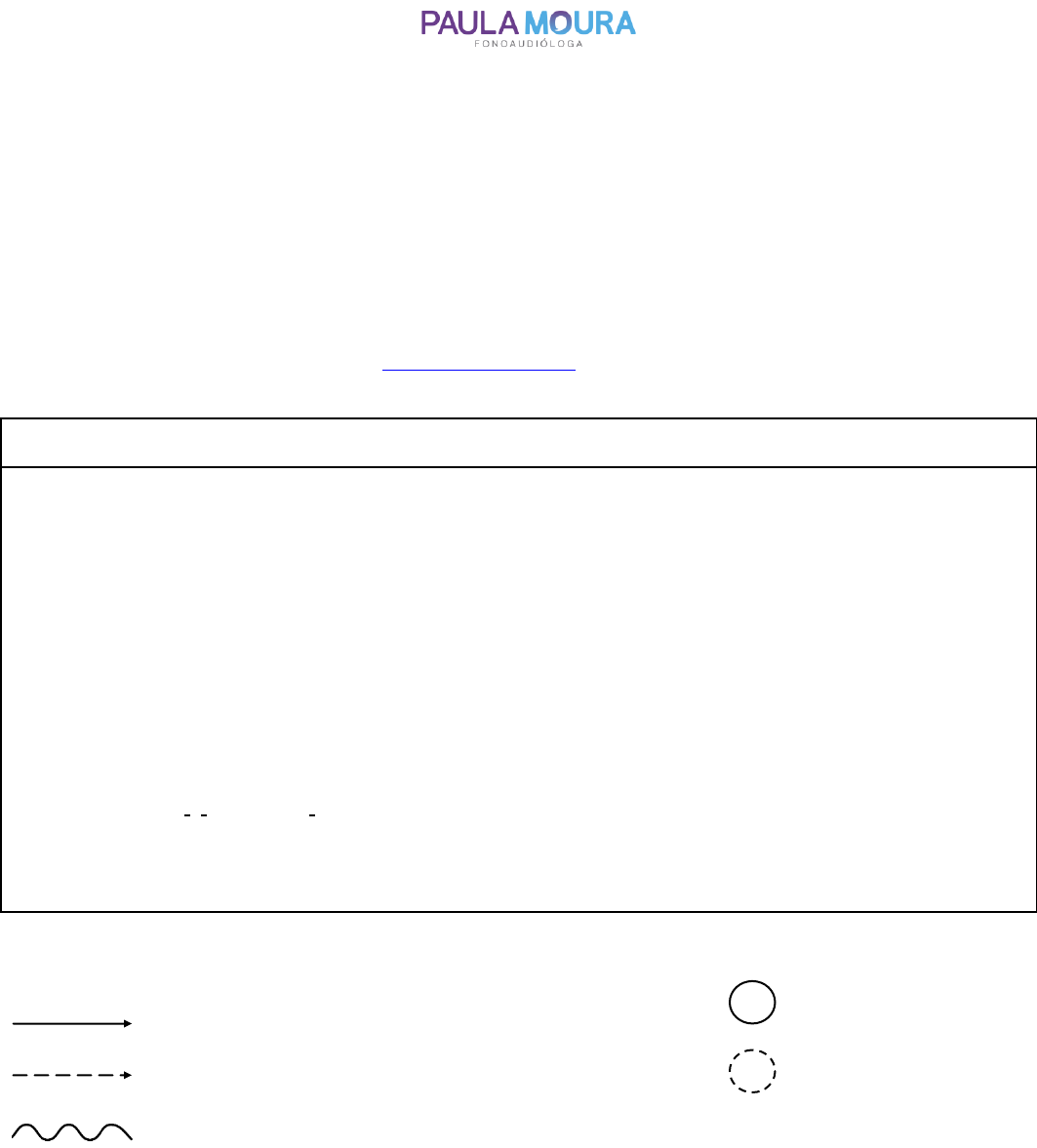 www.paulamourafono.com.br Ólá! Esse é um PRESENTE para quem acompanha e interage com as “Dicas da Fono por Paula Moura” nas redes sociais! Modelo EDITÁVEL do quadro fonêmico para que você, Fonoaudiólogo(a), possa incluir em seu relatório de avaliação ou simplesmente utilizar como recurso didático no momento de explicar os resultados da avaliação para os responsáveis de seu paciente que apresenta trocas na fala. Sugestão de uso: apague o cabeçalho e esse texto que está em vermelho e elabore seu relatório com os dados dos seus pacientes. Quer aprender a avaliar por meio da aplicação do teste de fonologia do protocolo ABFW e/ou estratégias terapêuticas para tratar os desvios fonológicos? Envie um e-mail para dicasdafono@gmail.com me contando exatamente o que você precisa e solicite um orçamento de supervisão (aula) por Skype. Será um prazer estudar com você! QUADRO FONÊMICO Grupos Consonantais p t k /l/ /r/ b d g Vogais m n η (nh) Arquifonemas i u f s ʃ (ch) {S} {R} e(ê) o(ô) v z ʒ (J) ε(é) ɔ (ó) l ʎ (lh) Africados a ɾ (arara) R (rato) /t/ /d/ Legenda: Substituição sistemática Omissão sistemática Substituição assistemática Omissão assistemática Distorção ______________________________ Fonoaudiólogo(a)