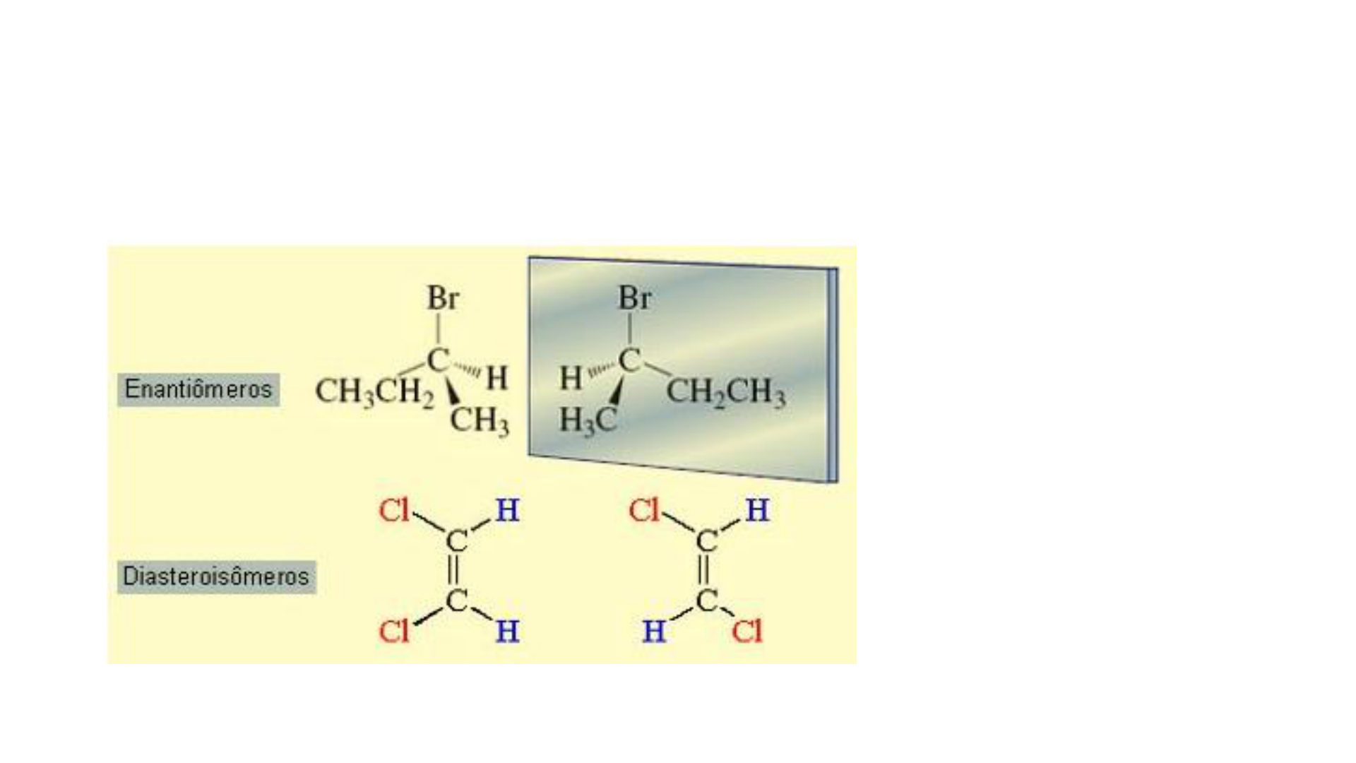 Enantiômeros e Diasteroisômeros Os estereoisômeros podem ser subdivididos em duas categorias gerais: enantiômeros e diasteroisômeros. Os enantiômeros são estereoisômeros cujas moléculas são imagens especulares não superponíveis. Os diasteroisômeros são estereois. Quando falamos em moléculas com imagens especulares não superponíveis (enantiômeros), falamos em termos de quiralidade. Um objeto quiral é aquele que possui a propriedade de "lateralidade", ou seja, é um objeto que não pode ser colocado sobre a sua imagem especular de forma que todas as partes coincidam. Em outras palavras, um objeto quiral não é superponível à sua imagem especular. O exemplo mais comum é cada uma das nossas mãos, que guardam a relação de imagem especular entre si (esquerda e direita), mas não podem ser sobrepostas. A mão é, portanto, um objeto quiral. Exemplos: um pé de tênis, uma orelha, um parafuso de madeira, um carro, etc. O corpo humano é estruturalmente quiral, com o coração localizado à esquerda do centro e o fígado à direita. Mesmo os sentidos do paladar e do olfato também dependem, muitas vezes, da quiralidade. Uma forma especular de uma molécula quiral pode ter um determinado sabor ou odor, enquanto a sua imagem especular cheira e tem um sabor completamente diferente. Um exemplo é o caso da molécula do limoneno e de sua imagem especular, que têm fragrâncias muito distintas: uma molécula (o enantiômero S) ocorre no fruto dos pinheiros e tem odor semelhante ao da terebintina, enquanto o outro isômero (R) é responsável pelo cheiro característico das laranjas.