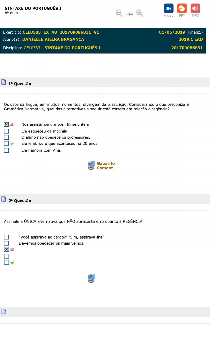 SINTAXE DO PORTUGUÊS I 8a aula Lupa Vídeo PPT MP3 Exercício: CEL0583_EX_A8_201709086831_V1 01/05/2019 (Finaliz.) Aluno(a): DANIELLE VIEIRA BRAGANÇA 2019.1 EAD Disciplina: CEL0583 - SINTAXE DO PORTUGUÊS I 201709086831 1a Questão Os usos da língua, em muitos momentos, divergem da prescrição. Considerando o que preconiza a Gramática Normativa, qual das alternativas a seguir está correta em relação à regência? Nós assistimos um bom filme ontem Ele esqueceu da mochila. O aluno não obedece os professores. Ele lembrou o que aconteceu há 20 anos. Ele namora com Ana. Gabarito Coment. 2a Questão Assinale a ÚNICA alternativa que NÃO apresenta erro quanto à REGÊNCIA. "Você aspirava ao cargo?" 'Sim, aspirava-lhe". Devemos obedecer os mais velhos. A greve geral não agradou os diretores. Marcelo namora com Ana. O residente de medicina assiste o médico da equipe na cirurgia. Gabarito Coment. 3a Questão Analise os enunciados: 1- A secretária do médico avisou os pacientes _____ alteração do horário da consulta. 2- O espetáculo de dança não agradou ______ público. 3- Ele amava _____ mãe. 4- Assiste _____ coordenador o dever de resolver o problema da turma. A alternativa que preenche, adequadamente, as lacunas desses enunciados é: a, o, à, ao. da, o, à, o. para, ao, à, o. a, para, a, o. da, ao, a, ao. Gabarito Coment. 4a Questão (UEL-1996. Retirado de http://projetomedicina.com.br/) Assinale a letra correspondente à alternativa que preenche corretamente as lacunas da frase apresentada. O debate .......... participaram os representantes dos trabalhadores foi muito interessante, motivo ......... serão convidados para participar de uma mesa-redonda. de que - que. que - que. que - pelo qual. de que - pelo qual. que - de que. Gabarito Coment. 5a Questão (UEL-1994. Retirado de http://projetomedicina.com.br/) Assinale a alternativa que preenche corretamente as lacunas da frase apresentada. A condição ............ não abrimos mão é que ................... todos se assegurem as mesmas vantagens. pela qual - com. em que - por. que - em. da qual - a. com que - entre. 6a Questão Das orações abaixo, assinale a única cujo verbo apresenta uma regência inovadora, que NÃO está em acordo com a prescrição. Ela assistiu ao filme no sábado. Já paguei ao pedreiro. A reforma implicou gastos extras. João namora com Maria. Evite gastar água. 7a Questão A regência verbal estuda a relação de dependência entre o verbo e os seus complementos e a necessidade da presença ou não da preposição. Considerando-se esse processo, qual das alternativas a seguir está INCORRETA no que diz respeito à regência verbal? Aquele é o médico de cuja palestra ninguém gostou. Esses são os livros de que a escola dispõe. Os bolos que compramos fizeram sucesso na festinha. Este é o professor a quem devo toda minha inspiração. Não há problema entre mim sair e você ficar em casa. Gabarito Coment. 8a Questão Analisando-se as alternativas a seguir e considerando-se as regras prescritas para a regência verbal, qual das alternativas a seguir está CORRETA? Aquele é o médico cuja palestra ninguém gostou. Não há problema entre eu sair e você ficar em casa. Este é o professor que devo toda minha inspiração. As demissões ocorreram depois do banco ter decretado falência. Esses são os documentos que a empresa dispõe.