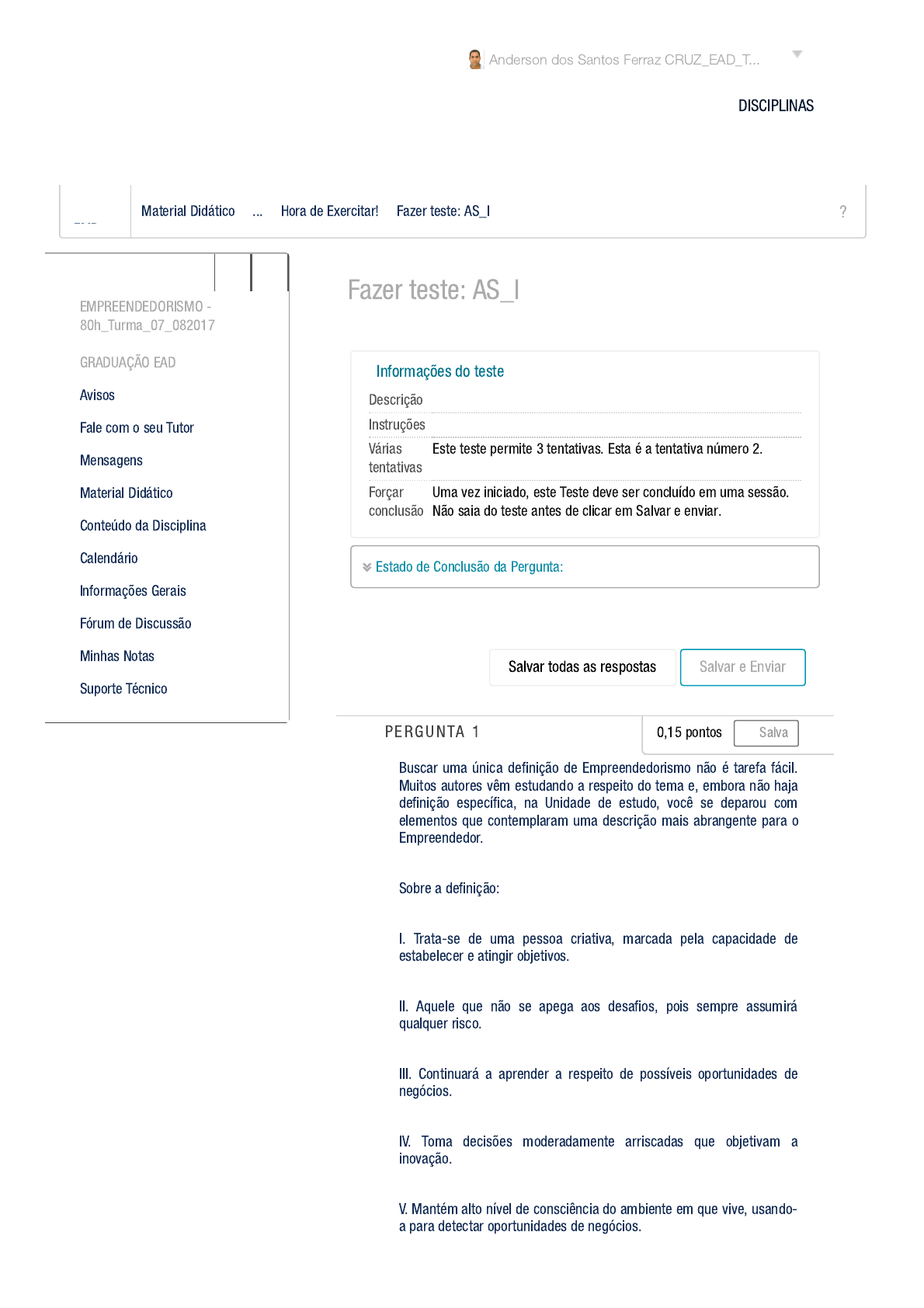 07/08/2017 Fazer teste: AS_I – EMPREENDEDORISMO - 80h_Turma_07_082017 https://bb.cruzeirodosulvirtual.com.br/webapps/assessment/take/launch.jsp?course_assessment_id=_196121_1&course_id=_498660_1&new_att… 1/4 EMPREENDEDORISMO Material Didático ... Hora de Exercitar! Fazer teste: AS_IH EMPREENDEDORISMO - 80h_Turma_07_082017 GRADUAÇÃO EAD Avisos Fale com o seu Tutor Mensagens Material Didático Conteúdo da Disciplina Calendário Informações Gerais Fórum de Discussão Minhas Notas Suporte Técnico Fazer teste: AS_I Informações do teste Descrição Instruções Várias tentativas Este teste permite 3 tentativas. Esta é a tentativa número 2. Forçar conclusão Uma vez iniciado, este Teste deve ser concluído em uma sessão. Não saia do teste antes de clicar em Salvar e enviar. Salvar todas as respostas Salvar e Enviar Buscar uma única definição de Empreendedorismo não é tarefa fácil. Muitos autores vêm estudando a respeito do tema e, embora não haja definição específica, na Unidade de estudo, você se deparou com elementos que contemplaram uma descrição mais abrangente para o Empreendedor. Sobre a definição: I. Trata-se de uma pessoa criativa, marcada pela capacidade de estabelecer e atingir objetivos. II. Aquele que não se apega aos desafios, pois sempre assumirá qualquer risco. III. Continuará a aprender a respeito de possíveis oportunidades de negócios. IV. Toma decisões moderadamente arriscadas que objetivam a inovação. V. Mantém alto nível de consciência do ambiente em que vive, usando- a para detectar oportunidades de negócios. PERGUNTA 1 0,15 pontos Salva ? Estado de Conclusão da Pergunta: H DISCIPLINAS Anderson dos Santos Ferraz CRUZ_EAD_T... Links rápidos 07/08/2017 Fazer teste: AS_I – EMPREENDEDORISMO - 80h_Turma_07_082017 https://bb.cruzeirodosulvirtual.com.br/webapps/assessment/take/launch.jsp?course_assessment_id=_196121_1&course_id=_498660_1&new_att… 2/4 Assinale a alternativa que traz o maior número de sentenças CORRETAS em relação à definição de Empreendedor: a. I, II, IV, V. b. I, II, III. c. I, IV, V. d. I, III, IV, V. e. I, III. De acordo com Dornelas (2007), não existe apenas um único tipo de empreendedor, ou um único modelo-padrão que possa ser identificado. Na obra intitulada Empreendedorismo na prática, o autor apresenta oito tipos de empreendedores: o empreendedor nato; o empreendedor que aprende; o empreendedor serial; o empreendedor corporativo; o empreendedor social; o empreendedor por necessidade; o empreendedor herdeiro; o "normal". Leia o texto a seguir e reflita sobre os Tipos de Empreendedores. João Carlos trabalhava na área administrativa e cursou faculdade de Administração de Empresas. Ao passar por uma crise na empresa, com redução das receitas, falta de pagamento de fornecedores e atrasos nos pagamentos de salários de funcionários, João é desligado da empresa. Depois de dois anos desempregado, João Carlos é contratado numa empresa de transportes, de pequeno porte. Com apenas um ano de empresa, no ano de 2007, João se depara com as mesmas situações vivenciadas no emprego anterior. Embora estivesse preocupado com a crise, resolveu identificar oportunidade para criar um negócio no ramo de alimentação e, então, decidiu pedir ao seu chefe que o incluísse na relação de funcionários que seriam demitidos. No mesmo ano, João Carlos abriu sua primeira barraca de cachorro quente em uma travessa da Avenida Paulista. E, passado apenas dez anos, ele é dono de uma das melhores redes especializadas em Dogueria de São Paulo. Fruto de sua iniciativa, ousadia, visão analítica, dedicação e profissionalismo. . Reflita sobre as características e atitudes de Henrique e assinale a alternativa que define o Tipo de Empreendedor Corporativo a que elas se referem: a. Empreendedor nato. b. Empreendedor que aprende. c. Empreendedor serial. d. Empreendedor herdeiro. e. Empreendedor corporativo. PERGUNTA 2 0,15 pontos Salva O pesquisador McClelland realizou um estudo sobre as características PERGUNTA 3 0,15 pontos Salva 07/08/2017 Fazer teste: AS_I – EMPREENDEDORISMO - 80h_Turma_07_082017 https://bb.cruzeirodosulvirtual.com.br/webapps/assessment/take/launch.jsp?course_assessment_id=_196121_1&course_id=_498660_1&new_att… 3/4 O pesquisador McClelland realizou um estudo sobre as características que o empreendedor bem sucedido deve desenvolver ou aprimorar, alocando-as em três categorias. São elas: realização; planejamento e resolução de problemas e influência (relação com as pessoas). Leia as sentenças a seguir e reflita sobre a veracidade (Verdadeira ou Falsa) das informações em relação aos Comportamentos Manifestados no que diz respeito à categoria "Realização": I. Faz as coisas antes de solicitado, ou antes, de forçado pelas circunstâncias. II. Age para expandir o negócio, criando novas áreas, produtos ou serviços. III. Aproveita oportunidades fora do comum para começar um negócio, obter financiamentos, equipamentos, terrenos, local de trabalho ou assistência. IV. Encontra maneiras de fazer as coisas melhor, mais rápidas ou mais barato. V. Age de maneira a fazer coisas que satisfazem ou excedem padrões de excelência. Os aspectos elencados nos itens I, II, III, IV e V são, RESPECTIVAMENTE: a. V, V, F, V, F. b. F, V, V, V, V. c. V, V, V, V, V. d. V, V, F, V, V. e. V, V, V, V, F. O pesquisador Dornelas (2007) apresentou os tipos de empreendedores, destacando os seguintes: o empreendedor nato; o empreendedor que aprende; o empreendedor serial; o empreendedor corporativo; o empreendedor social; o empreendedor por necessidade; o empreendedor herdeiro e o empreendedor "normal". Cada Tipo de Empreendedor, segundo o autor, tem características específicas. Leia as sentenças a seguir e reflita sobre qual é o tipo a que cada uma se refere. __________________: visionário, otimista e que está à frente de seu tempo, comprometendo-se integralmente para realizar seus sonhos.