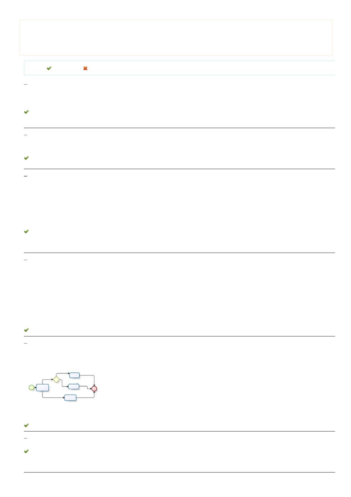 23/08/2019 UNIASSELVI - Centro Universitário Leonardo Da Vinci - Portal do Aluno - Portal do Aluno - Grupo UNIASSELVI https://portaldoalunoead.uniasselvi.com.br/ava/avaliacao/avaliacao_lista.php 1/2 Disciplina: Gestão de Projetos e Processos (EMD28) Avaliação: Avaliação II - Individual Reposição ( Cod.:466088) ( peso.:1,50) Prova Objetiva: 12514705 Nota da Prova: 10 Legenda: Resposta Certa Sua Resposta Errada 1. Segundo o Project Management Institute - PMI - o gerenciamento de projetos é a aplicação de conhecimentos, habilidades e técnicas para a execução de projetos de forma efetiva e efic uma competência estratégica para organizações, permitindo com que elas unam os resultados dos projetos com os objetivos do negócio - e, assim, melhor competir em seus mercados. D técnicas para a execução de projetos destaca-se o PMBOK, editado e reconhecido mundialmente como o principal e mais completo guia de conhecimento, em que se identificam os elem recorrentes e que suportam o gerenciamento de projetos. Além das dez áreas de conhecimento em gerenciamento, é proposto cinco grupos de processos que organizam a sequência do ge do projeto. Sobre esses cinco grupos destacados no PMBOK, assinale a alternativa CORRETA: a) Início, planejamento, gerenciamento das aquisições, gerenciamento do cronograma, encerramento. b) Início, planejamento, execução, monitoramento e controle, encerramento. c) Início, planejamento, execução, monitoramento e controle, gerenciamento das partes interessadas. d) Início, gerenciamento de escopo, gerenciamento de risco, execução, encerramento. 2. As empresas necessitam otimizar, mapear e modelar os seus processos corretamente para entregar valor aos seus clientes e, desta forma, obter vantagens competitivas. Processos são tare atividades distribuídas em um espaço de tempo que produzem resultados padronizados, possuem entradas, ferramentas e técnicas para gerar saídas. Com relação à modelagem de proces alternativa INCORRETA: a) É uma técnica desenhada para entender e descrever o processo. b) Destina-se a clarificar papéis e procedimentos. c) Destina-se especificamente a apoiar internamente a formação da liderança. d) Trata-se de um diagrama que representa a entrega de um produto, desde o pedido do cliente até a entrega propriamente dita. 3. Os processos de gerenciamento de projetos relacionados à integração entre processos, suas interações e seus objetivos, são agrupados em cinco categorias, conhecidas como grupos de p gerenciamento de projetos (ou grupos de processos). Com relação ao grupos de processos, classifique V para as sentenças verdadeiras e F para as falsas: ( ) Grupos de processos de iniciação: os processos são executados para definir um novo projeto ou uma nova fase de um projeto existente através da obtenção de autorização para inici fase. ( ) Grupos de processos de planejamento: são realizados os processos necessários para definir o escopo do projeto, refinar os objetivos e definir a linha de ação necessária para alcança para os quais o projeto foi criado. ( ) Grupos de processos de execução: os processos são realizados para executar o trabalho definido no plano de gerenciamento do projeto para satisfazer as especificações do projeto. ( ) Grupos de processos de encerramento: os processos são exigidos para acompanhar, analisar e controlar o progresso e desempenho do projeto, identificar qualquer área nas quais ser mudanças no plano e iniciar as mudanças correspondentes. Assinale a alternativa que apresenta a sequência CORRETA: a) V - V - V - F. b) F - V - F - V. c) V - F - V - F. d) F - F - V - V. 4. O MASP é um método derivado do PDCA. No entanto, o MASP apresenta muito mais ênfase na etapa do planejamento, tendo em vista a importância que o planejamento tem para o suc projetos organizacionais. O método de análise de solução de problemas é formado pelas etapas: problema, observação, análise, plano de ação, execução, verificação, padronização e con de cada etapa ainda estão presente outras subetapas. Com relação às subetapas da categoria (etapa) problema, classifique V para as opções verdadeiras e F para as falsas: ( ) Levantar a importância e a gravidade do problema. ( ) Histórico do problema. ( ) Treinar. ( ) Perdas atuais. ( ) Envolvimento da equipe. ( ) Executar a ação. Assinale a alternativa que apresenta a sequência CORRETA: a) V - V - V - F - F - F b) F - F - V - F - F - V c) F - V - F - V - V - V d) V - V - F - V - V - F 5. O BPMN é uma linguagem padrão e intuitiva utilizada para modelagem de processos e suas fases, que auxilia a estruturar e melhorar a comunicação entre setores e pessoas, ilustrando g detalhes complexos de um processo. O BPMN especifica o processo de negócio em um diagrama ou fluxo que é facilmente lido tanto por usuários técnicos (ex.: programador de pcp) qu usuários de negócios (ex.: gerente de vendas). O BPMN não é a única ferramenta de apoio ao mapeamento de processos, mas é uma das mais utilizada nas organizações. Observe a figur alguns elementos gráficos utilizados no BPMN. Sobre os elementos que aparecem na figura, assinale a alternativa CORRETA: FONTE DA IMAGEM: Disponível em: <http://netcoders.com.br/wp-content/uploads/2015/09/subprocessoexpan.png>. Acesso em: 9 ago. 2018. a) Gateways, sub-processos, eventos de início, eventos intermediários,tarefa. b) Gateways, evento de fim, evento de início, sub-processo, eventos intermediários. c) Gateways, processo, sub-processo, eventos intermediários, eventos de fim. d) Gateways, evento de início, evento de fim, tarefa, processo. 6. A ferramenta BPMN tem como um de seus objetivos criar um mecanismo gráfico, relativamente simples para modelar processos. Os elementos básicos desta ferramenta são: atividades, gateways (símbolos de decisões) e conectores. O elemento atividade está subdividido em tipos denominados: tarefa, subprocesso e processo. Com re