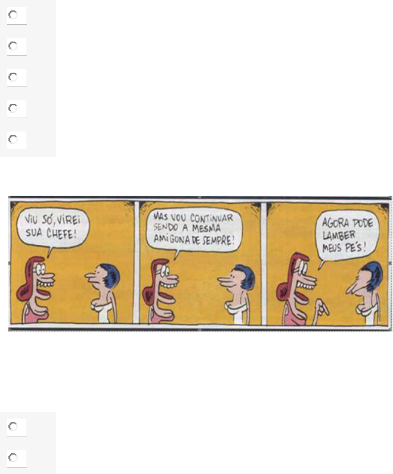 Questão 1/5 - Gestão de Pessoas e Talentos Existe uma crença comum dentro das empresas, porém inverídica, que repassa a responsabilidade do desenvolvimento das pessoas para o departamento de Recursos Humanos (RH). Considerando o contexto apresentado avalie as afirmativas a seguir: I – O RH deve ser um facilitador na apresentação e implementação de técnicas e ferramentas para o processo de desenvolvimento de pessoas, mas não é o responsável central por essa prática. II – É o gestor que tem a responsabilidade de ampliar as capacidades de cada integrante da sua equipe, bem como, direcioná-los no sentido dos objetivos organizacionais. III – A responsabilidade de gerir as pessoas não é do RH, mas do gestor de pessoas (gerente/gestor). É correto o que se afirma em: A I, apenas B I e II, apenas C I e III, apenas D III, apenas E I, II e III Questão 2/5 - Gestão de Pessoas e Talentos Analise a charge. Disponível em: http://aprendizagembypetersenge.blogspot.com.br/2010/10/quais-as-contribuicoes-de-mario-sergio.html Qual a fonte de poder é apresentada no dialogo da charge? A Poder de recompensa B Poder de autoridade C Poder de persuasão D Poder da informação E Poder do conhecimento Questão 3/5 - Administração de Conflitos e as Técnicas de Negociação Considerando a ética nos negócios, avalie as asserções a seguir e a relação proposta entre elas. Um comportamento inadequado de um de seus gestores e/ou de seus colaboradores pode colocar em risco sua credibilidade no mercado, comprometendo suas boas ações e o sucesso de seus negócios. PORQUE Uma empresa que se preocupa com a ética e a aplica em suas ações, mostra-se capaz de competir com mais sucesso, consegue excelentes resultados em seus negócios, além da satisfação, da motivação e o respeito dos seus colaboradores. A respeito dessas asserções, assinale a opção correta. A A assertiva I é verdadeira e a assertiva II é falsa. B A assertiva I é falsa e a assertiva II é verdadeira. C As assertivas I e II são proposições excludentes. D A assertiva II justifica e complementa a assertiva I. E A assertiva II contraria a ideia expressa na assertiva I. Questão 4/5 - Administração de Conflitos e as Técnicas de Negociação O cenário acelerado de mudanças e a alta competitividade no mercado, provocados pela globalização, impuseram às organizações novos desafios para sua sobrevivência. Nesse contexto, a concorrência e as dificuldades econômicas e financeiras estimularam a perda de posturas éticas nas negociações organizacionais. A respeito da ética é possível afirmar que: A A ética deve ser entendida como ameaça ou obstáculo para o sucesso das organizações, pois dificulta o processo de negociação. B É impossível crescer com ética, agir de forma honesta com todos os envolvidos em suas negociações, pois acabará falindo. C Ter padrões éticos significa ter futuro no mercado profissional, com parceiros e clientes fiéis e de longo prazo. D A ética nas organizações não reproduz o comportamento de seus gestores e das posturas e ações de seus colaboradores. E Ética e negócios são termos excludentes, tendo em vista que é impossível a empresa crescer respeitando princípios éticos. Questão 5/5 - Gestão de Pessoas e Talentos Uma empresa é composta essencialmente por pessoas, e estas devem ser balizadas por sua cultura organizacional que, por sua vez, consiste nas crenças, valores, regras de conduta, morais e éticas, e ainda em princípios e políticas de gestão implantadas pela organização. Estes elementos evidenciam a importância da cultura organizacional de uma empresa como o alicerce de suas ações e práticas de gestão de pessoas e resultados. Toda empresa, seja qual for seu tamanho, tem sua política organizacional, e ainda que ela não seja clara, é a partir desta cultura que os colaboradores são orientados para a realização de suas tarefas. Disponível em: http://www.ibccoaching.com.br/portal/rh-gestao-pessoas/importancia-cultura-organizacional-empresa/ Considerando esse contexto, avalie as afirmativas a seguir: I – A cultura organizacional propõe uma concepção própria sobre o trabalho e toda vez que há um distanciamento do que a empresa quer com que as pessoas pensam tem um clima de estranhamento. II – O desalinhamento organizacional é comum e, apesar de cada um ser portador de uma concepção própria, a resolução desse impasse geralmente é o convite para que reforcem esse desalinhamento. III - Os gestores precisam ser hábeis em não permitir a existências de desalinhamentos, pois devem ignorar as concepções individuais para reforçar a identidade organizacional. É correto o que se afirma em: A I, apenas B I e II, apenas C I e III, apenas D III, apenas E I, II e III