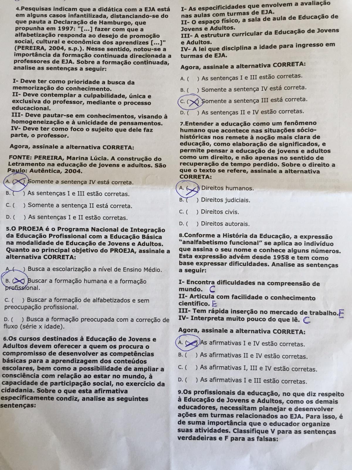 5.0 PROEJA e Programa Nacional de Integragao da Educacao Profissional com a Educacao Basica na modalidade de Educagao de Jovens e Adultos. Quanto ao principal objetivo do PROEJA, assinale a alternativa CORRETA: Analise as sentengas a seguir: I- Encontra dificuldades na compreensao de mundo. II- Articula com facilidade conhecimento cientifico. III- Tem rapida insercao no mercado de trabalho. IV- Interpreta muito pouco do que le. A. Busca a escolarizagao a nivel de Ensino Medio. B. Buscar a formacao humana e a formacao profissfonal. C. Buscar a formacao de alfabetizados e sem preocupacao profissional. D. Busca a formacao preocupada com a corregao de fluxo (serie idade).