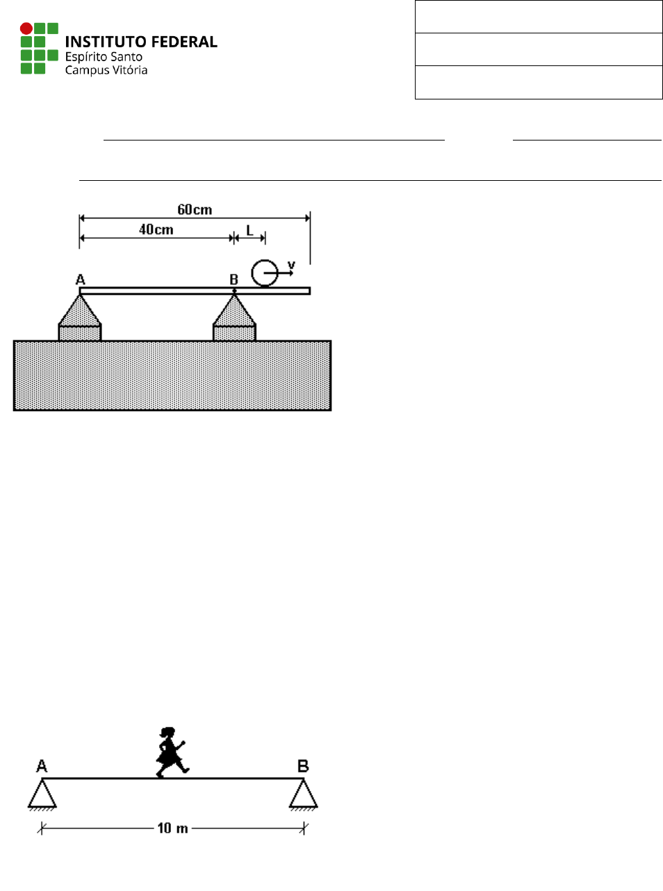 Data: 27/08/2018 Nota: Valor da Prova: 12,5 Professor(a): Aline Costalonga Gama Turma: M09 Aluno(a): 1. Uma esfera de peso 20,0N rola sobre uma viga homogênea e horizontal, de seção reta uniforme, que está apoiada em A e articulada, sem atrito, em B. O peso da viga é 10,0N e seu comprimento, 60cm. Qual a distância L do ponto de contato da esfera com viga ao ponto B, no instante em que a viga está na iminência de entrar em movimento? 2. Uma menina de 50 kg caminha sobre uma prancha com 10m de comprimento e 10kg de massa. A prancha está apoiada em suas extremidades, nos pontos A e B, como mostra a figura. No instante em que a força normal em B é igual ao dobro da normal em A, a que distância, em METROS, a menina se encontra do ponto B? 3. A figura mostra, em corte, um trator florestal “derrubador - amontoador” de massa 13000 kg; x é a abscissa de seu centro de gravidade (CG). A distância entre seus eixos, traseiro e dianteiro, é DE 2,5 m. Admita que 55% do peso total do trator são exercidos sobre os pontos de contato dos pneus dianteiros com o solo (2) e o restante sobre os pontos de contato dos pneus traseiros com o solo (1). Determine a abscissa x do centro de gravidade desse trator, em relação ao ponto 1. Adote 2g 10 m / s e dê a resposta com dois algarismos significativos. 4. Na figura, temos uma barra homogênea de espessura e largura pequenas e uniformes, em forma de L, articulada sem atrito em A. A parte vertical da barra tem 1,0 m de comprimento, enquanto a parte horizontal mede 3,0 m. Sendo de 120 N o peso total da barra, calcule a intensidade da força horizontal F, que mantém a barra em equilíbrio. 5. A figura apresenta uma barra homogênea, delgada, de peso 200N e comprimento "ℓ". Essa barra está presa a uma parede vertical através de uma articulação. Está também sustentada, em repouso, através de uma corda submetida a uma tensão T que forma um ângulo θ = 30° com a vertical. Qual o módulo de tensão sobre a corda? 6. No arranjo da figura a seguir, uma barra rígida AC, de peso desprezível apoiada numa estaca fixa vertical em B, sustenta um peso P = 80 3 N. Conhecidas as distâncias AC = 80 cm, BC = 30 cm e estando o sistema em equilíbrio estático, calcule o módulo: a) da reação da estaca na barra em B; b) das componentes horizontal e vertical da reação de A na barra AC. 7. Uma escada homogênea de 40 kg apoia-se sobre uma parede, no ponto P, e sobre o chão, no ponto C. É possível manter a escada estacionária não havendo atrito em P. Neste caso, quais os valores das forças normal e de atrito em C? 8. Chapas retangulares rígidas, iguais e homogêneas, são sobrepostas e deslocadas entre si, formando um conjunto que se apoia parcialmente na borda de uma calçada. A figura ilustra esse conjunto com n chapas, bem como a distância D alcançada pela sua parte suspensa. Desenvolva uma fórmula geral da máxima distância D possível de modo que o conjunto ainda se mantenha em equilíbrio. A seguir, calcule essa distância D em função do comprimento L de cada chapa, para n = 6 unidades.