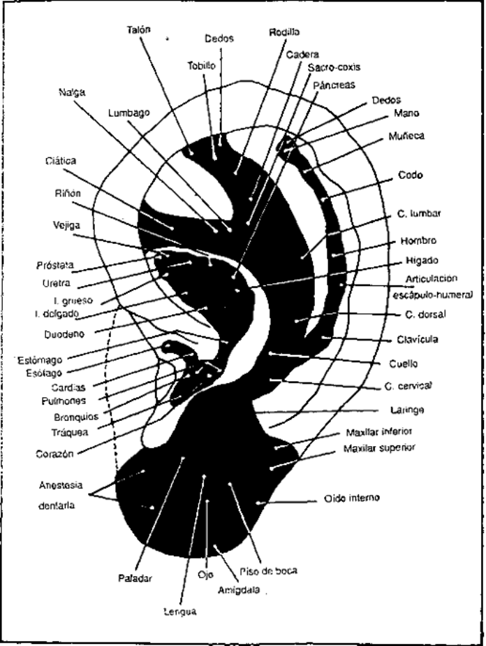 1 MANUAL DE AURICULOTERAPIA CON UN APENDICE DE AURICULO- LASERTERAPIA RECONOCIMIENTO No puedo dejar de expresar mi agradecimiento al Ingeniero CARLOS D. RUEDA por su colaboración con el capítulo “Algunas consideraciones sobre LASER.” PROLOGO El interés despertado entre los concurrentes, médicos y kine- siólogos, por mi trabajo “Algunas consideraciones sobre Auriculoterapia” presentado en el “2º Congreso Hispano- Americano de Acupuntura”, desarrollado en Buenos Aires, República Argentina en noviembre de 1986, y que contó con la presencia de distinguidos profesionales de esta rama de la medicina, hizo nacer en mí la idea de divulgar mis estudios y experiencias con la intención de llenar un vacío existente sobre el tema. Desde entonces publiqué varios trabajos en distintos medios de difusión, y éstos, a su vez, me acercaron a numerosos profesionales interesados en mis cursos sobre esta “nueva especialidad”. Esta relación me hizo ver con más claridad cuáles eran las dificultades que tenían los estudiosos para su mejor ejercicio y comprensión. Y me atrevo a llamarla así, “nueva especialidad”, porque no me cabe la menor duda de que sólo se la usaba como complemen- to de la Acupuntura, —subestimándola como tratamiento de fondo—, cuando, en realidad, su mérito mayor es su eficacia como método terapéutico, sin desconocer, por cierto, los de su ciencia madre, la Acupuntura. Comprendí así que, a pesar de la existencia de algunos libros publicados —muy meritorios—, no había en ellos la seguridad que dan la experiencia personal y el deseo de enseñar. El análisis de éstos me llevó a concebir la clasificación —per- sonal— de los puntos auriculares en las cuatro categorías que explico en el texto, y que fueron esbozados en el Congreso y en las publicaciones que menciono más arriba. Fueron precisamente estos análisis y la confianza que se iba acrecentando en mí por la bondad de los resultados, los que me llevaron, poco a poco, a atender a mis pacientes sistemática y exclusivamente con Auriculoterapia. 2 Quiero poner énfasis en que esta clasificación de los puntos auriculares significa un recurso importante encaminado a orientar el pensamiento del médico tratante. Además, los gráficos presentados de los distintos aparatos y sistemas — también personales— son una ayuda igualmente valiosa para el tratamiento de los distintos síndromes. Con la seguridad de que es un aporte importante para quien se interese en el tema, pongo este “Manual de Auriculoterapia” a la consideración de mis colegas médicos. El Autor. INTRODUCCION Hace varios años viví una experiencia insólita, inédita. Marcó un jalón decisivo que me impulsó a intensificar los tratamientos con auriculopuntura que había iniciado, tímidamente, algunos meses atrás. Había observado que pacientes, en los que no obtenía mayo- res beneficios con acupuntura, mejoraban rápida y sorpresiva- mente si implantaba las agujas en las orejas siguiendo la técnica de uno de mis libros de estudio sobre el tema. Atendí en aquella oportunidad a una mujer de mediana edad que presentaba frondosa sintomatología. Se quejaba de intensos dolores y parestesias en el miembro superior derecho, con disminución de la movilidad del mismo, principalmente de la muñeca. Tenía colocado en la cara palmar de ésta un aparato de yeso sujeto por una muñequera, con el único objeto de impedir los movimientos de la mano por el intenso dolor que provocaban. Al examinarla comprobé que la movilidad del cuello hacia la derecha estaba disminuida en unos 30 o 35 grados, a lo que la enferma no le asignaba mayor importancia porque sólo le provocaba mínimas molestias. Completaban el cuadro dolores en la región supraclavicular y parte alta del dorso. Los tratamientos médicos tuvieron resultado negativo, por lo que le aconsejaron la intervención quirúrgica pero, no aceptó porque tenía fecha para viajar y radicarse en el exterior a los pocos días. Se trataba, posiblemente, de un síndrome del túnel carpiano; no pude afirmarlo en ese momento porque no tenía en su poder los exámenes complementarios correspondientes. Todos sabemos que, en su pasaje por la muñeca, el nervio mediano está envuelto y protegido por un tejido fibroso denso que le forma un verdadero túnel que lleva el nombre del nervio que lo recorre, y, distintos procesos que comprimen al nervio en el mismo dan la sintomatología característica y por todos conocida. Ya había iniciado —repito— mi práctica con Auriculoterapia. Podía tratar individualmente cada región afectada: hombro, muñeca, etc. pero, cómo haría para devolver la movilidad al cuello, aunque no molestara a mi paciente? Indudablemente había que pensar en una causa común. No encontraba otra explicación que una compresión a nivel del origen del nervio en la red nerviosa del cuello (plexo braquial), o de las raíces a la salida de los agujeros de conjunción; y no a nivel del túnel carpiano. Decidí iniciar el tratamiento en el cuello y no en la muñeca co- mo le habían propuesto a mi paciente. No encontré manera más simple e inocua que punturando las orejas en los puntos correspondientes. Los más indicados eran el 37 (columna cervical) y 41 (cuello). Ver, Aparato Locomotor, Cervicobraquialgias. (Pág. 105) La respuesta fue espectacular. Le pedí que volviera a girar la cabeza y lo hizo, ahora, con la máxima amplitud en todas direcciones. También pudo mover fácil, libremente y sin dolor hombro y codo. Habían desaparecido, incluso, —para mi sorpresa— los dolores supraclaviculares y del dorso. Le pedí que se sacara el aparato de fijación de la muñeca. Empezó a mover la mano en todas direcciones sin la menor molestia. Había obtenido el 100% de mejoría de la manera más sencilla, con unas pocas agujas y en algunos segundos. A las 24 horas había perdido el 20 ó el 30% de lo ganado. Le practiqué la segunda aplicación obteniendo nuevam