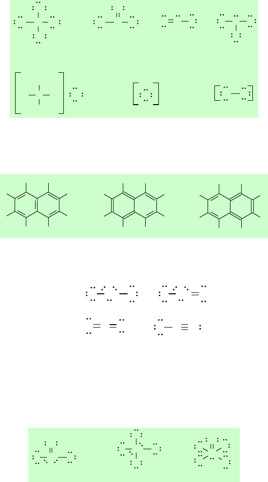 Universidade Federal do Rio de Janeiro Instituto de Química Departamento de Química Inorgânica Disciplina: Química Geral I – IQG 111 1) Escreva a estrutura de Lewis de: (a) CCl4; (b) CCl2O; (c) ONF; (d) NF3; (e) cloreto de amônio; (f) fosfeto de potássio; (g) hipoclorito de sódio. C Cl Cl Cl Cl C ClCl O O N F N FF F N HH H H Cl - 3 K + P 3- Na+ Cl O - 2) O naftaleno tem fórmula C10H8. É similar ao benzeno, mas tem dois anéis de seis membros que compartilham uma ligação C-C. A conectividade é mostrada abaixo. Complete a estrutura desenhando as ligações múltiplas que satisfaçam a regra do octeto para cada átomo de carbono. Estruturas de ressonância são possíveis. Desenhem tantas quantas você possa encontrar. H H H H H H H H H H H H H H H H H H H H H H H H 3) Selecione de cada um dos seguintes pares de estruturas de Lewis, aquela que é mais favorável para fazer a contribuição dominante para o híbrido de ressonância. Explique a sua seleção. a) F Xe F F Xe F b) C OO C OO (a) As cargas formais em Xe e F são 0 na primeira estrutura; na segunda estrutura, Xe tem -1, um F é igual a 0 e outro F é igual a +1. A primeira estrutura é favorecida pelas cargas formais. (b) Na primeira estrutura, todos os átomos têm cargas formais 0; na segunda, um oxigênio tem uma carga formal de +1 e outro de -1. A primeira estrutura é preferida. 4) Escreva a estrutura de Lewis e dê o número de pares isolados sobre o xenônio, o átomo central, dos seguintes compostos: (a) XeOF2; (b) XeF4; (c) XeOF4. Xe FF O 2 pares isolados XeF F F F Xe O F F F F 2 pares isolados 1 pares isolados 5) Para cada par, determine qual composto tem ligações com maior caráter iônico: (a) HCl ou HI; (b) CH4 ou CF4; (c) CO2 ou CS2. (a) HCl; (b) CF4; (c) CO2. 6) Nitrogênio, fósforo, oxigênio e enxofre existem como N2, P4 tetraédrico, O2 e moléculas cíclicas de S8. Racionalize em termos das habilidades dos átomos de formar diferentes tipos de ligações. Tanto P como S tem um átomo grande que é menos capaz de formar ligações múltiplas com outro átomo do mesmo tipo, diferente dos átomos pequenos N e O. Todas as ligações em P4 e S8 são ligações simples, enquanto que N2 tem uma ligação tripla e O2 uma ligação dupla. 7) (a) Qual é a forma da molécula de clorofórmio, CHCl3? (b) Quantos ângulos de ligação H-C-Cl diferentes existem nesta molécula? (c) Quais os valores esperados para os ângulos da ligação H-C-Cl? (a) tetraédrica; (b) uma; (c) 109,5o. 8) (a) Qual é a forma do íon nitrônio, NO2+? (b) Qual é o ângulo de ligação O-N-O? (a) linear; (b) 180o. 9) (a) Qual é a forma do íon carbonato, CO32-? (b) Quantos ângulos diferentes O-C-O existem nesta molécula? (c) Quais são os valores esperados para os ângulos O-C-O? (a) trigonal planar; (b) uma; (c) 120o. 10) Utilizando as estruturas de Lewis e a teoria RPECV, preveja a forma de cada uma das seguintes espécies: (a) tetracloreto de enxofre; (b) tricloreto de iodo; (c) IF4 -; (d) trióxido de xenônio. Dê a designação AXnEm do modelo RPECV em cada caso. Desenhe as formas estruturais. (a) gangorra, AX4E; (b) forma T, AX3E2; (c) quadrado planar, AX4E2; (d) pirâmide trigonal, AX3E. 11) Preveja a forma molecular e os ângulos de ligação para cada um dos seguintes casos: (a) I3-; (b) IF3; (c) IO4 -; (d) TeF6. Dê a designação AXnEm do modelo RPECV em cada caso. Desenhe as formas estruturais. (a) linear, 180o, AX2E3; (b) forma T, duas a 90 o e uma a 180o, AX3E2; (c) tetraédrica, 109,5 o, AX4; (d) octaédrica, 90o e 180o, AX6. 12) Escreva as estruturas de Lewis e a fórmula RPECV, indicando a forma, e preveja aproximadamente os ângulos de ligação para (a) CF3Cl; (b) GaI3; (c) XeOF4; (d) CH3 -. Dê a designação AXnEm do modelo RPECV em cada caso. (a) tetraédrica, todos os ângulos de ligação = 109,5o, AX4; (b) trigonal planar, ângulos de ligação de aproximadamente 120o, AX3; (c) pirâmide quadrada, O-Xe-F com ângulos de 90 o e F-Xe-F com ângulos de 90o e 180o, AX5E; (d) pirâmide trigonal, ângulos um pouco menores que 109,5 o, AX3E. 13) Escreva as estruturas de Lewis e preveja se as seguintes moléculas são polares ou apolares (não polares): (a) CH2Cl2; (b) CCl4; (c) CS2; (d) SF4. As moléculas (a) e (d) serão polares e (b) e (c) serão apolares. 14) Muitas moléculas orgânicas são apolares ou fracamente polares. Preveja se as seguintes moléculas se comportam como polares ou apolares: (a) C6H6 (benzeno); (b) CH3OH (metanol); (c) H2CO (formaldeído, utilizado em soluções aquosas para preservar espécies biológicas). (a) apolar; (b) polar; (c) polar. 15) Dê as orientações relativas dos seguintes orbitais: (a) sp3; (b) sp; (c) sp3d2; (d) sp2. (a) 109,5o; (b) 180o; (c) 90o e 180o; (d) 120o. 16) As orientações relativas das ligações ao átomo central de uma molécula que não possui pares isolados de elétrons podem ser qualquer uma das listadas a seguir. Qual é a hibridização dos orbitais utilizadas por cada átomo central para seus pares de ligação: (a) tetraédrica; (b) bipirâmide trigonal; (c) octaédrica; (d) linear? 17) Dê a hibridização do átomo em negrito das seguintes moléculas: (a) SF4; (b) BCl3; (c) NH3; (d) (CH3)2Be. Dica: pares isolados ocupam orbitais híbridos de maneira muito similar aos elétrons ligantes. (a) sp3d; (b) sp2; (c) sp3; (d) sp. 18) Identifique os tipos de forças intermoleculares que possam surgir entre as moléculas das seguintes substâncias: (a) Cl2; (b) HCl; (c) C6H6; (d) C6H5Cl. (a) Forças de London; (b) forças dipolo-dipolo, forças de London; (c) forças de London; (d) forças dipolo-dipolo, forças de London. 19) Para quais das seguintes moléculas as interações dipolo-dipolo serão importantes: (a) CH4; (b) CH3Cl; (c) CH2Cl2, (d) CHCl3, (e) CCl4. (b), (c) e (d). 20) Quais das seguintes moléculas provavelmente formam ligações de hidrogênio: (a) HF; (b) CH4; (c) NH3; (d) CH3OH. (a); (c); (d). 21) Sugira, dando razões, qual substân