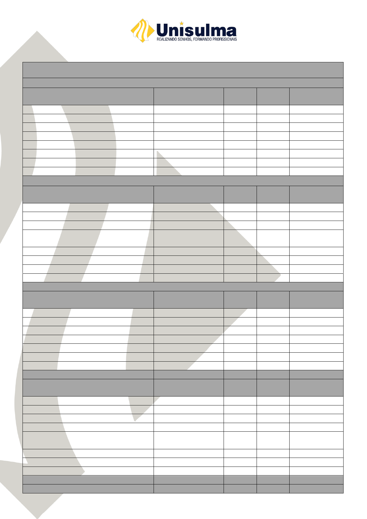 MATRIZ CURRICULAR DO CURSO DE ESTÉTICA E COSMÉTICA IESMA/UNISULMA 1º Período Disciplinas Carga Horária Semanal Teórica Prática Carga Horária Total Bases Químicas 2 18 18 36 Anatomia Aplicada á Estética 4 36 36 72 Biossegurança, Bioética e Legislação 4 72 72 Imagem Pessoal 2 36 36 Introdução a Estética e Cosmética 4 72 72 Metodlogia Científica 2 36 36 Bases Biológicas 4 54 18 72 22 324 72 396 2º Período Disciplinas Carga Horária Semanal Teórica Prática Carga Horária Total Bioquímica 4 36 36 72 Fisiologia 4 54 18 72 Primeiros Socorros 2 18 18 36 Fundamentos de Microbiologia e Imunologia 4 36 36 72 Patologia Aplicada a Estética 4 36 36 72 Visagismo e Maquiagem I 4 36 36 72 Nutrição Estética 2 36 36 24 252 180 432 3º Período Disciplinas Carga Horária Semanal Teórica Prática Carga Horária Total Eletroestética 4 36 36 72 Técnicas de Massagem I 4 36 36 72 Cosmética I 4 36 36 72 Estética Facial I 4 36 36 72 Estética Corporal I 4 36 36 72 Visagismo e Maquiagem II 4 36 36 72 24 216 216 432 4º Período Disciplinas Carga Horária Semanal Teórica Prática Carga Horária Total Técnicas de Massagem II 4 36 36 72 Cosmética II 4 36 36 72 Estética Facial II 4 36 36 72 Estética Corporal II 4 36 36 72 Terapias Alternativas e Técnicas de Spa 4 36 36 72 Trabalho de Conclusão de Curso I 2 36 36 Estética para Gestante 2 36 36 24 252 180 432 5º Período Disciplinas Carga Horária Teórica Prática Carga Semanal Horária Total Administração e Marketing 4 72 72 Tricologia e Estética Capilar I 4 36 36 72 Protocolos de Tratamento em Estética e Cosmética 4 36 36 72 Fitocosmetologia e Aromaterapia 4 72 72 Técnicas no Pré e Pós Operatório 4 36 36 72 Optativa I 2 36 36 Estágio Supervisionado 100 22 288 108 496 6º Período Disciplinas Carga Horária Semanal Teórica Prática Carga Horária Total Tricologia e Estética Capilar II 2 36 36 Técnicas Complementares em Estética 4 36 36 72 Empreendedorismo 2 36 36 Gestão de Pessoas e Psicologia Organizacional 4 72 72 Trabalho de Conclusão de Curso II 2 36 36 Optativa II 2 36 36 Estágio Supervisionado 100 16 252 36 388 Atividades Complementares 100 Carga Horária Total Do Curso 2676